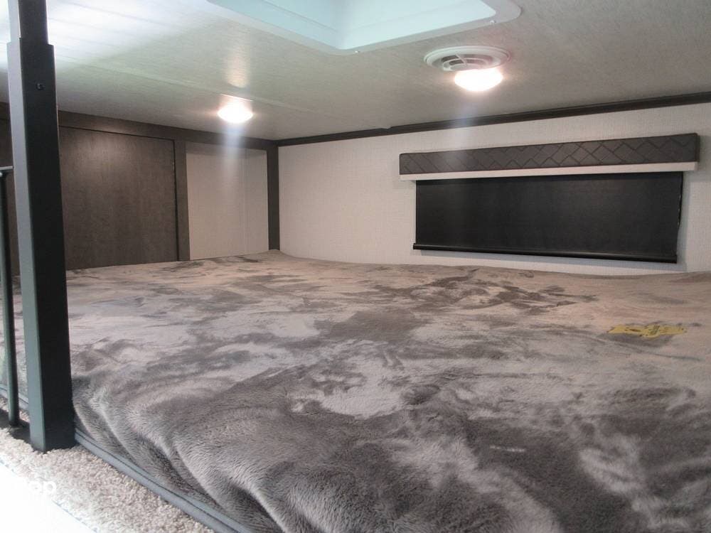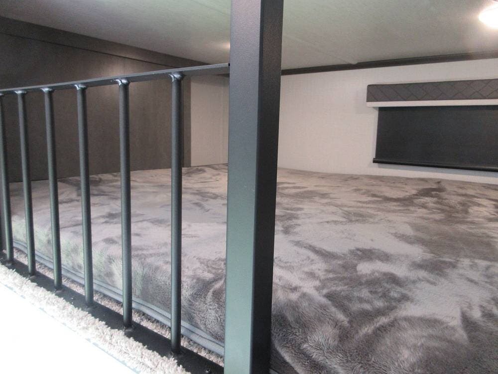 The mid-bunk room provides a second bedroom or office if you work on the go! It has a sleeper sofa that quickly converts into another sleeping area, and the loft bed above the bedroom/office is yet another sleeping area.