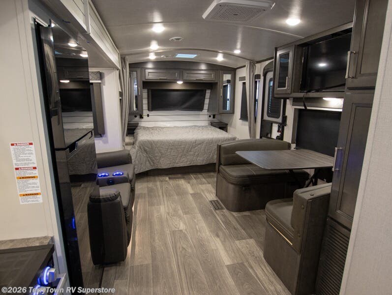 With a king-size bed, this Cougar Half-Ton travel trailer shows that you can still be comfortable even while you're away from home! The bed has wardrobes and nightstands on either side to keep your belongings tidy. There is a convenient shoe cubby right as you enter the unit to keep this space picked up as well. Right next to the booth dinette is the pantry, and next to the pantry is the full bathroom which is certainly one of the most valuable features to any trailer.