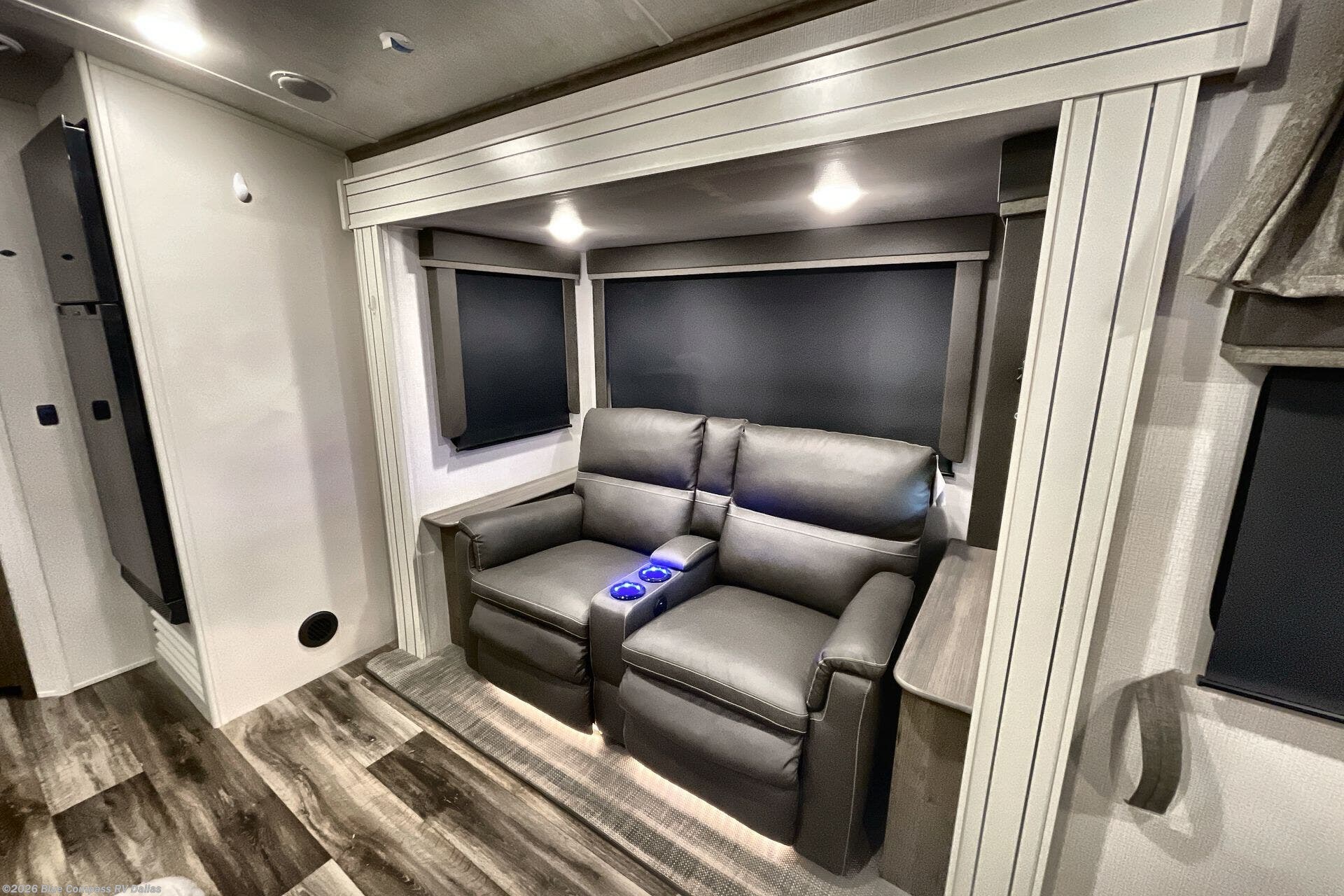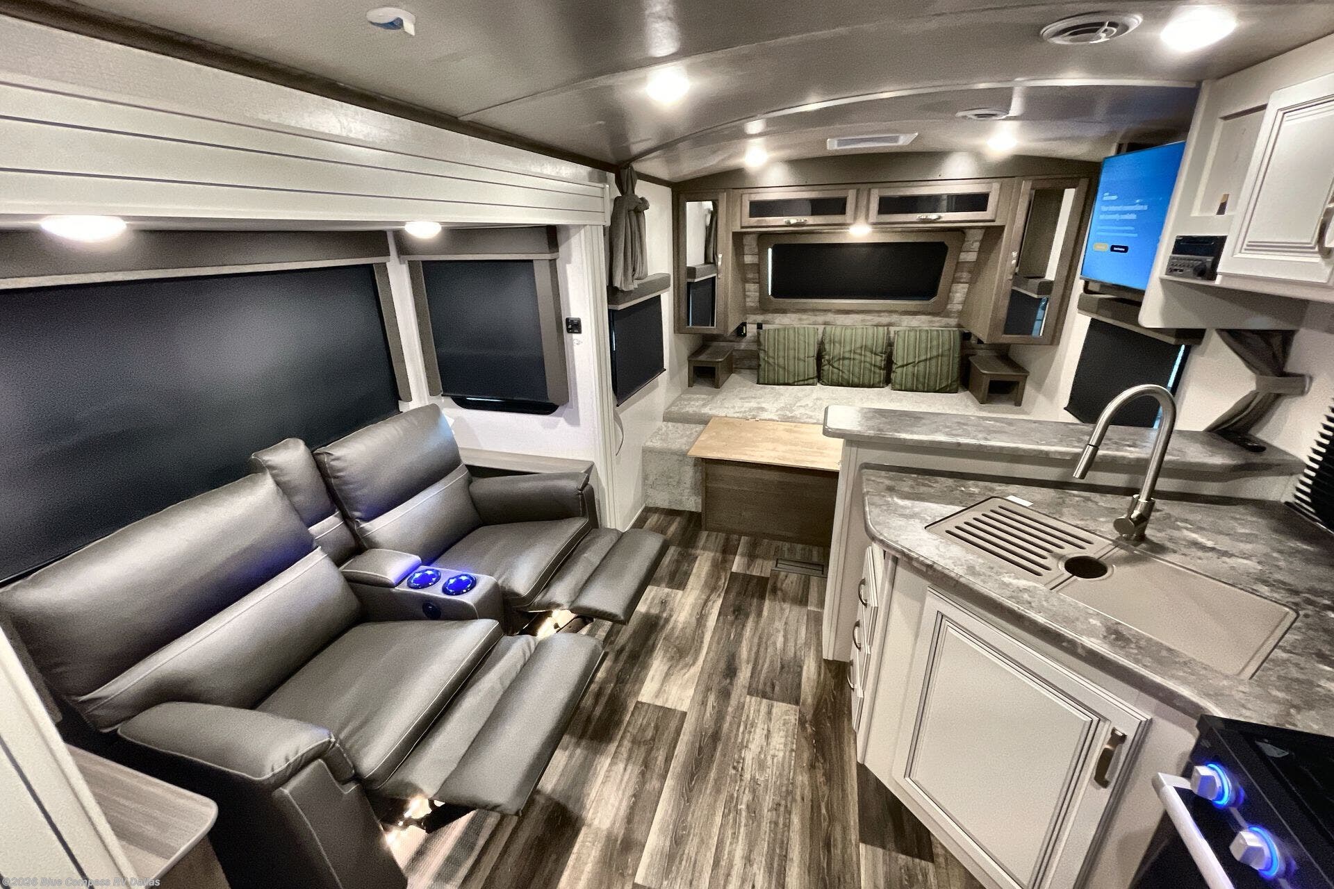 Imagine waking up from your own king bed to enjoy a hike, a bike ride, or a relaxing time outside under the 16' power awning while you wait for your spouse to wake up. With this Cougar Half-Ton travel trailer, you can make breakfast inside with full amenities and eat at the U-shaped dinette while looking out at the views. There is even a bar top where you can set out more snacks and have more prep space. The front bedroom includes a king bed, dual wardrobes and dual nightstands, plus a TV for movie night.