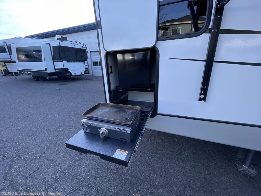 If you are looking for a fifth wheel that sleeps four to six with inside and outside cooking then check this unit out! This unit offers a short, mid-living layout with a bedroom wardrobe slide and combined 12 volt refrigerator and 68" tri-fold sofa sleeper slide for added floorspace to move about. Up front, you will enjoy a private bedroom with a queen bed and bedside wardrobe/nightstands as well as a larger wardrobe that slides out along the curbside wall. A complete bath provides a large shower, toilet and sink, plus linen storage which you are sure to appreciate as you travel. There are plenty of options for this unit making it easy to customize to your use and style. The theater seating and free standing dinette options can be selected in place of the sleeper sofa and booth dinette if you prefer. If you enjoy spending time outdoors, imagine making breakfast for your friends and family using the outside griddle. There is also a 16' awning to create even more living space to enjoy, and the unobstructed pass-through storage compartment can easily house all of your outdoor camping gear like lawn chairs and yard games.