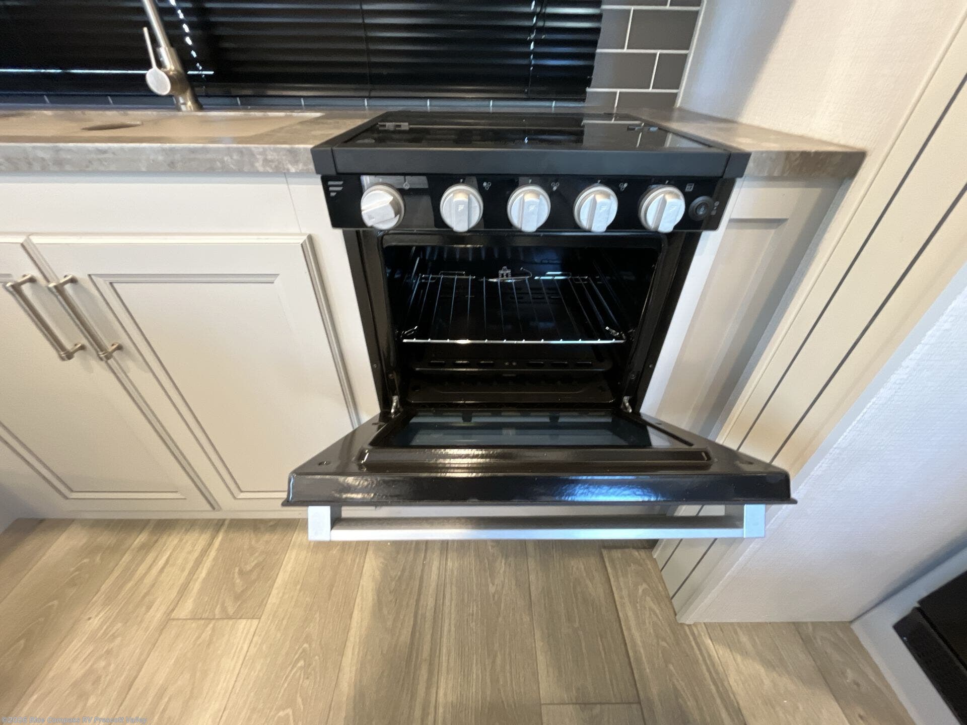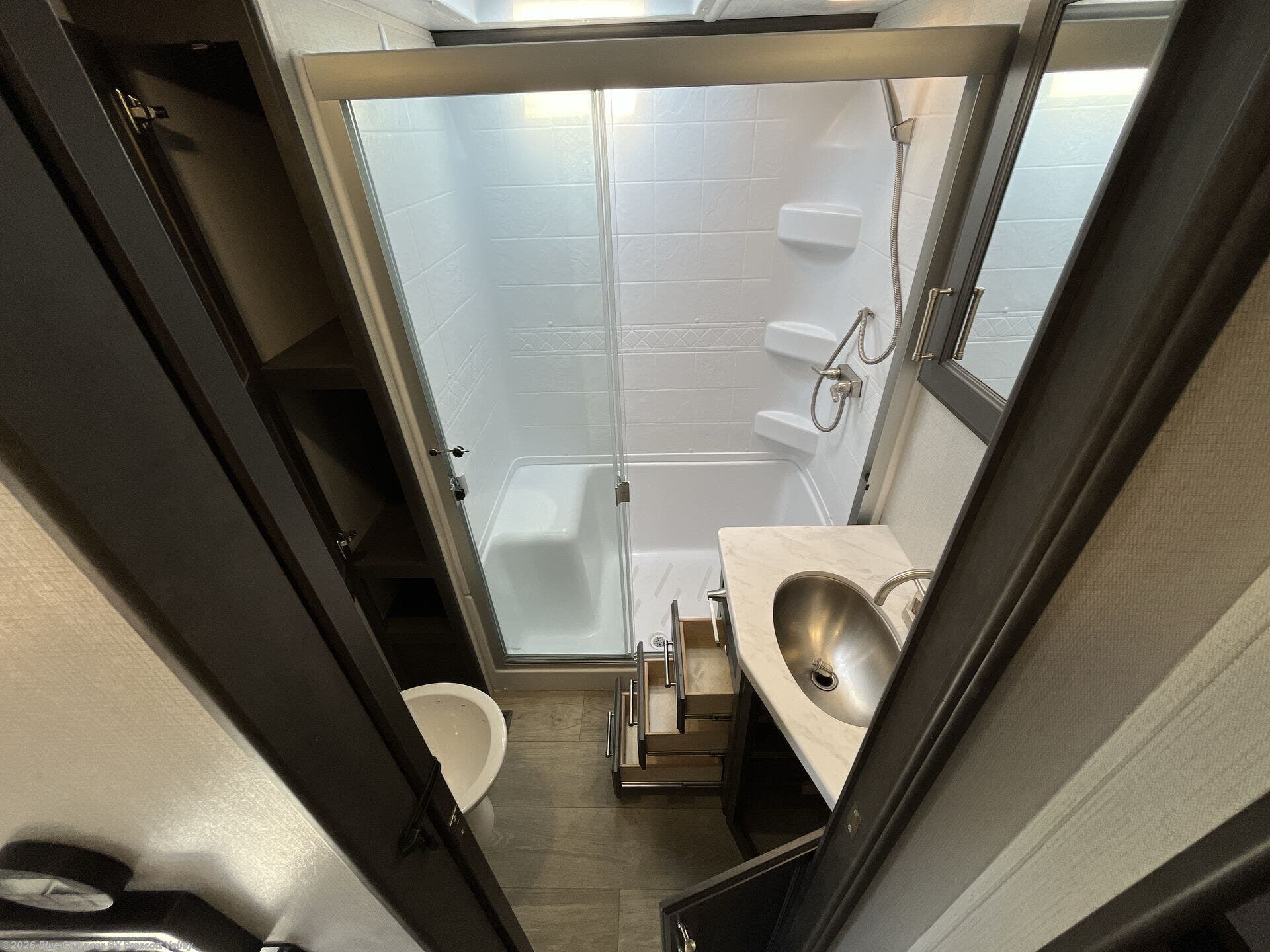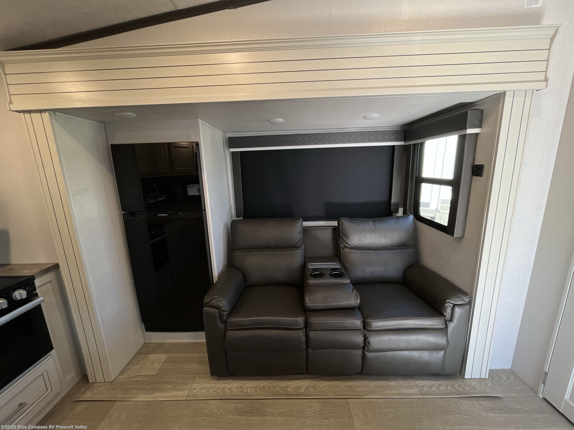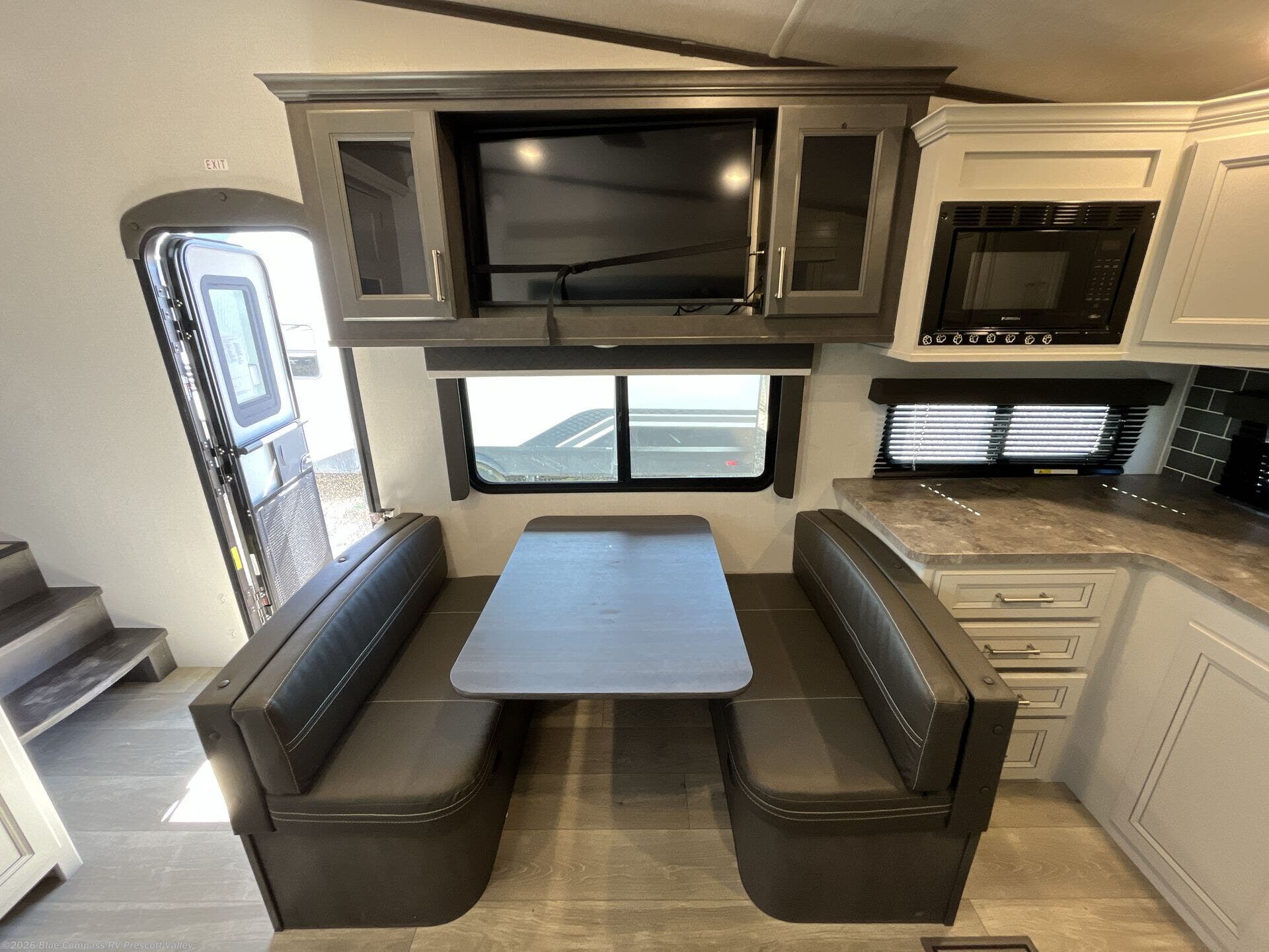If you are looking for a fifth wheel that sleeps four to six with inside and outside cooking then check this unit out! This unit offers a short, mid-living layout with a bedroom wardrobe slide and combined 12 volt refrigerator and 68" tri-fold sofa sleeper slide for added floorspace to move about. Up front, you will enjoy a private bedroom with a queen bed and bedside wardrobe/nightstands as well as a larger wardrobe that slides out along the curbside wall. A complete bath provides a large shower, toilet and sink, plus linen storage which you are sure to appreciate as you travel. There are plenty of options for this unit making it easy to customize to your use and style. The theater seating and free standing dinette options can be selected in place of the sleeper sofa and booth dinette if you prefer. If you enjoy spending time outdoors, imagine making breakfast for your friends and family using the outside griddle. There is also a 16' awning to create even more living space to enjoy, and the unobstructed pass-through storage compartment can easily house all of your outdoor camping gear like lawn chairs and yard games.