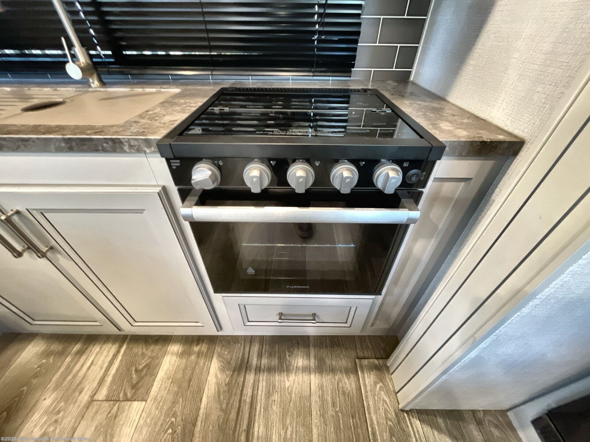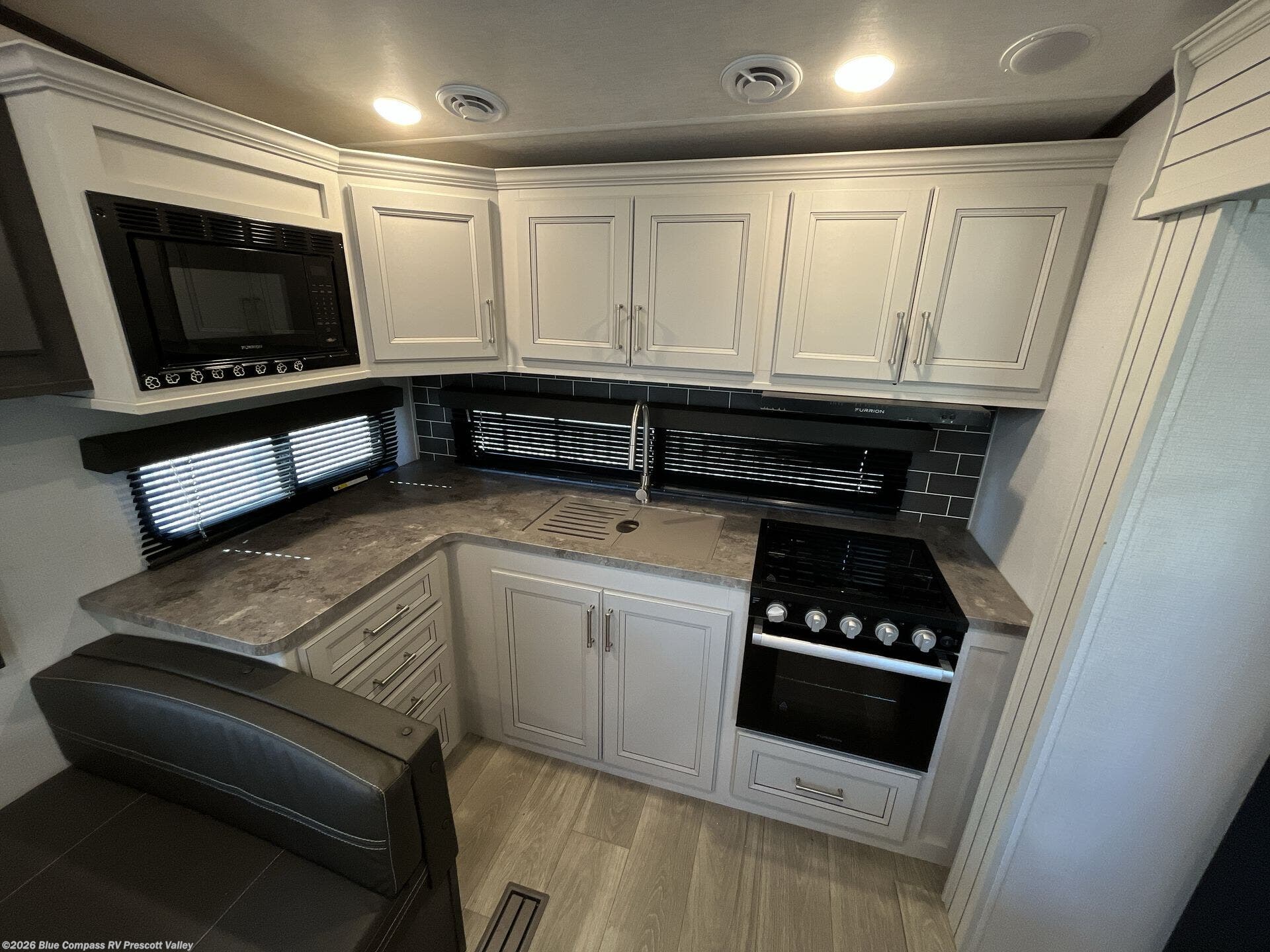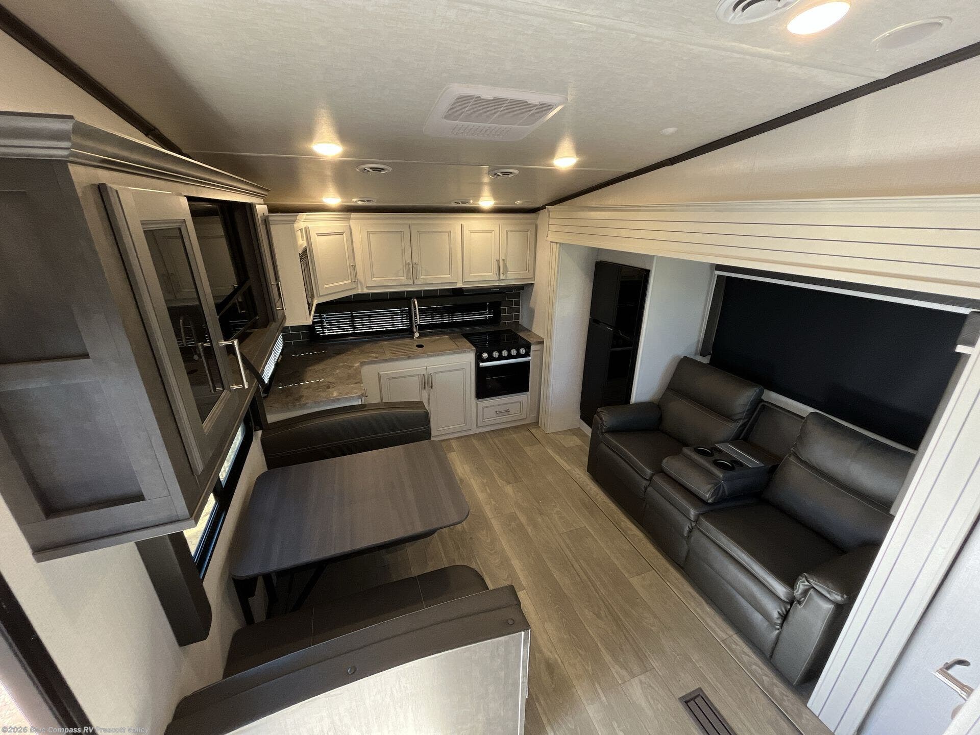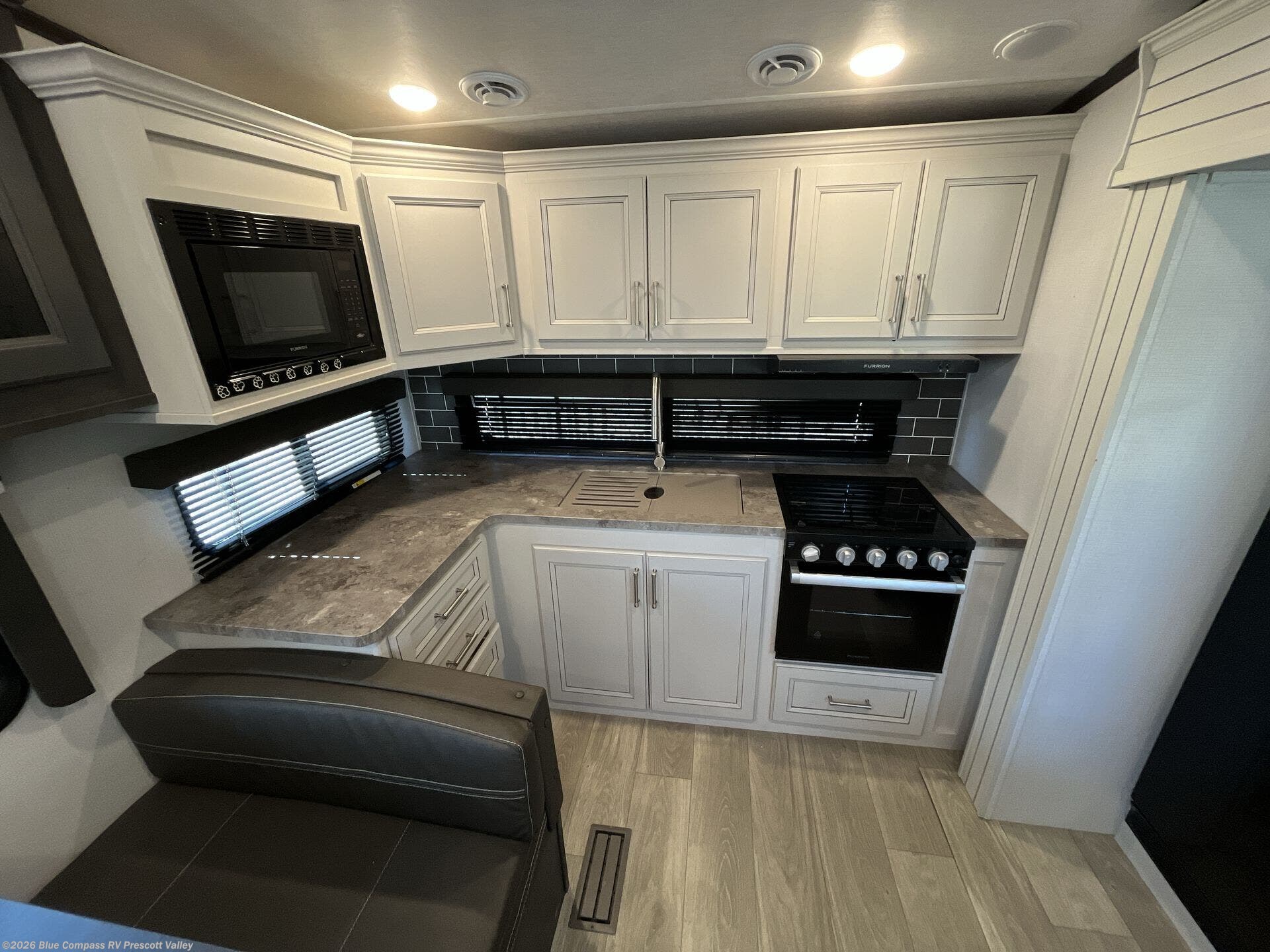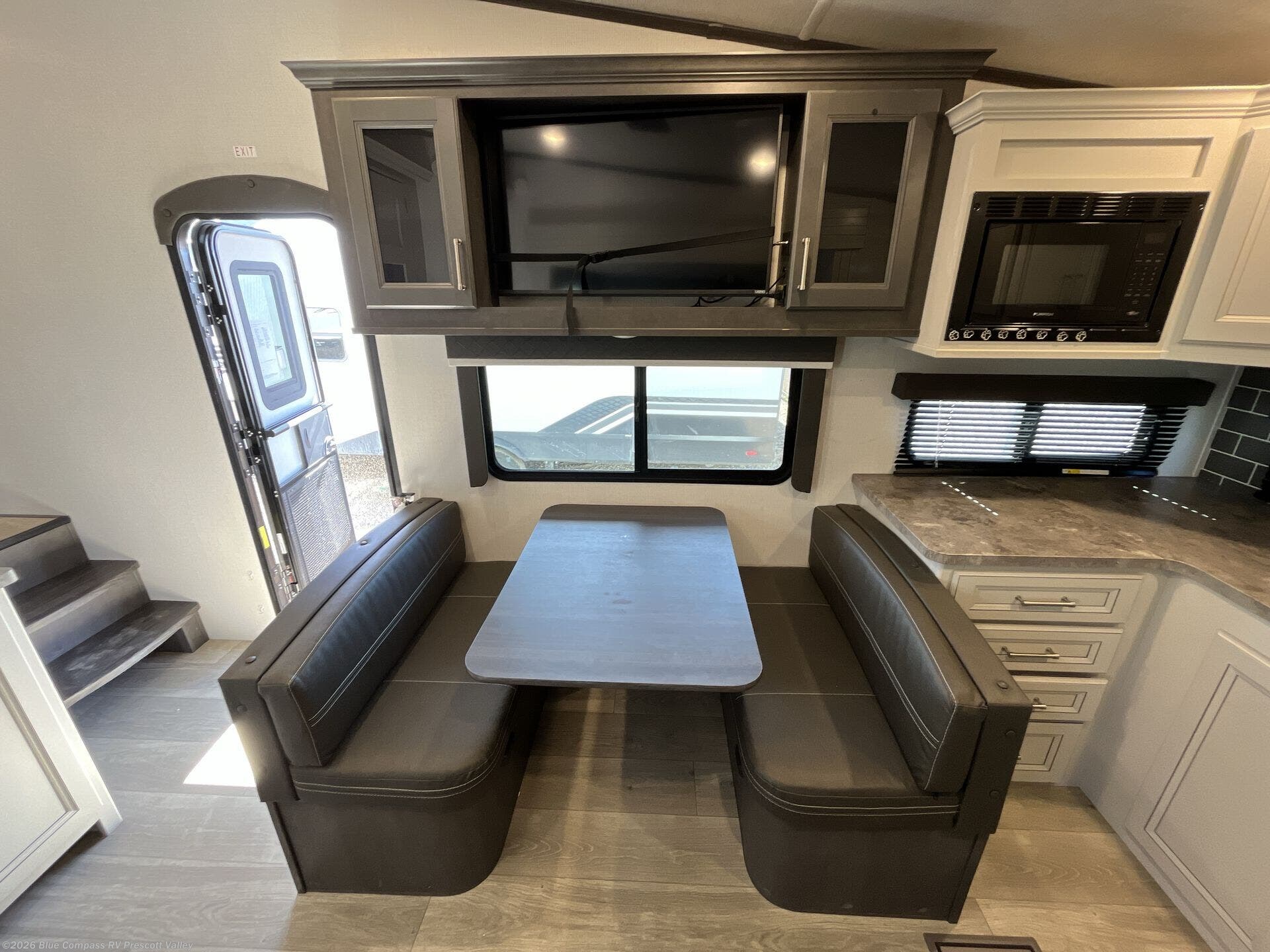 If you are looking for a fifth wheel that sleeps four to six with inside and outside cooking then check this unit out! This unit offers a short, mid-living layout with a bedroom wardrobe slide and combined 12 volt refrigerator and 68" tri-fold sofa sleeper slide for added floorspace to move about. Up front, you will enjoy a private bedroom with a queen bed and bedside wardrobe/nightstands as well as a larger wardrobe that slides out along the curbside wall. A complete bath provides a large shower, toilet and sink, plus linen storage which you are sure to appreciate as you travel. There are plenty of options for this unit making it easy to customize to your use and style. The theater seating and free standing dinette options can be selected in place of the sleeper sofa and booth dinette if you prefer. If you enjoy spending time outdoors, imagine making breakfast for your friends and family using the outside griddle. There is also a 16' awning to create even more living space to enjoy, and the unobstructed pass-through storage compartment can easily house all of your outdoor camping gear like lawn chairs and yard games.