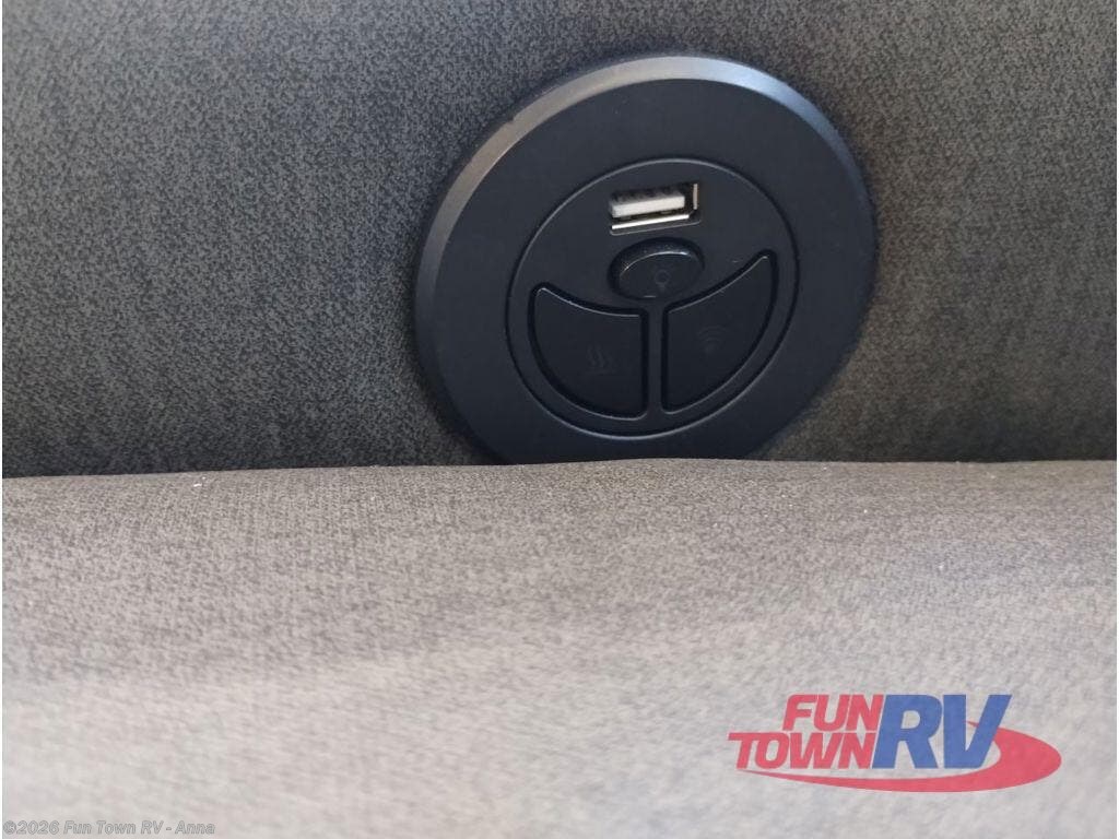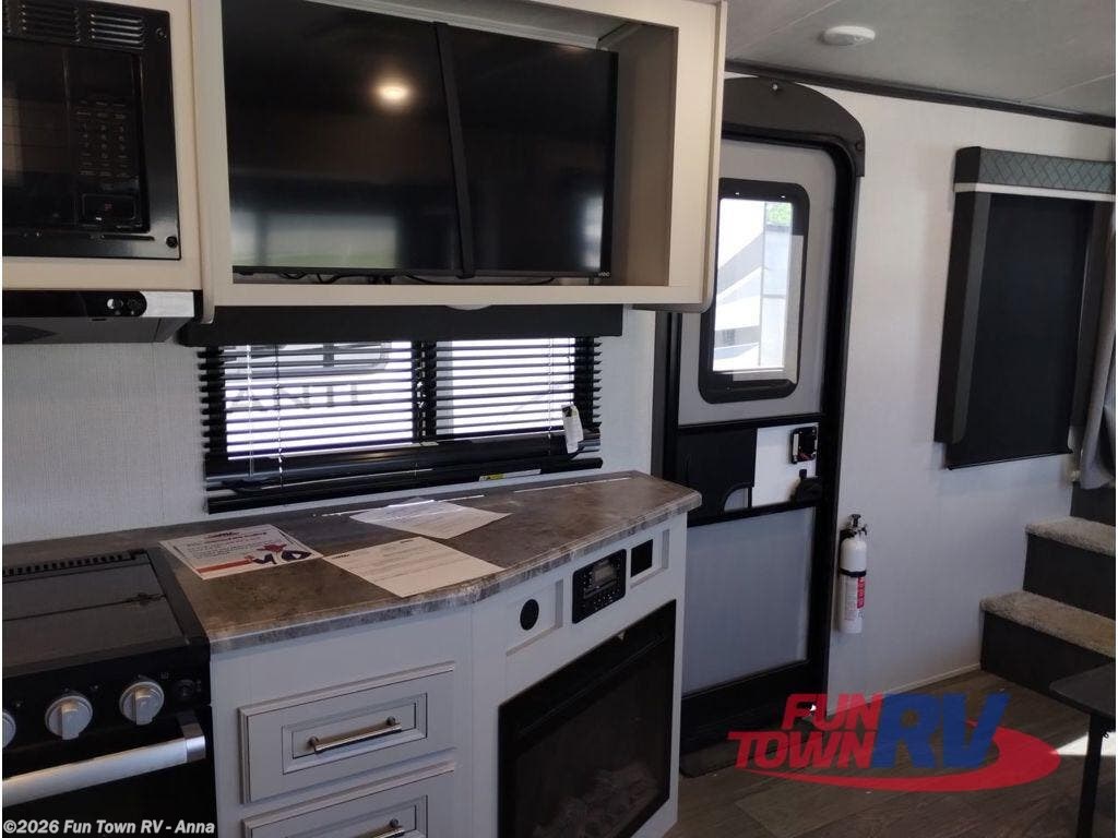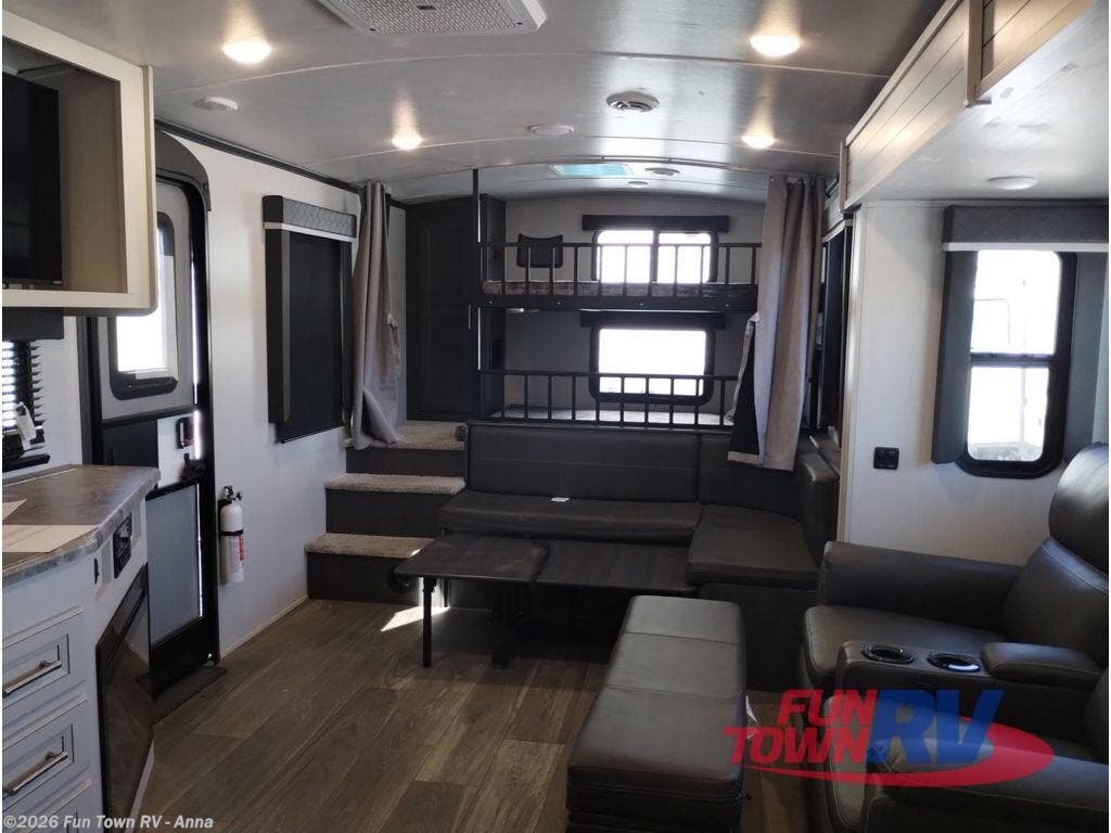 There is so much flexible space in this Cougar Half-Ton travel trailer! The rear bunkhouse has double bed bunks to sleep up to four. The lower bunk can flip up to create a storage area, and there is a cargo door here for direct access to the outdoors so you can load your bikes, toys, or gear easily. At the other end, you will love the private front bedroom with a king bed, dual night stands, and dual wardrobes for maximum space for your clothing. A roomy pass-through compartment runs underneath this bedroom if you should need additional room for outdoor gear. The kitchen/living area is centrally located and has a fireplace with a TV above it for a cozy gathering space. A corner booth dinette has an ottoman/bench seat that can be used for seating as needed. A 68" tri-fold sofa offers additional seating or sleep space if needed, or you can exchange it for the optional theater seating.