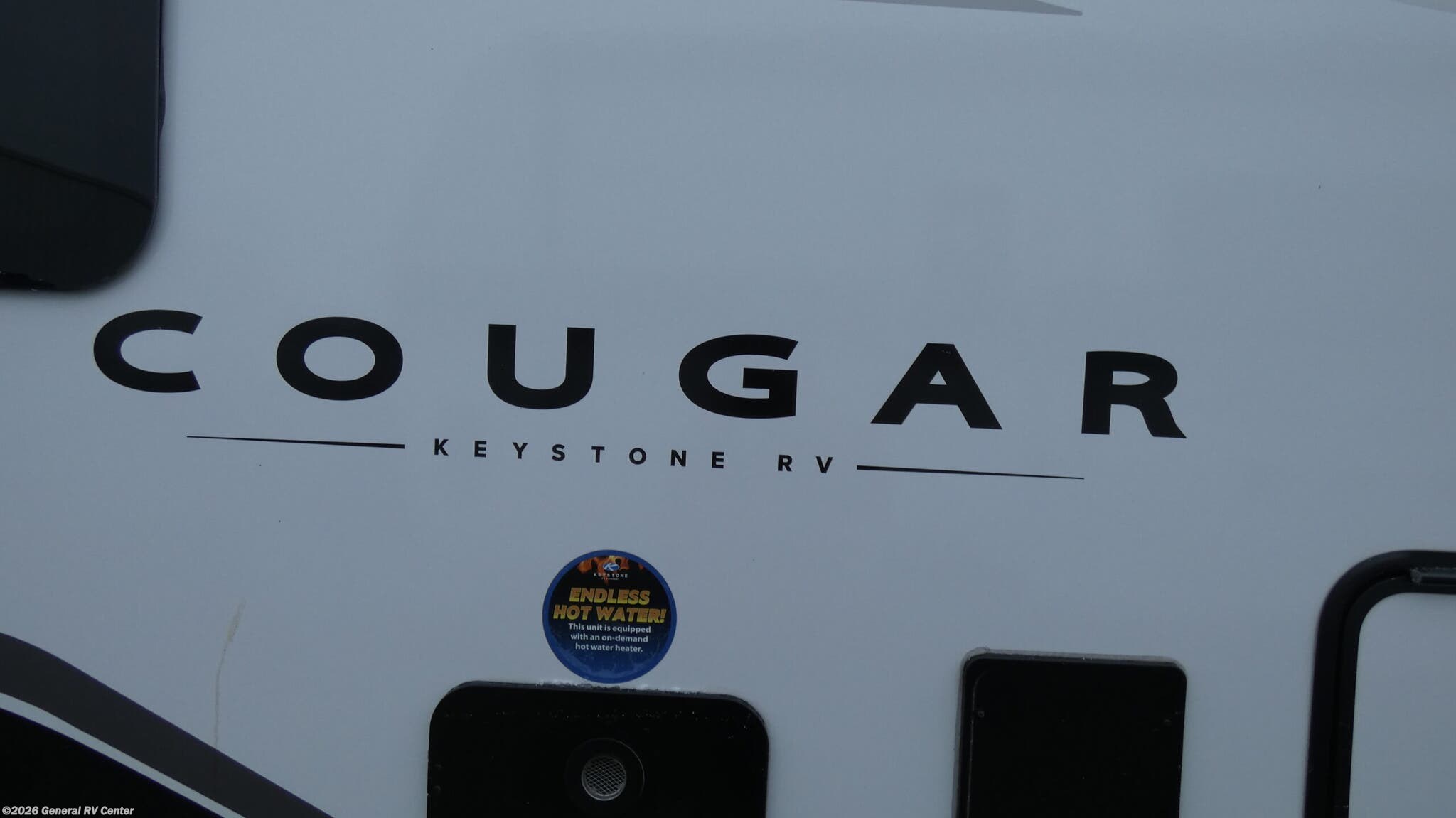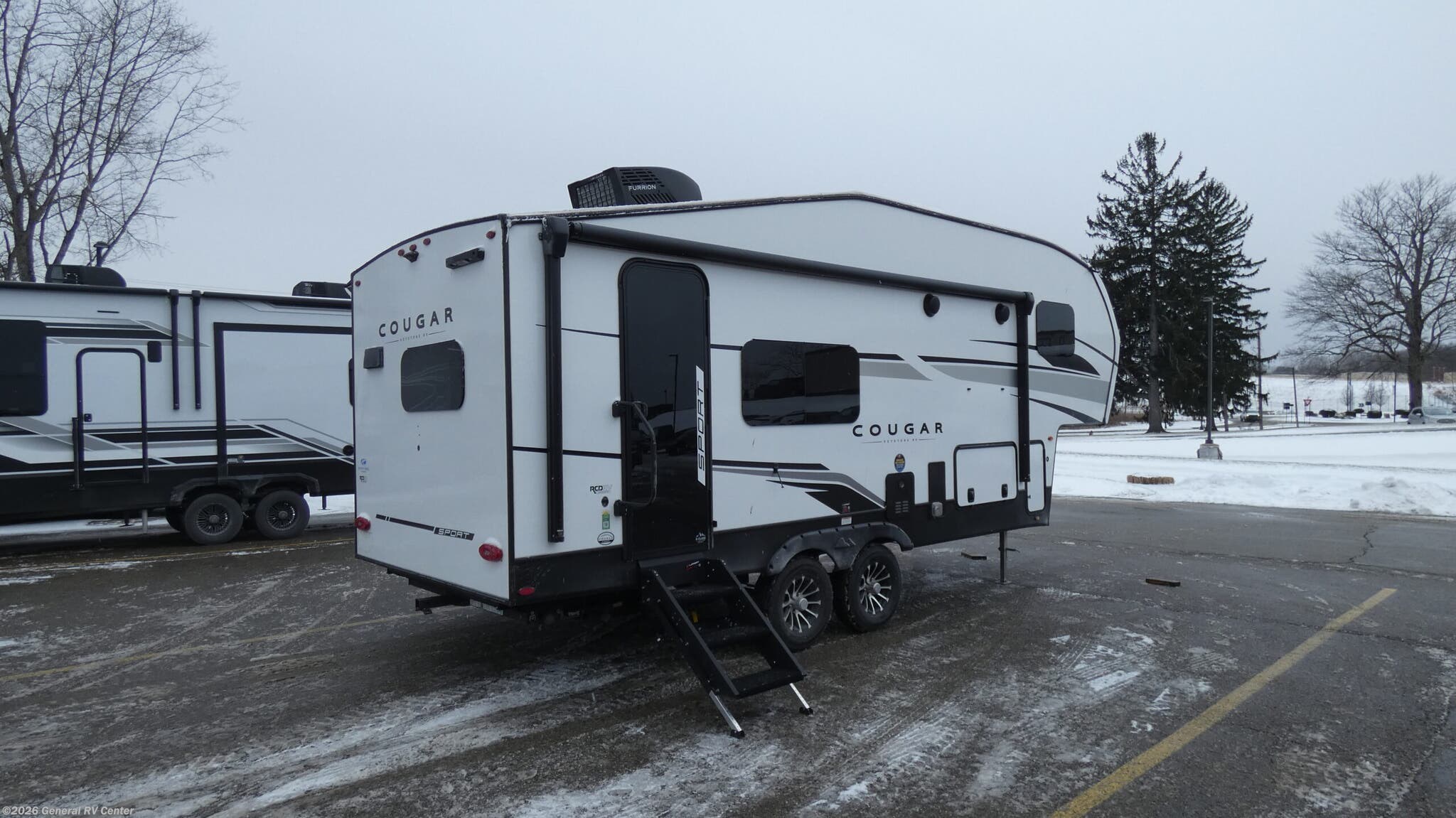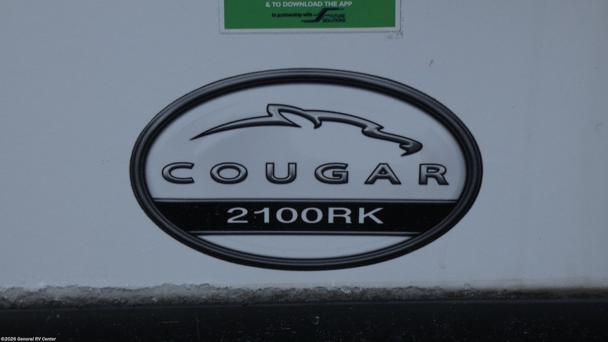 **Keystone Cougar Sport fifth wheel 2100RK highlights:** - Rear Kitchen Layout - Tri-Fold Sofa Sleeper - Private Front Bedroom - 17' Awning - Unobstructed Pass Through Storage Your family of five or six will love traveling in this Cougar Sport lightweight fifth wheel! Enter to find a convenient rear kitchen layout just steps inside the door. Drop your shoes off in the shoe cubby to your right at the door, and relax on either the tri-fold sleeper sofa or at the booth dinette. The sofa and a 12 volt refrigerator are situated within the slide for added roominess. Head up the steps to a complete bath and private front bedroom featuring a queen size bed with dual shirt wardrobes and nightstands on both sides of the bed. There is also a wardrobe off the foot of the bed along the inside wall with two convenient drawers as well. The bathroom offers a shower with a skylight for added headroom and natural lighting. You will also appreciate the medicine cabinet over the sink for your personal items. Back down to the main living and kitchen area, a nice size pantry will hold all of your dry goods and snacks, and there is ample storage in the overhead cabinets above the dinette on either side of the TV, plus in the kitchen area all along the rear wall. Here you can cook your family their camp favorites using either the three burner range with oven, or overhead microwave. Outside, a 17' awning provides added living space protected from the elements! The Cougar Sport structural I-beam frame with stamped steel cross-members and outriggers, plus its laminated sidewalls with five-sided aluminum superstructure and Alpha Super Flex roof membrane are what active RVers love about the construction of the Cougar line. The Cougar Sport models are no exception when it comes to a great package, as well as being smaller and lighter weight than their big brother Cougar models. A one-piece, heated and enclosed polypropylene underbelly means a longer camping season. On the inside, residential shaker style hardwood cabinet doors and decorative crown molding, plus seamless pressed countertops and an on-demand water heater will make your unit feel even more like home. You are also sure to appreciate the shiplap style decorative accent wall behind the bed, a porcelain foot flush toilet in the bathroom, plus residential kitchen hardware, and so much more.