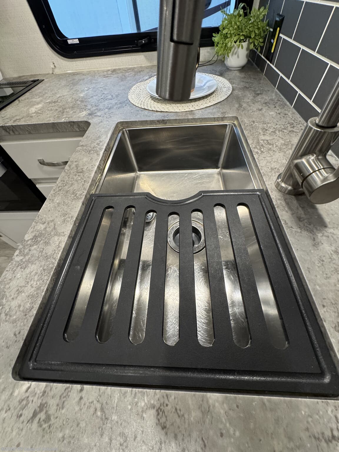 - Kitchen: Equipped with a 10.4 cu. ft. 12V refrigerator, a three-burner range, and seamless pressed countertops.