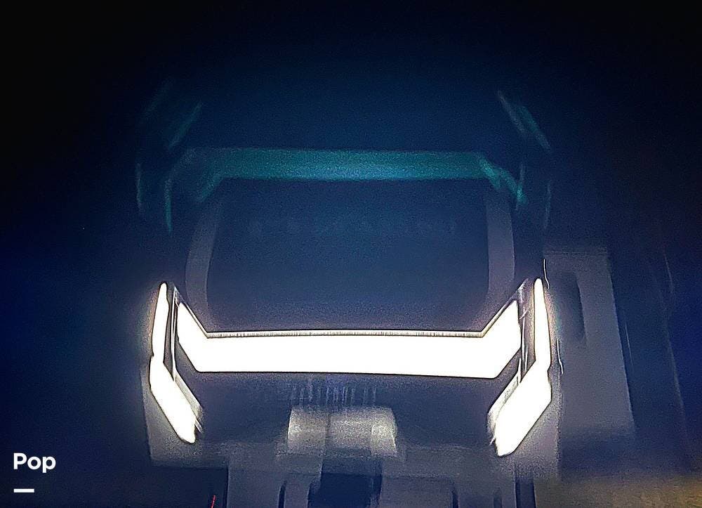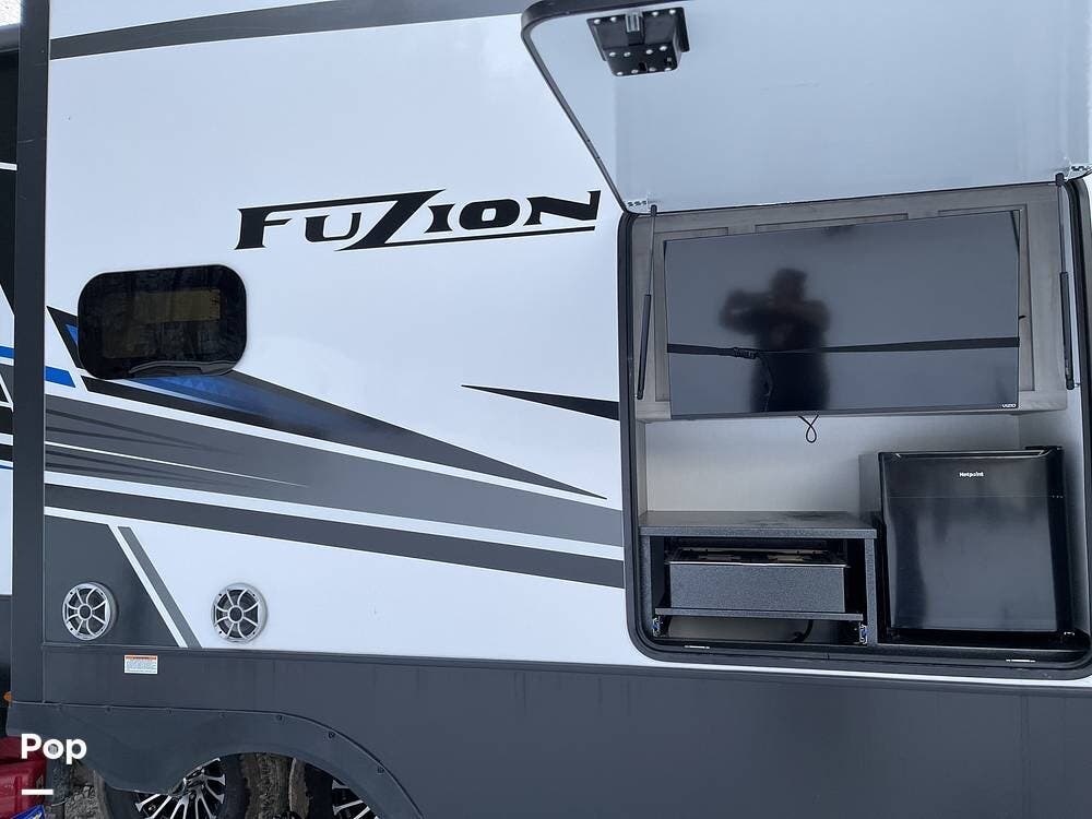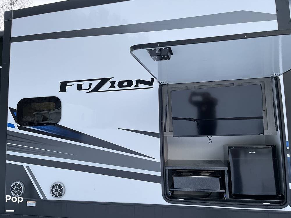 This 2024 Fuzion 379 5th Wheel By Keystone features an external entertainment center and external kitchen, with three slides, two power awnings with LED lighting that virtually covers the entire RV's entry side, and a rear awning.