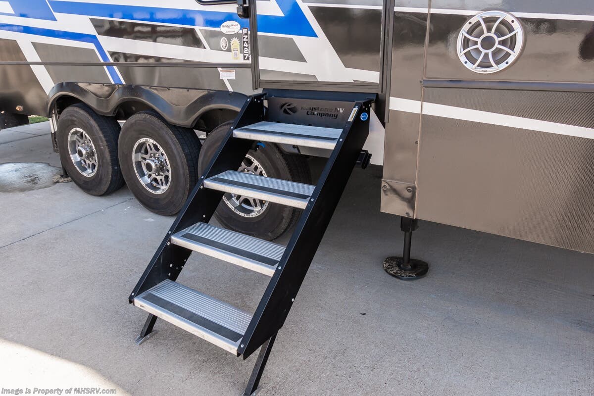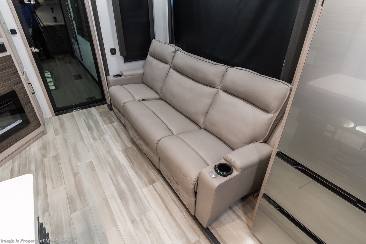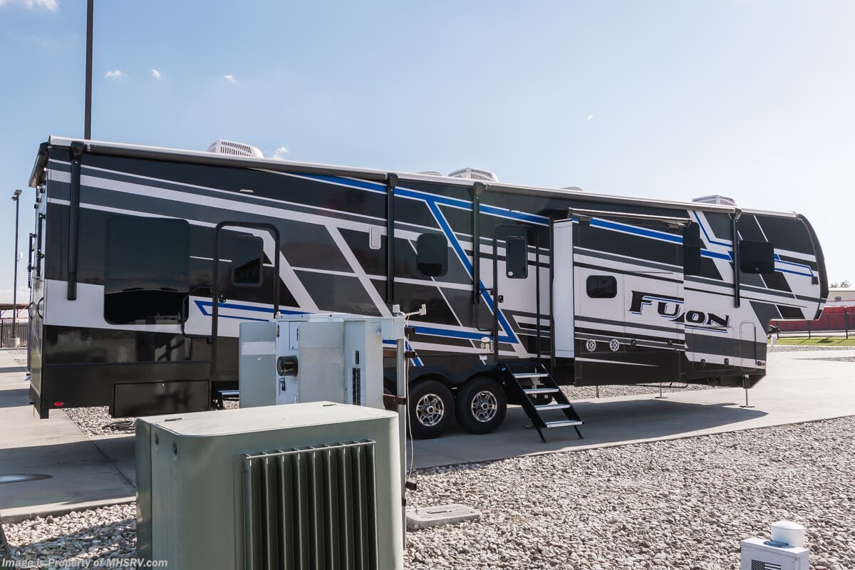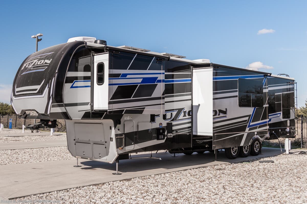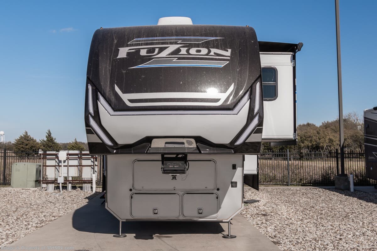Used Keystone 5th Wheel for sale – 2024 Keystone Fuzion M427 is approximately 45’ 6” feet in length, 3 slides and features lippert hydraulic leveling system, aluminum wheels, full body paint, 3 camera system, 3 A/C's, gas generator, patio awning, door awning, pass through storage, LED running lights, docking lights, black tank flush, water filtration system, exterior shower, exterior TV, ladder, solar, inverter, leather seating, combination washer/dryer, central vacuum, 7 foot ceiling, dual pane windows, fireplace, multi-plex control panel, hardwood cabinets, convection microwave, residential refrigerator with ice maker, 3 burner gas range with oven, bath and a half, theater seats and much more. For more details on this unit, our full inventory, brochures, window stickers, videos, photos, and customer reviews, visit or call 800-335-6054 for the Texas location or 334-288-0331 for our Alabama location. At Motor Home Specialist, we DO NOT charge any prep or orientation fees like you will find at other dealerships. Read Thousands upon Thousands of 5-Star Reviews at and See What They Had to Say About Their Experience at Motor Home Specialist. WHY PAY MORE? WHY SETTLE FOR LESS?