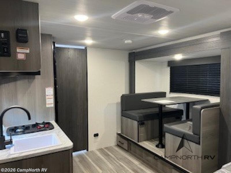 It's time to enjoy the great outdoors with family and friends at the campgrounds you like to meet everyone at! This trailer will allow three to four to camp comfortability with amenities such as a two burner cooktop, a 7.7 cu. ft. refrigerator, and a spacious rear full bathroom. The booth dinette slide offers a place to dine, read a book and even provides sleeping space and storage drawers for board games or throw blankets. The slide gives the interior more floor space as well. This model also includes a walk-around queen bed that will make your space feel a little more like home!