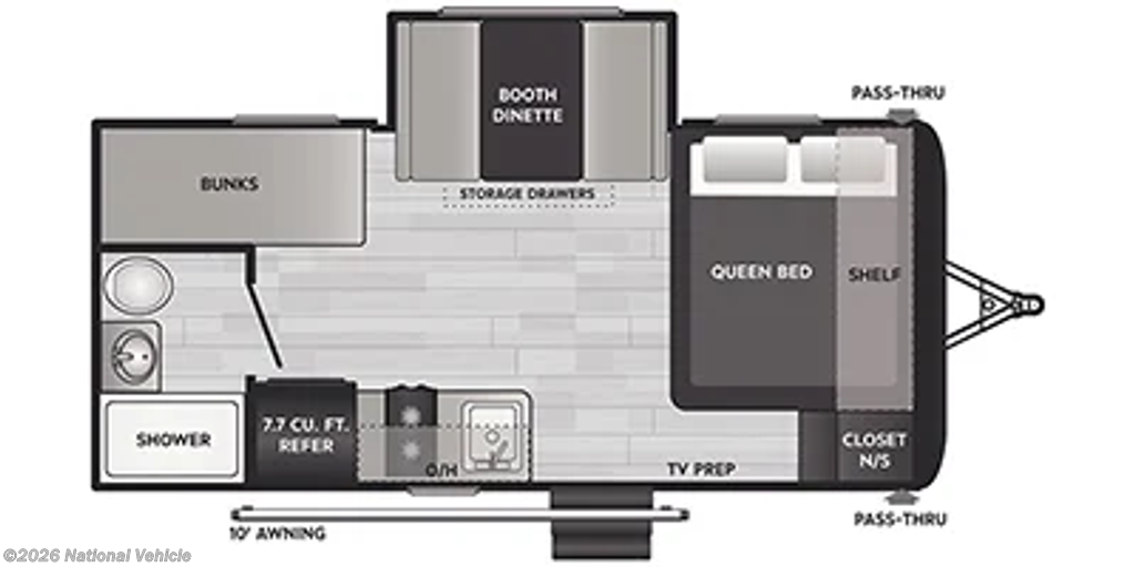 Inside, you?ll find a smart, family-friendly layout with a front queen bed, twin bunks, and a dinette that converts to a bed?plenty of sleeping space without feeling cramped. The kitchen features solid surface countertops, a stove, microwave, and refrigerator/freezer, while the full bathroom with a privacy door keeps things comfortable and civilized.