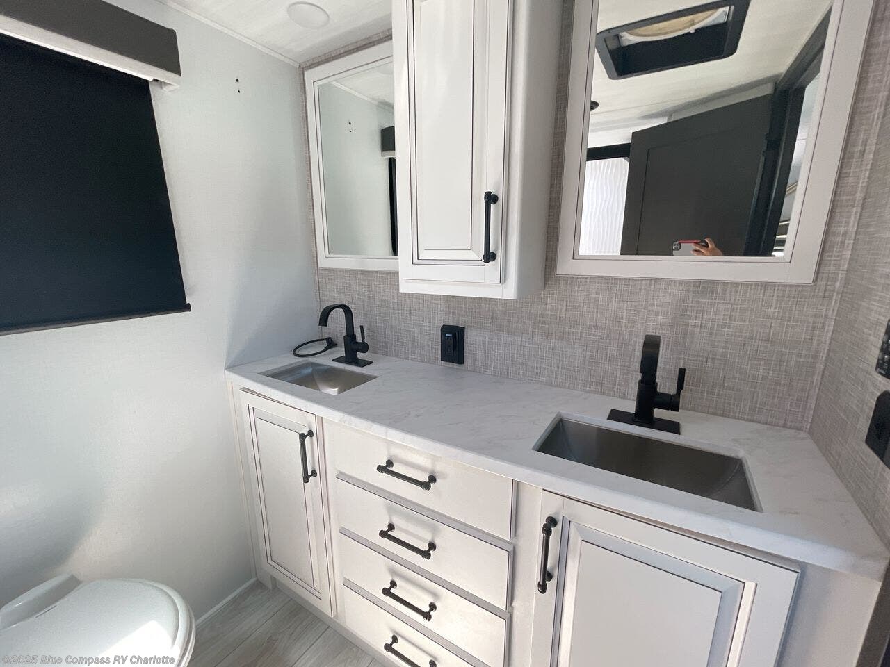 Luxury abounds throughout this fifth wheel! Starting in the kitchen with the island, two pull out pantries with extra countertop space above it, a residential range with hidden storage, and a pull out countertop for more prepping space. The full bathroom has a 48" x 30" fiberglass shower with a seat, decorative glass enclosure, and skylight above it for more natural lighting as two get ready at once with the dual sink vanity. Sleep like a baby in the front private bedroom on the king bed slide with storage underneath and keep your clothes looking their best with the front closet that has a clothing hamper and stackable washer and dryer prep. The rear living area offers true relaxation with a hide-a-bed sofa and power theater seating across from the entertainment center with a 5,000 BTU decorative fireplace heater and 50" Smart TV to watch your favorite movies!