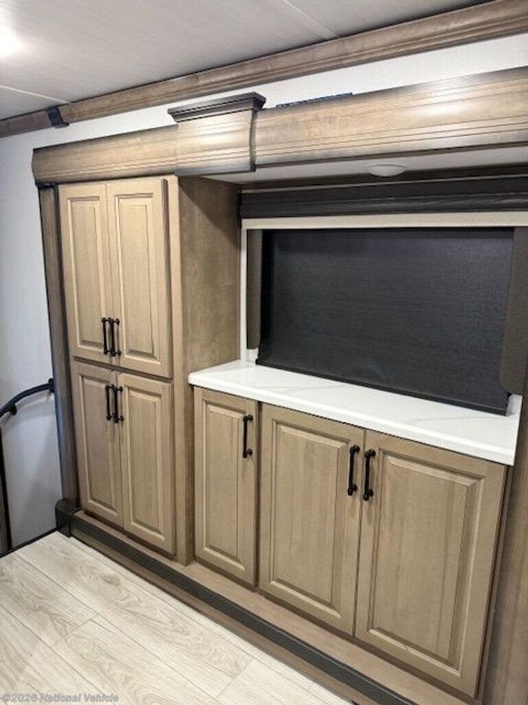 Raised Rear Kitchen: Residential refrigerator, convection microwave, oversized sink, expansive solid-surface countertops, abundant cabinetry, and a large pantry?perfect for extended stays or full-time living.