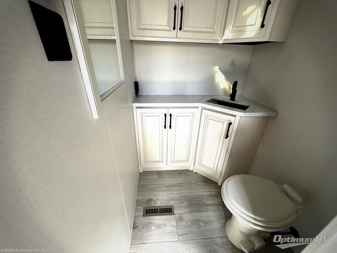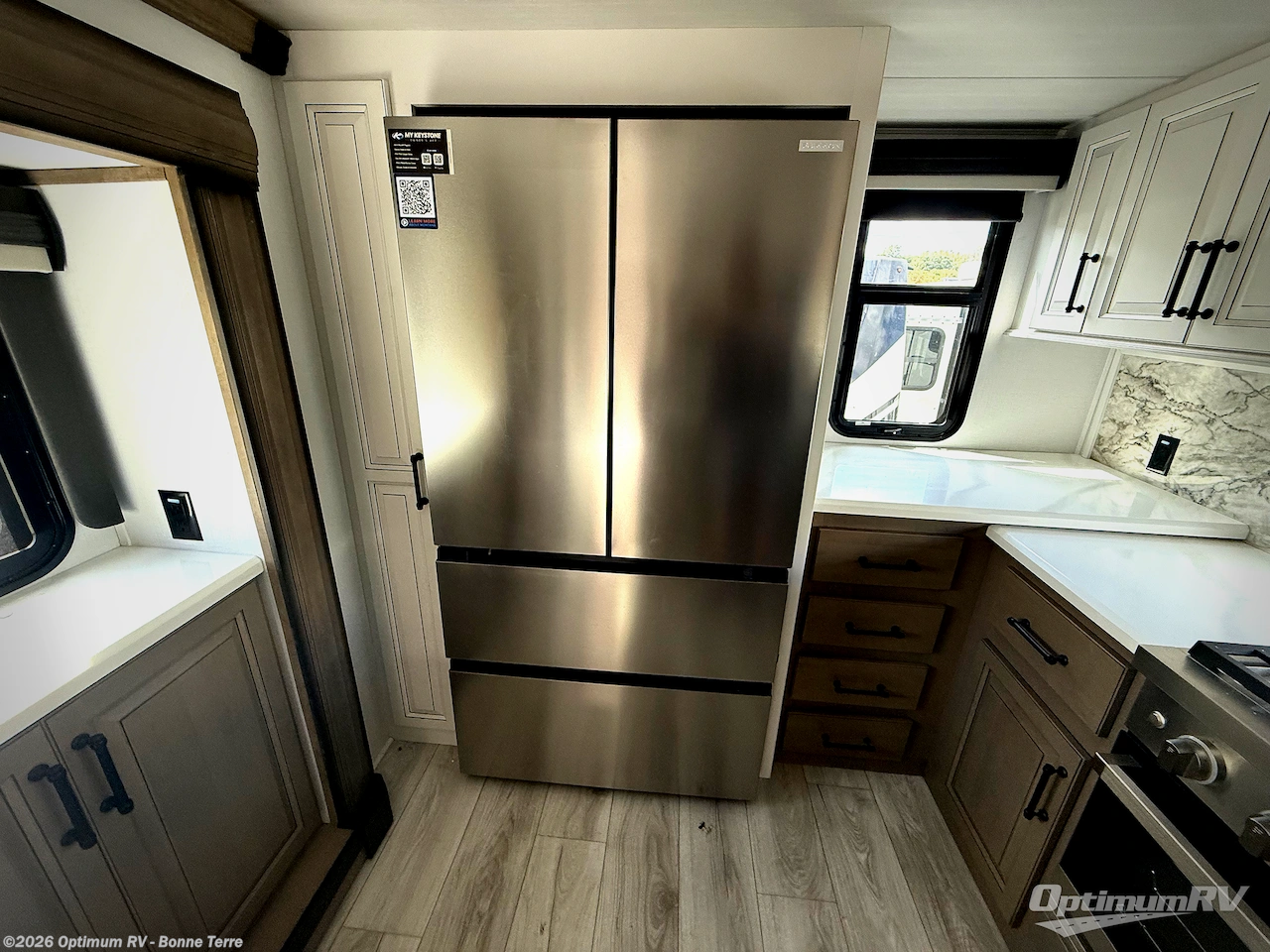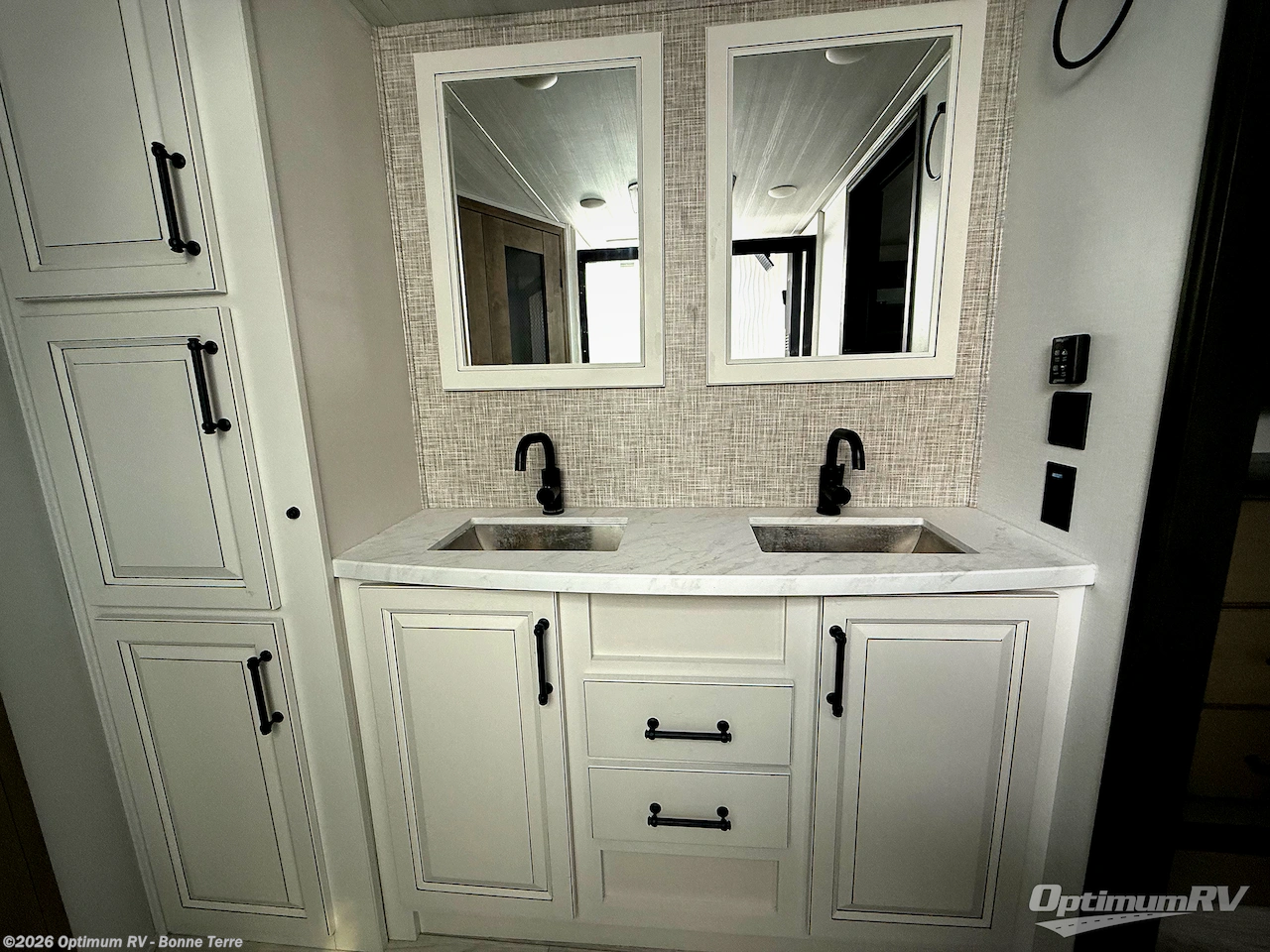 The perfect RV when you like to take "home"' with you when you travel! This Montana fifth wheel gives you the space you want and it feels like home with plenty of features to love and keep you comfortable when you are out enjoying your adventures. Five slides in total give each space plenty of room, the raised rear kitchen has everything you need to cook up meals and snacks just like at home. An 18 cu. ft. residential refrigerator with an ice maker, convection microwave oven and large sink, plus pantry space will make any chef happy. The mid-coach space just inside the door features a living room and half bath for convenience. There is also a dining table and four chairs within the roadside slide. Step up in front through a sliding barn door to a double slide space with a king bed and dresser. A second sliding barn door leads into the front spacious master bath featuring dual sinks, a 48" x 30" shower, and a large walk-in wardrobe with washer and dryer prep!