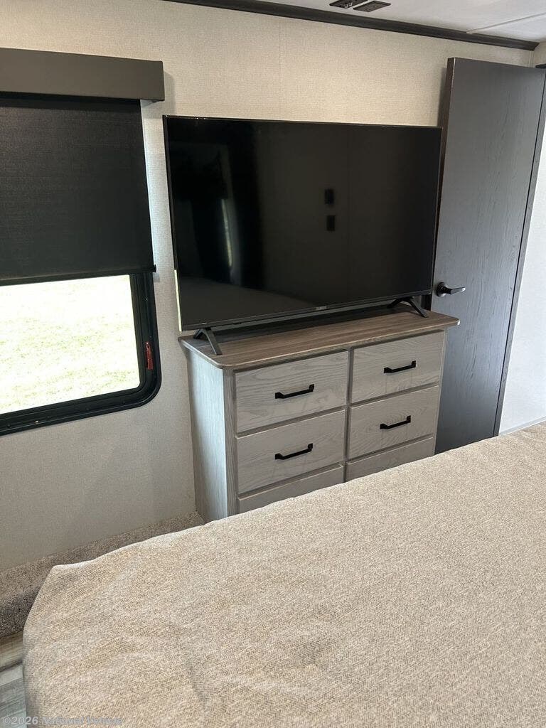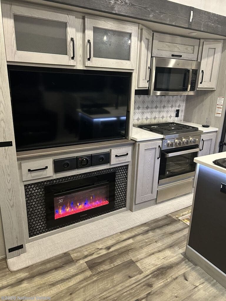 Relax in the main living area featuring power theater seating, a 50" Smart TV, JBL premium stereo, and a cozy electric fireplace?perfect for winding down after a day of adventure. Climate comfort is assured with dual A/C units, while forced-air heating and electric tank heaters extend your camping season year-round.