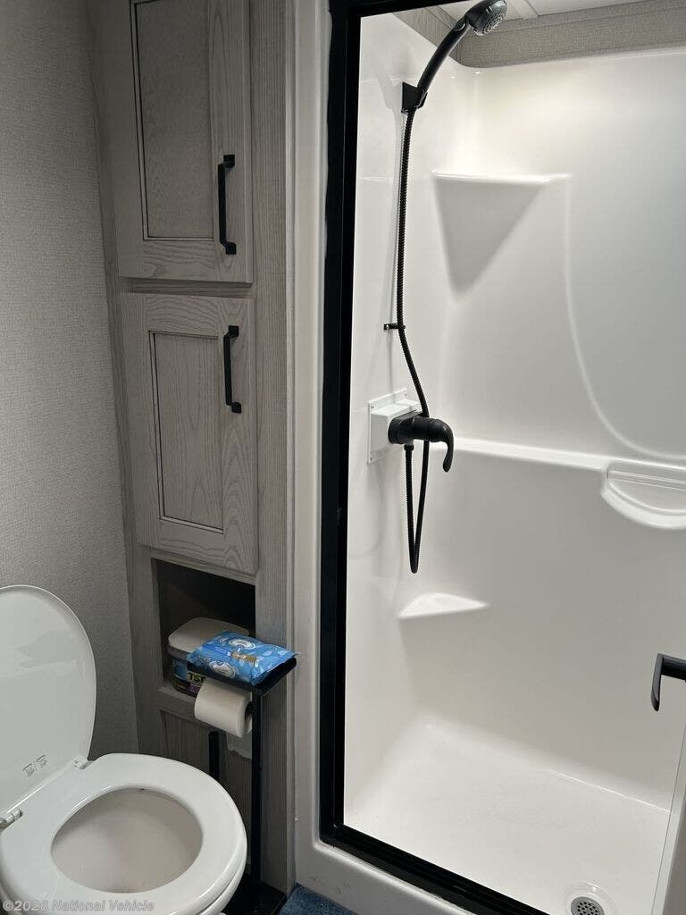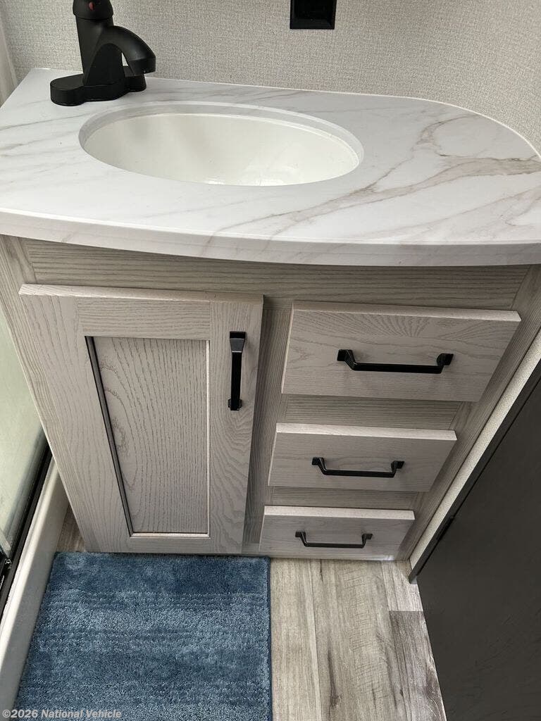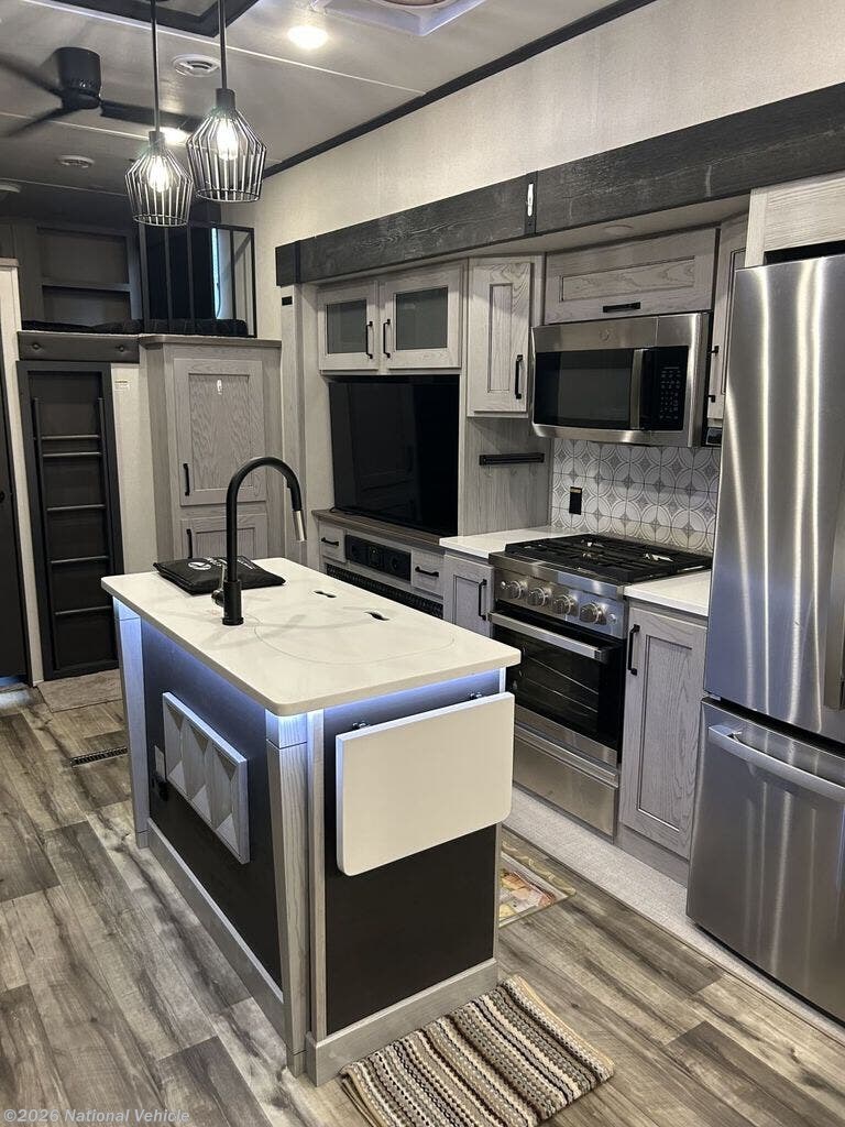 From the moment you enter, you?re welcomed by an expansive, light-filled interior highlighted by solid-surface countertops, a center island, and premium finishes throughout. The residential GE 18.6 cu. ft. refrigerator, 24" range, 3-burner stove, and generous pantry storage make this kitchen ideal for entertaining or long stays on the road.
