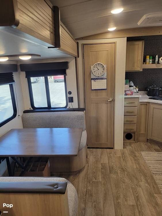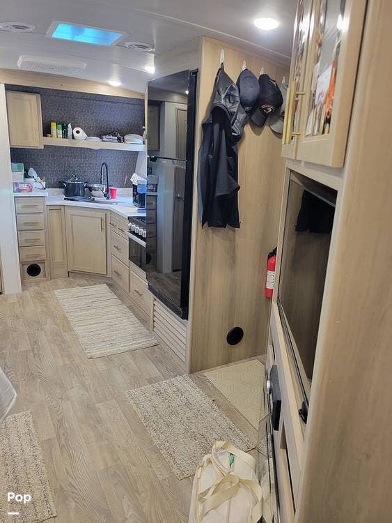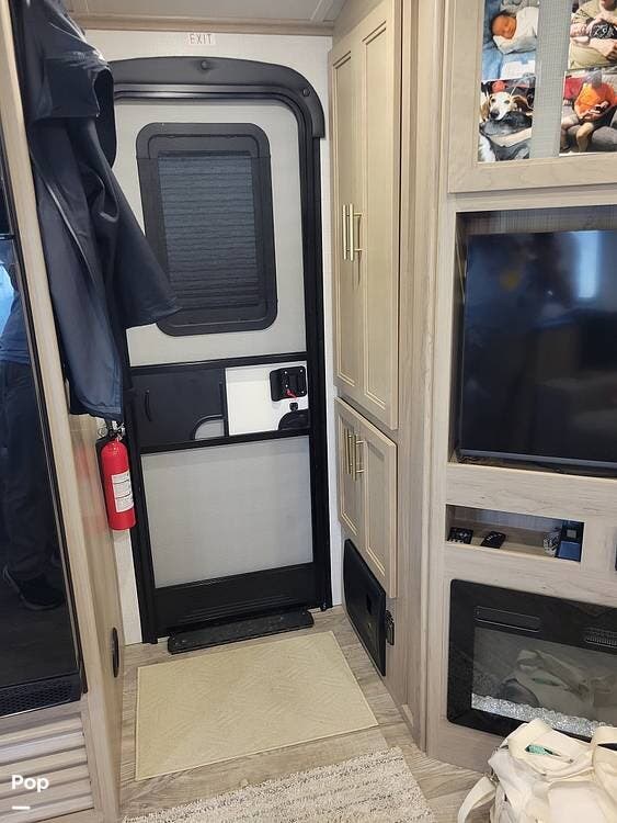 Step inside and immediately appreciate the thoughtful slide-out layout, delivering generous living space and seamless flow. The living room offers theater seating and a booth dinette, perfect for relaxing or dining. Across from this area, you'll find a sleek entertainment center featuring a flat-screen TV and a fireplace, accompanied by ample cabinetry for storing gear and electronics.