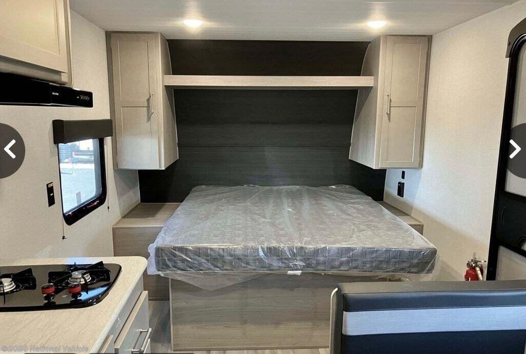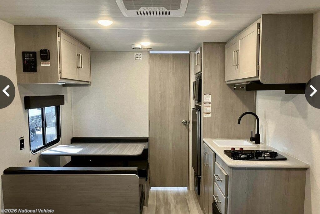 Step inside to a beautifully designed interior featuring hardwood cabinet doors, modern LED lighting, and a welcoming layout that feels far more spacious than expected. The front queen bed offers a relaxing private sleeping area, while the booth dinette provides the perfect space for dining, working, or converting into extra sleeping accommodations.