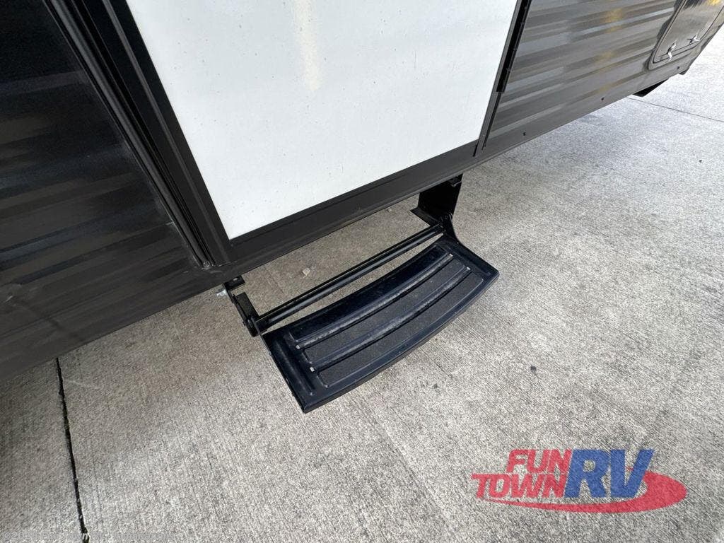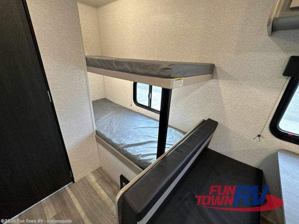 Get ready for outdoor fun with your favorite people when you have this trailer in tow! Once at your campsite, you can easily setup the 10' power awning, grab your camping chairs from the pass-through storage, and relax or start playing. The cook will love the galley kitchen with the two burner cooktop and microwave oven, plus a refrigerator for cold items. If you like, you can eat inside at the booth dinette which doubles as sleeping space, and of course the kids will love the bunk beds next to the full bathroom. And you will sleep soundly on the front queen bed.