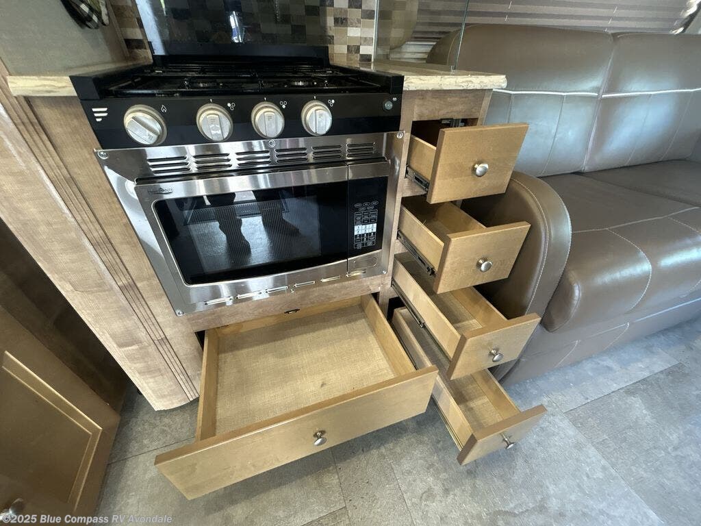 The adventurous type will love this coach with its large pass-through exterior garage-style storage with a bicycle/cargo slide that allows you to fit two full-sized bicycles and much more for fun outdoor adventures on the go. The separate rear bedroom provides convertible twin beds with easy access to the separate lavatory across from the enclosed shower, or you can make the twins into one 64" x 76" bed. The large galley offers a flip-down extension for more space for your drinks, dishes and such, a convection microwave oven, and a flush mount LP cooktop with a hinged glass cover. There is also a garbage can to keep everything tidy, and a double door, a three-way refrigerator, plus an accessory rail. This unit is also available with optional intelligent All-Wheel Drive (AWD).