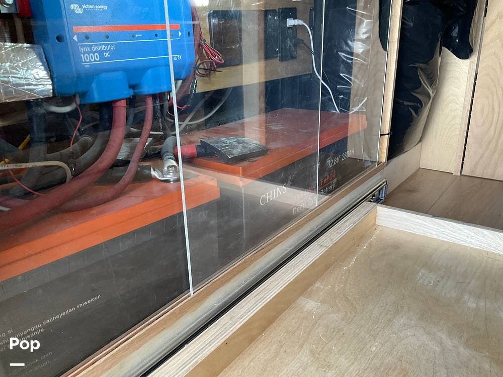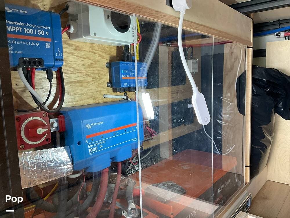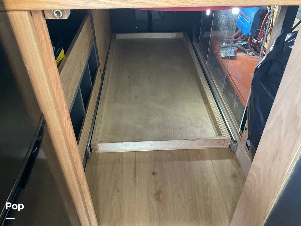 At the rear is the bedroom, featuring a comfortable queen-sized bed. Beneath the bed, there's a slide-out storage compartment, along with the solar converter, power inverter, water heater, and water pump -- all neatly tucked away to make efficient use of space.