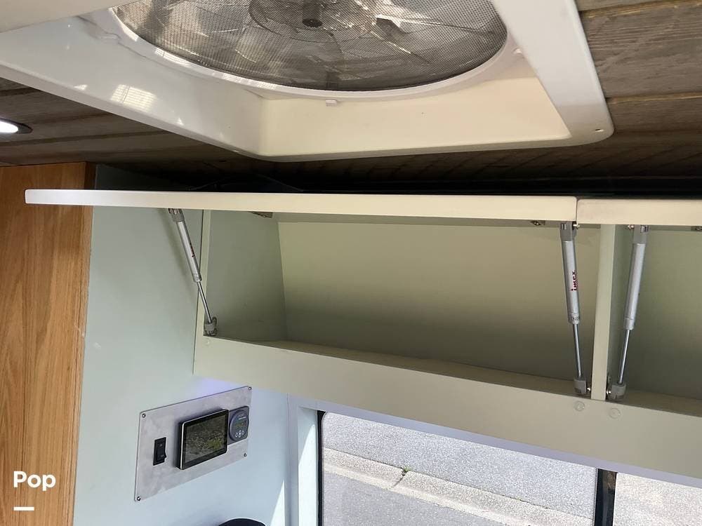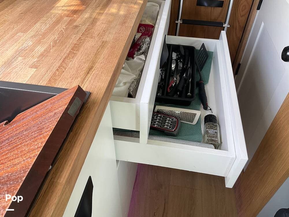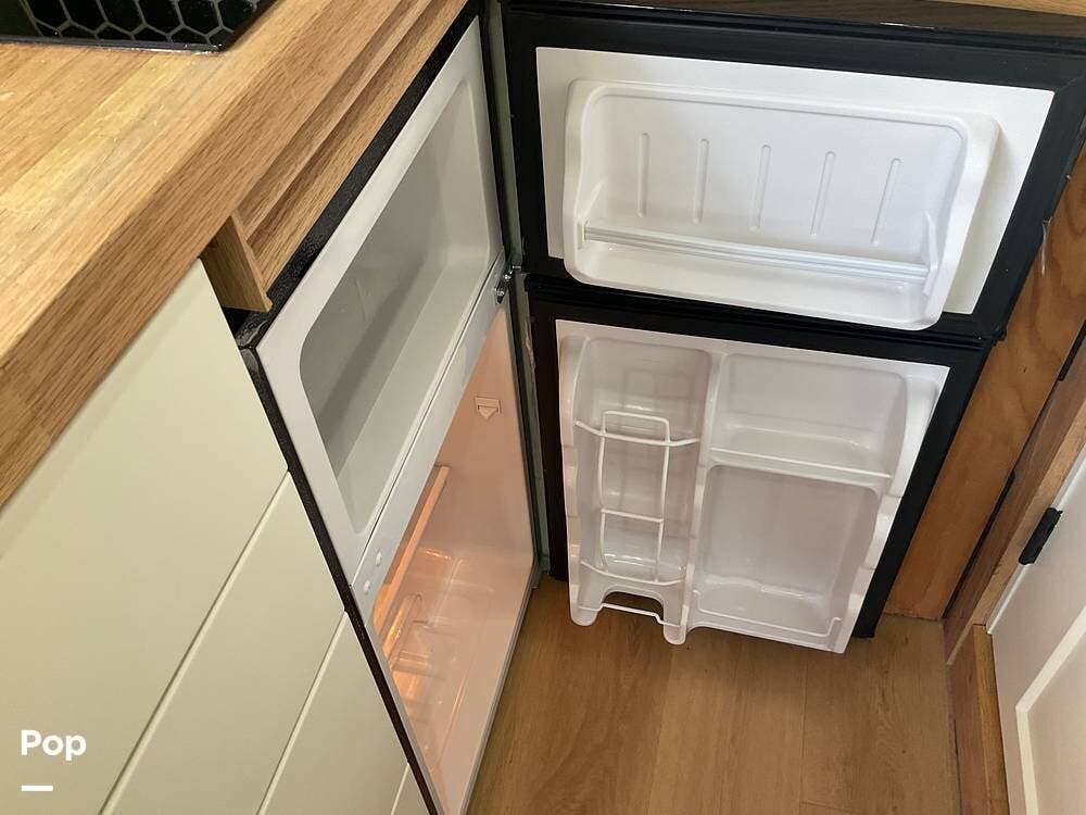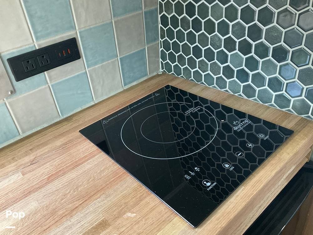 Step out of the elegantly appointed driver's cabin and into the cozy kitchen area, where you'll find a single-burner stove, a microwave conveniently mounted above, and a compact refrigerator with a freezer below.