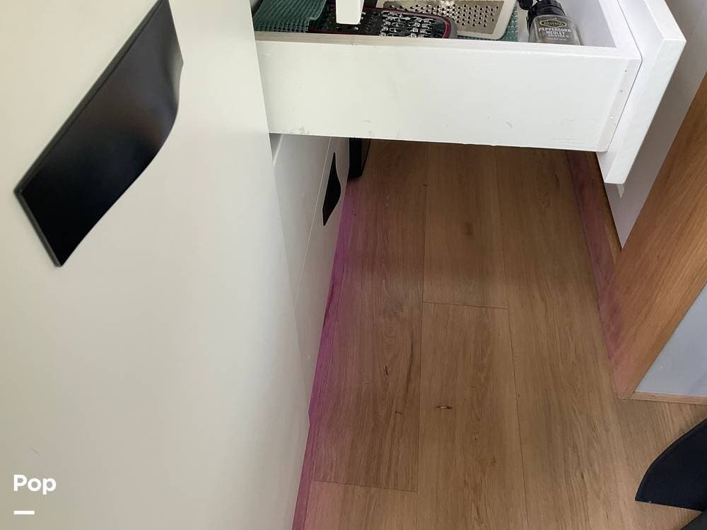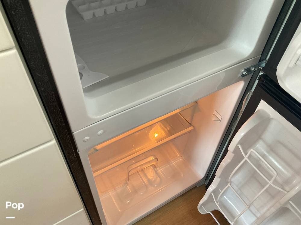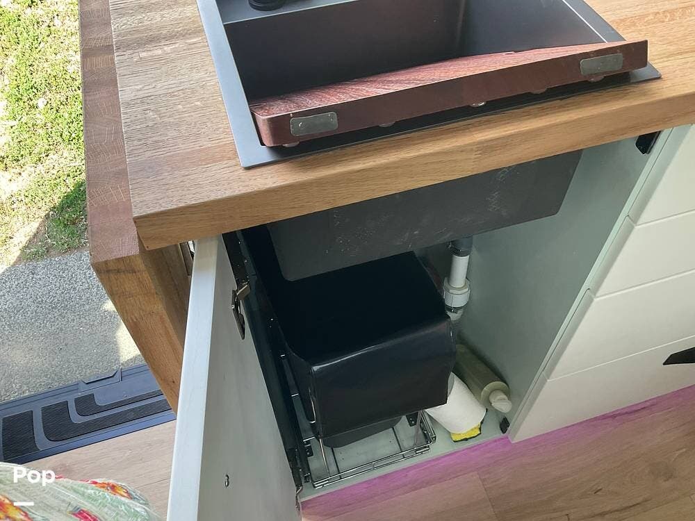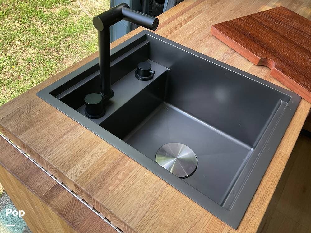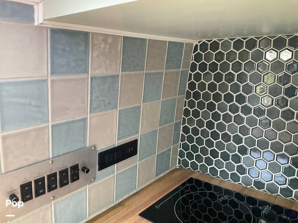 Step out of the elegantly appointed driver's cabin and into the cozy kitchen area, where you'll find a single-burner stove, a microwave conveniently mounted above, and a compact refrigerator with a freezer below.