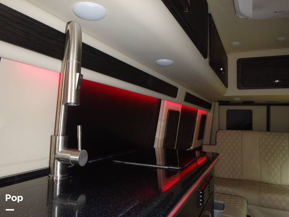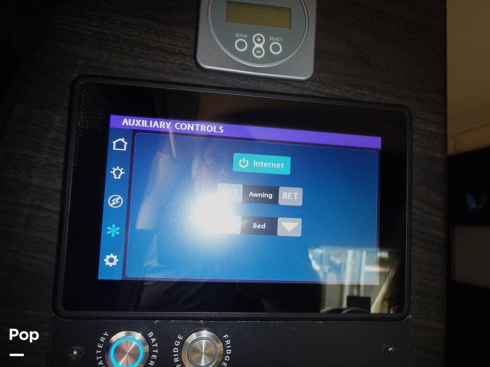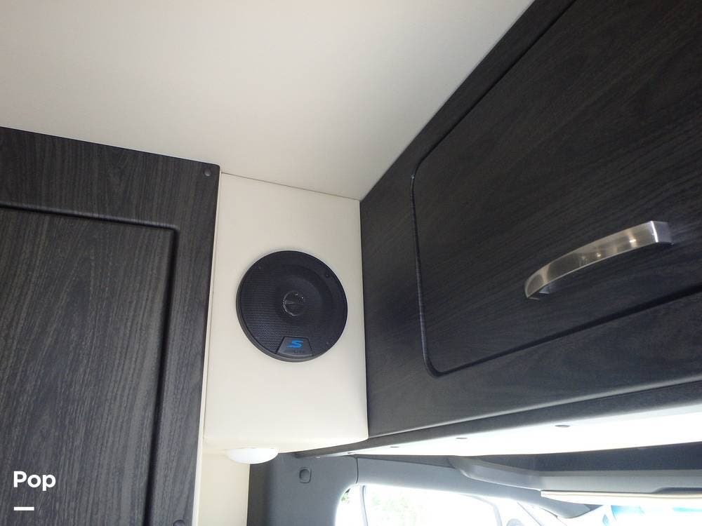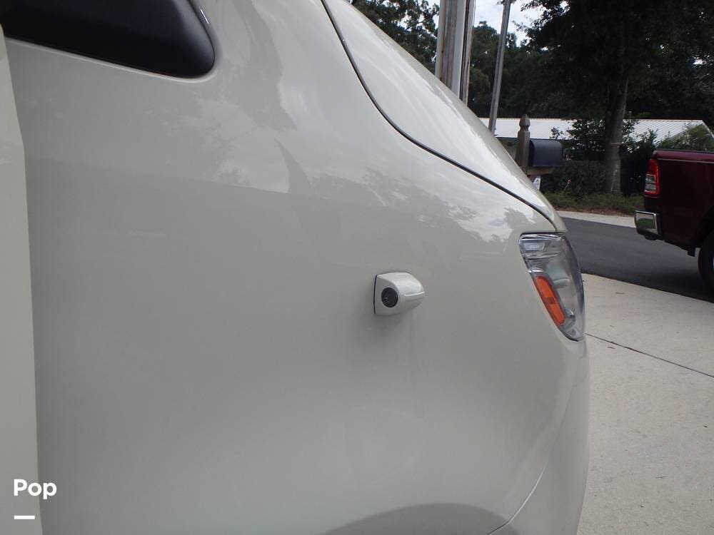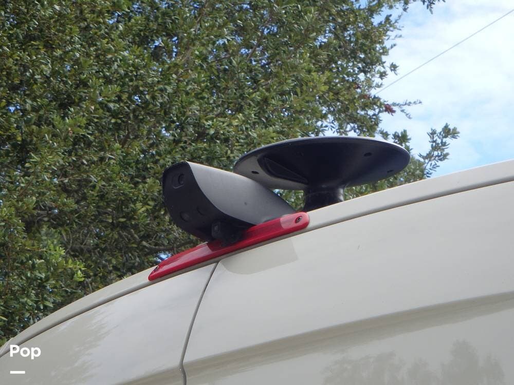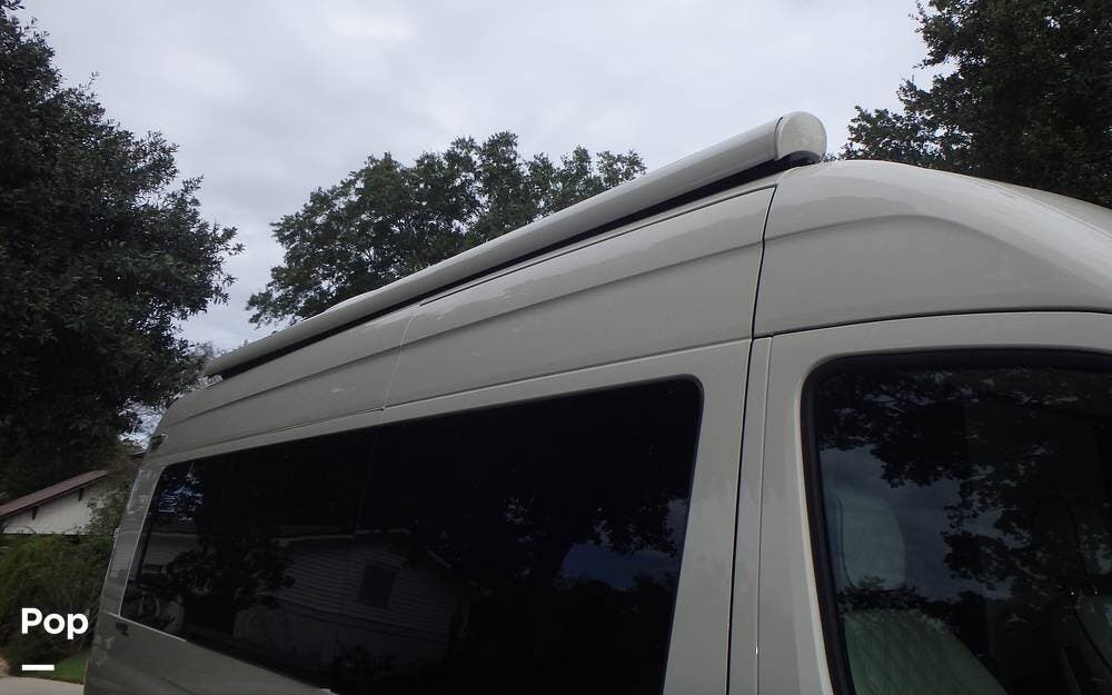 On the outside, it includes tinted side and rear windows, a power awning with LED lighting, a backup camera system, aluminum wheels, color-matched moldings, an exterior shower, and a roof-top solar charging system.