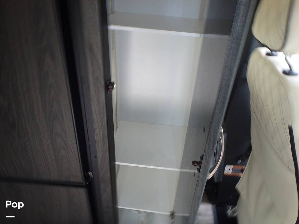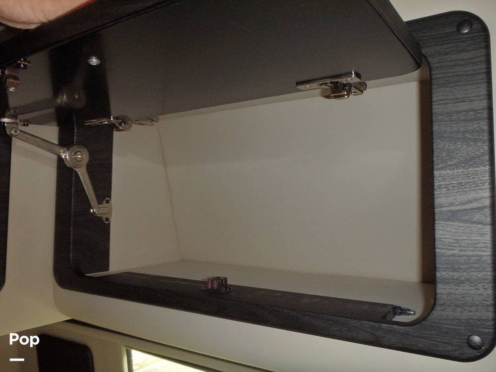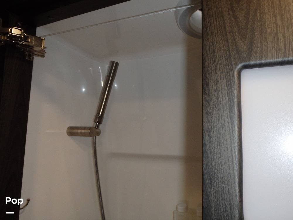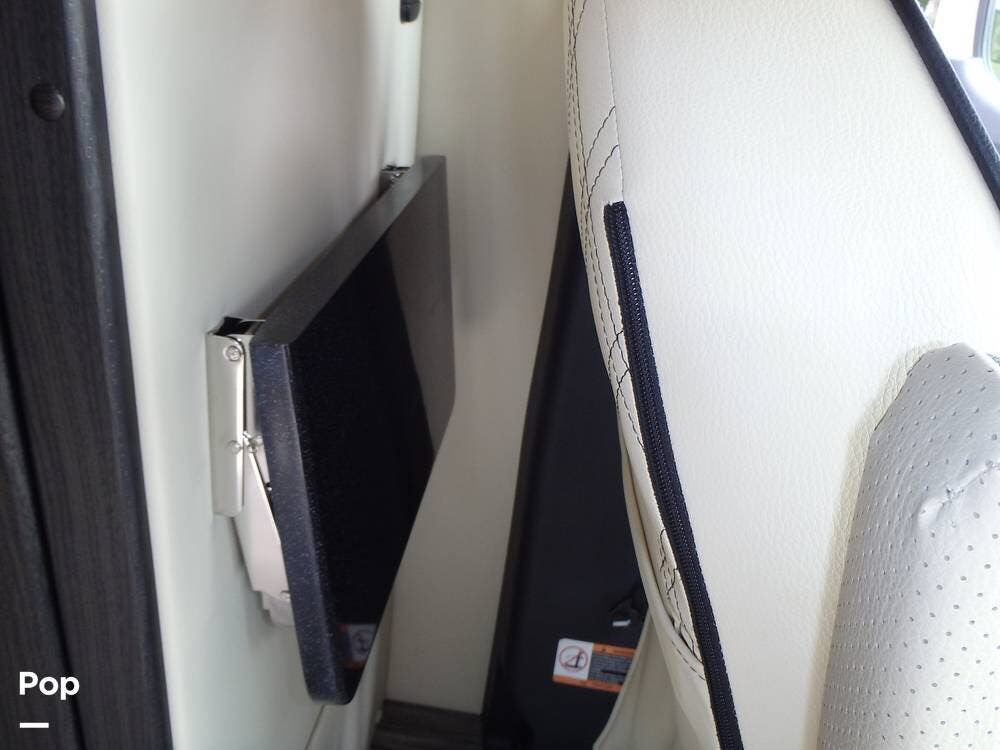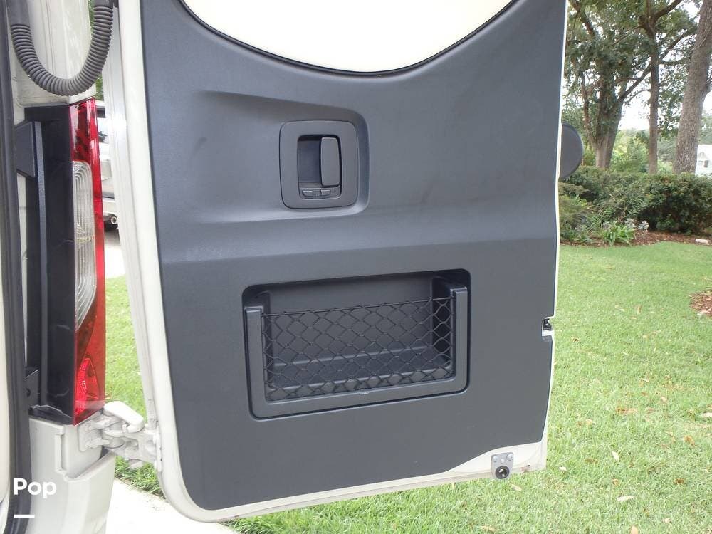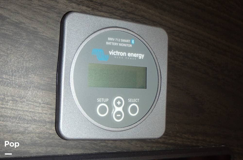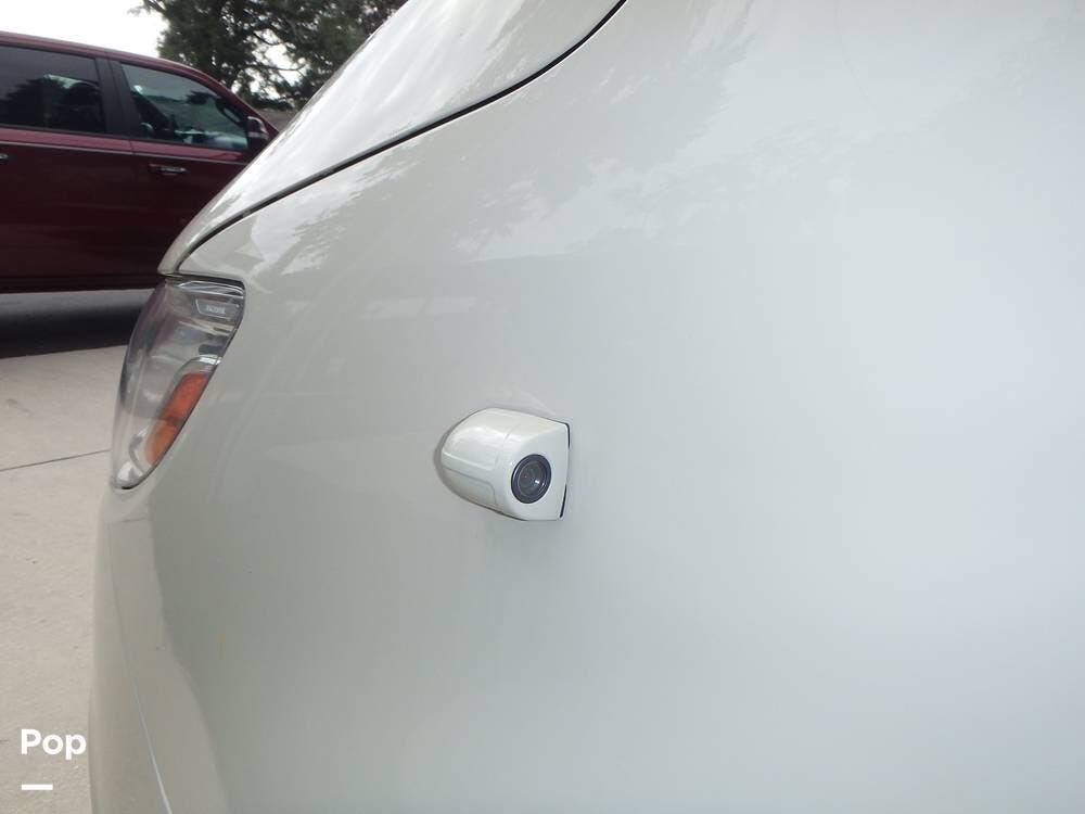 On the outside, it includes tinted side and rear windows, a power awning with LED lighting, a backup camera system, aluminum wheels, color-matched moldings, an exterior shower, and a roof-top solar charging system.