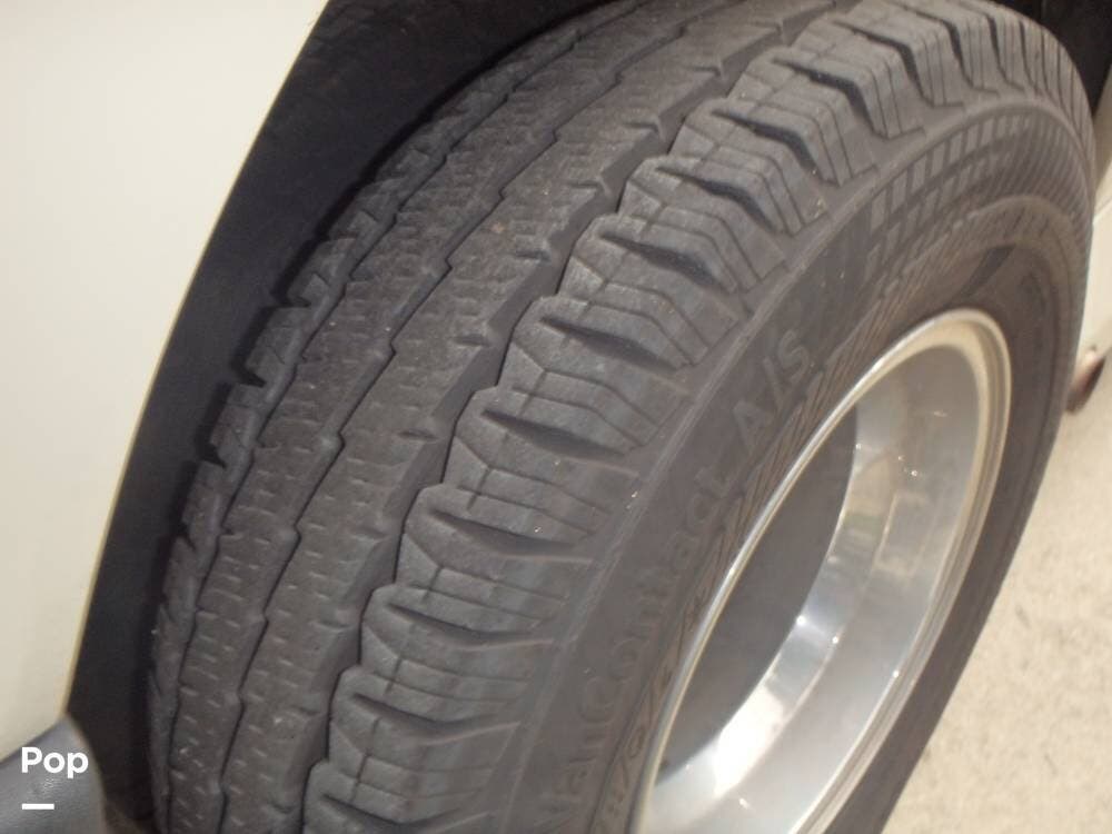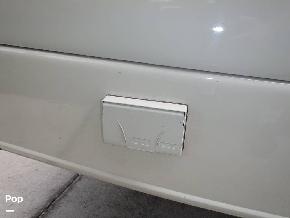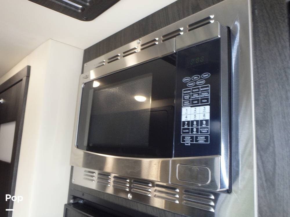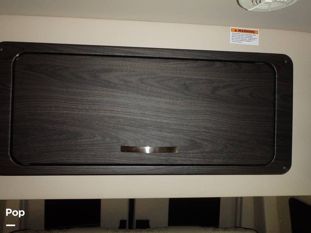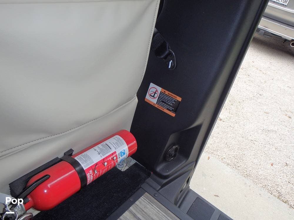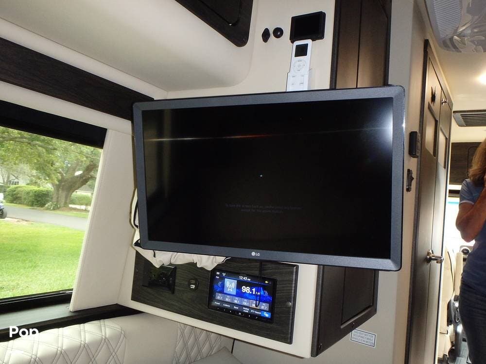 On the outside, it includes tinted side and rear windows, a power awning with LED lighting, a backup camera system, aluminum wheels, color-matched moldings, an exterior shower, and a roof-top solar charging system.