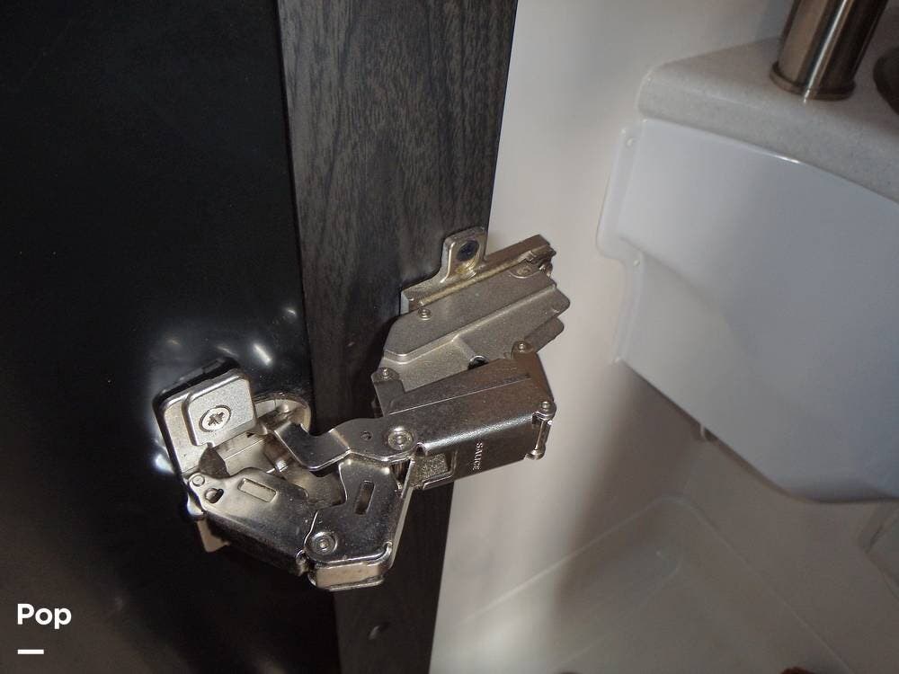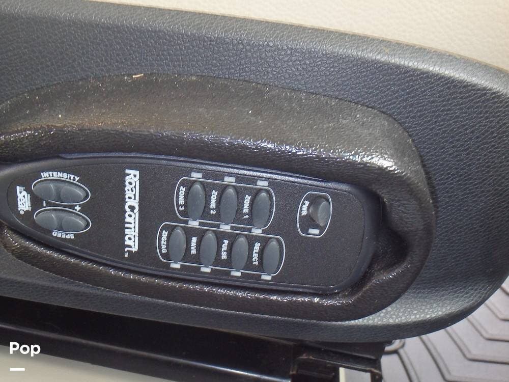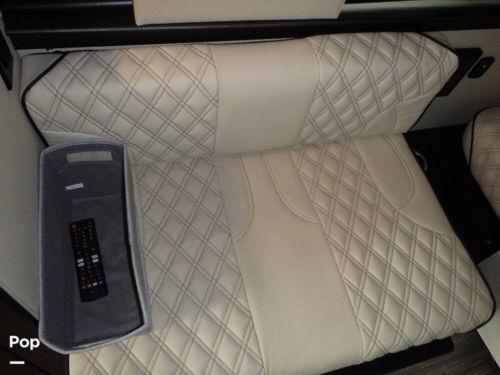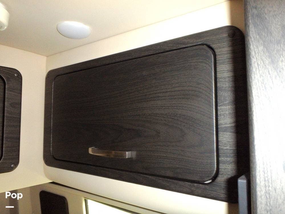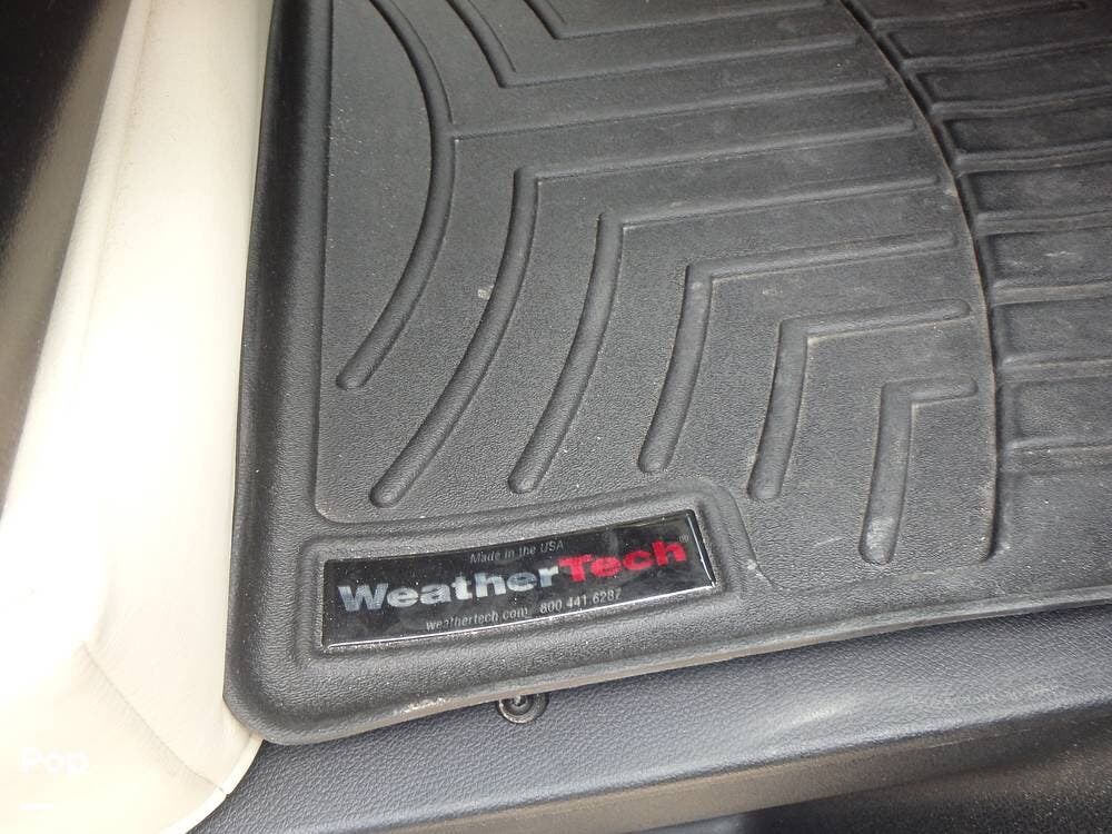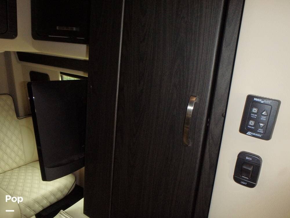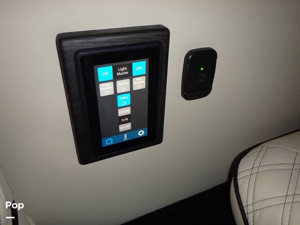 The interior finishes are upscale: solid surface countertops, composite seamless flooring, wood cabinetry (hydro-graphed wood finishes), soft-touch walls, coordinated accents, and custom seating. There are four touchscreen control centers for added convenience. The front cabin area has Weather Tec flooring.