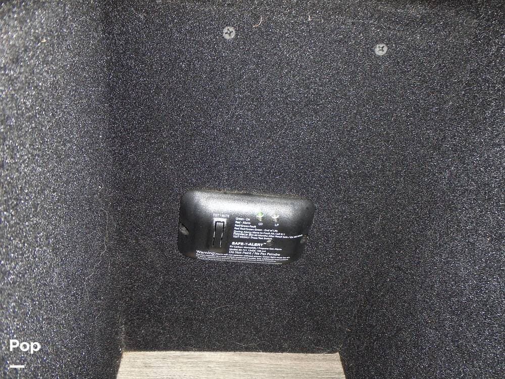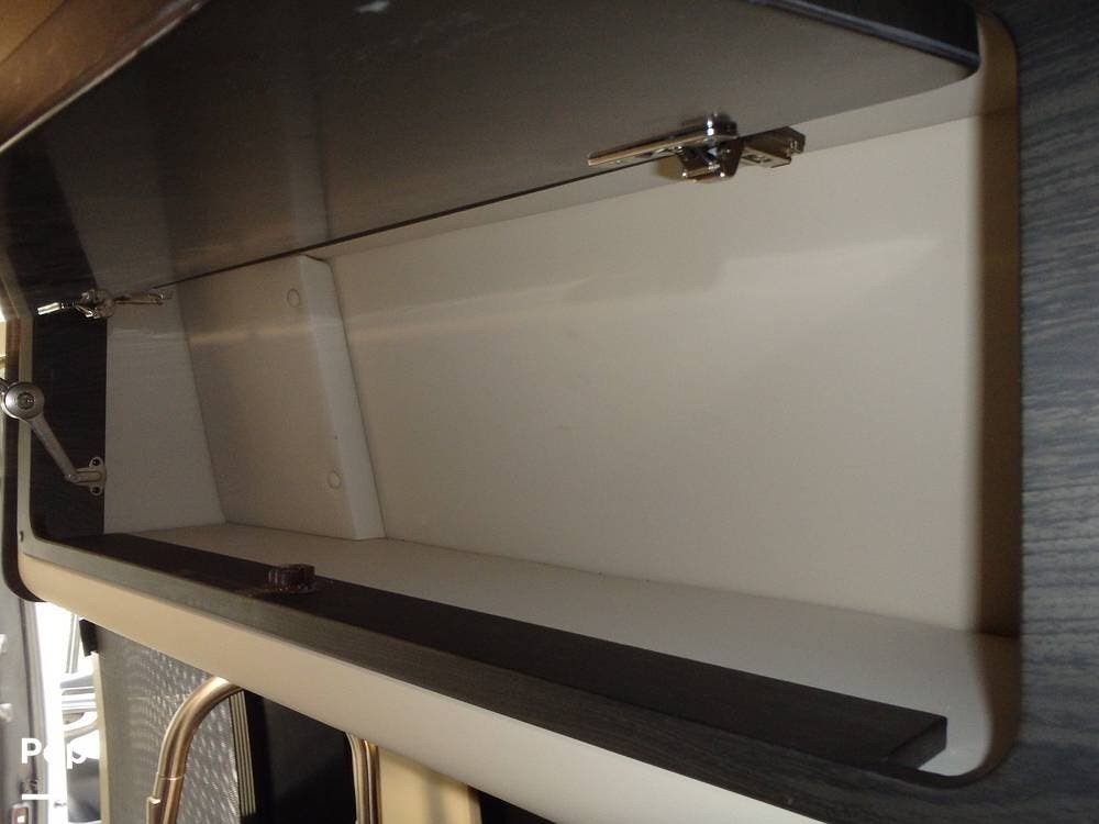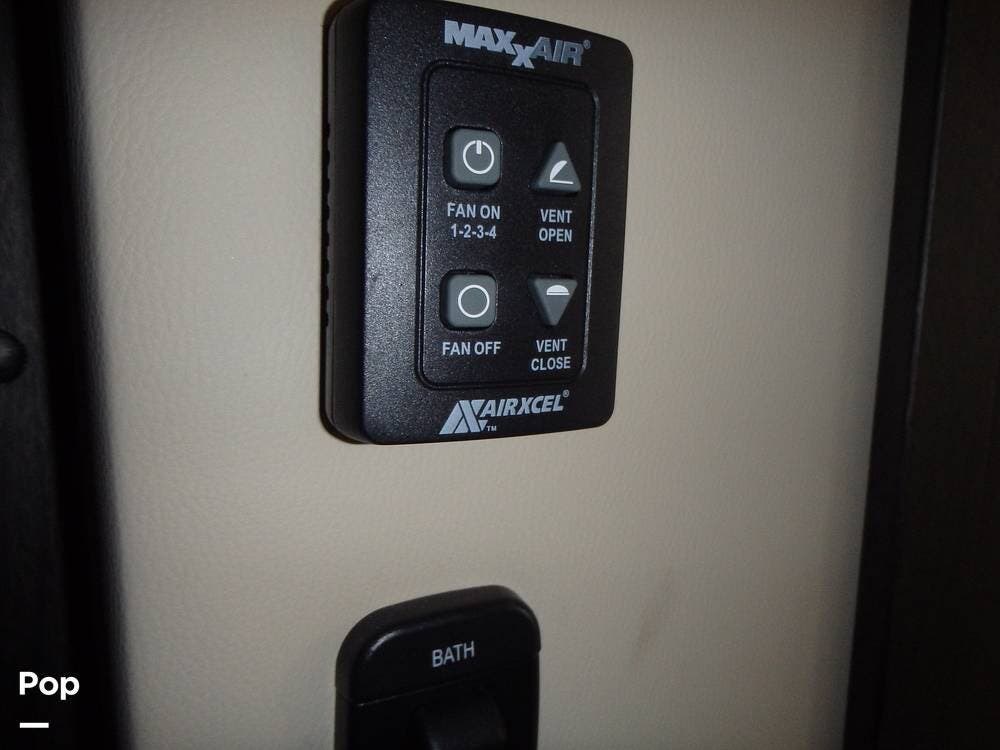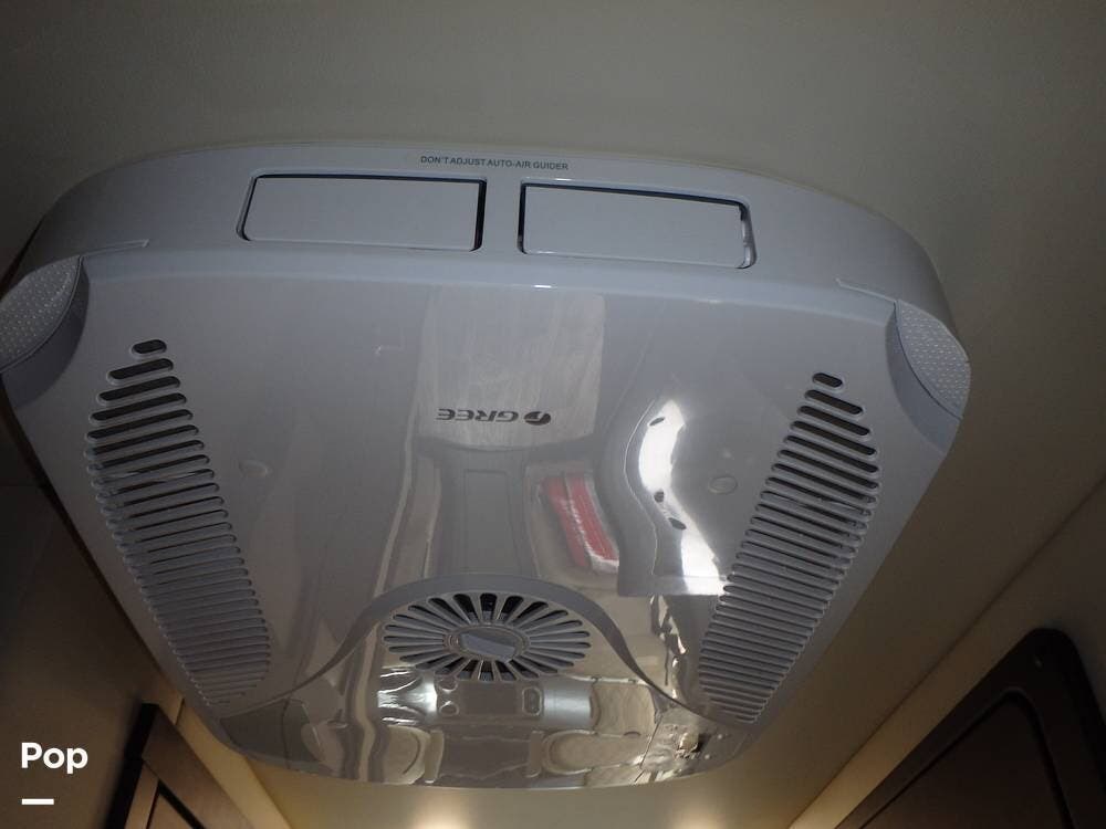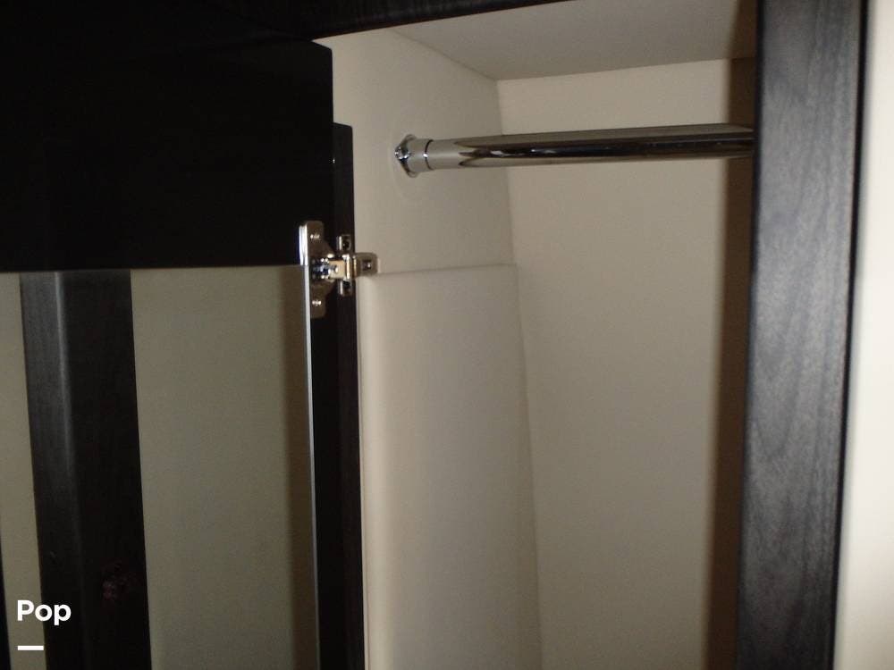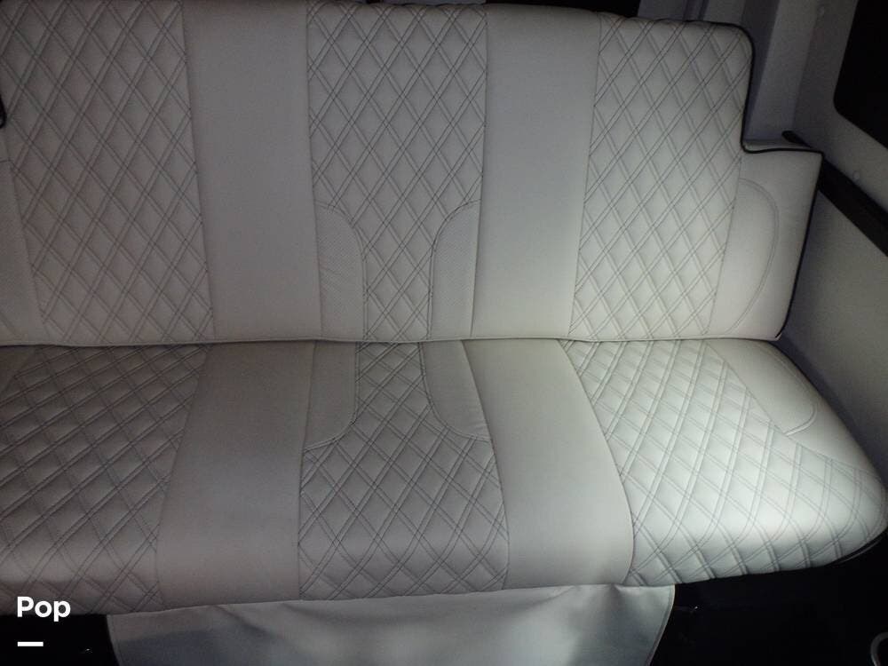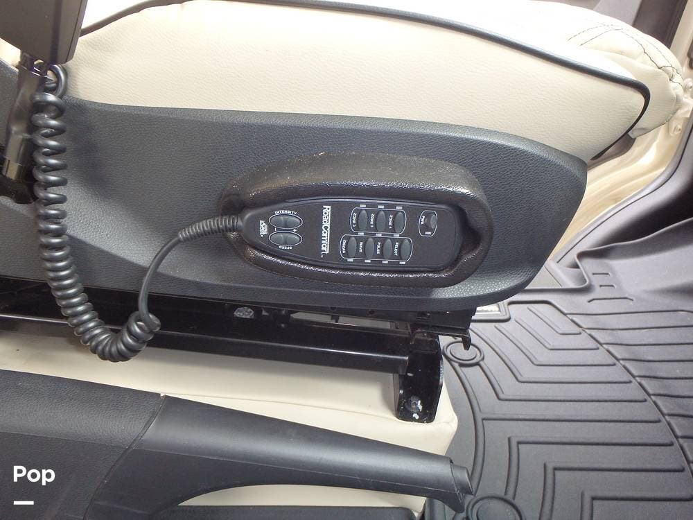 The interior finishes are upscale: solid surface countertops, composite seamless flooring, wood cabinetry (hydro-graphed wood finishes), soft-touch walls, coordinated accents, and custom seating. There are four touchscreen control centers for added convenience. The front cabin area has Weather Tec flooring.