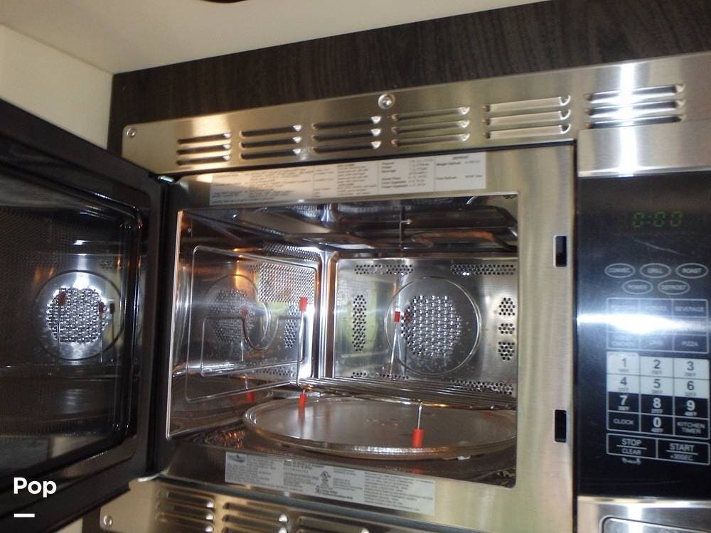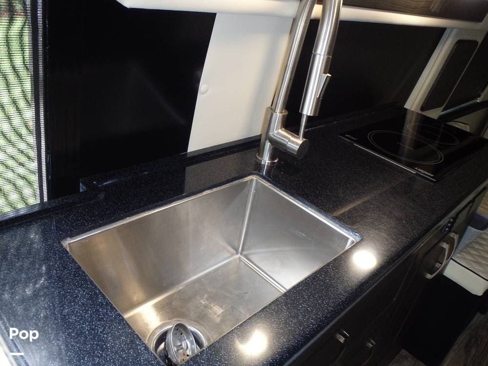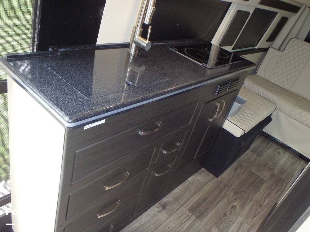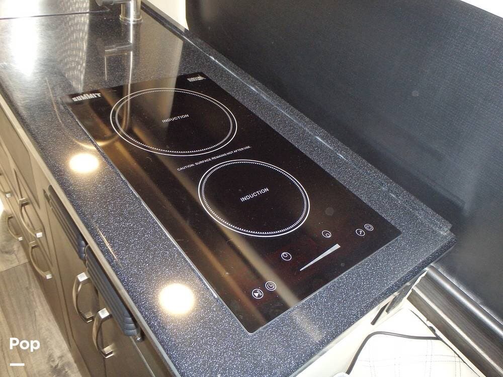 The galley includes a recessed two-burner induction cooktop, convection microwave, and a 12V / 110V stainless steel refrigerator.