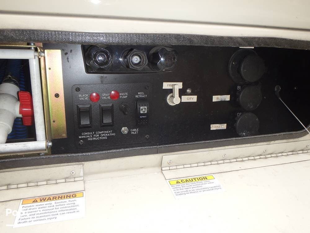 This unit's systems include a Suburban tankless water heater, a diesel & electric coach furnace, roof-top air conditioning (13,500 BTU), 2,000W inverter/charger, digital touch control for coach functions, and full insulation with privacy shade packages.