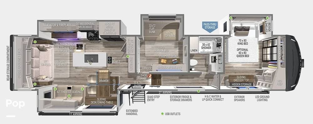 You will be able to relax in the heated reclining theater seats. Next to the tri-fold sofa, you have end tables with pop-up outlets with USB charging ports.