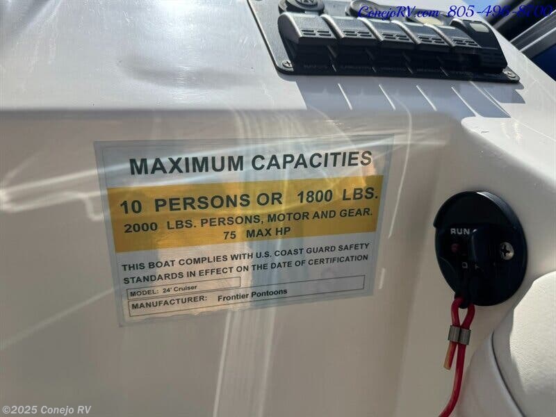 2024 Frontier 24’ Cruiser Pontoon **Our Price Only 29,990** Mercury 4 Stroke 75hp Engine, 24’ Length, Deck Length 21’.2”, Width 8’.2”, 10 Person Capacity, 4 Lounges with under Seat Storage, 3 Entrances, Battery Cutoff Switch, Double Axle Trailer with Spare Tire Included! **Our Price Only $29,990 ** We have some fantastic financing and take trades also! It is our #1 goal that your experience with our company is an enjoyable one with our staff of industry professionals, Conejo Wholesale Auto & RV, Exclusive Ventura County Dealer For Winnebago Navion, Revel, Solis, Ekko, and Travato, All Storyteller Products, Outside Van Syncline and Approach, Tiffin GH1, All Roadtrek Products, We Also Carry Some Quality Pre-Owned Motorhomes which come with Our 45 Day/1000 Mile In-House Warranty at No Charge, Conejo RV, 661 E. Thousand Oaks Blvd, Thousand Oaks, CA 91360, 805-496-8700, Open 7 Days, 9am to 6pm, All Coaches Fully Inspected, Serviced and Detailed, Come Experience the No Pressure No Haggle Sales Approach at Conejo RV, We Also Buy Clean Late Model Coaches, 1 Year Free Camping Membership Included Ask For Details! (***plus tax & license fees***)
