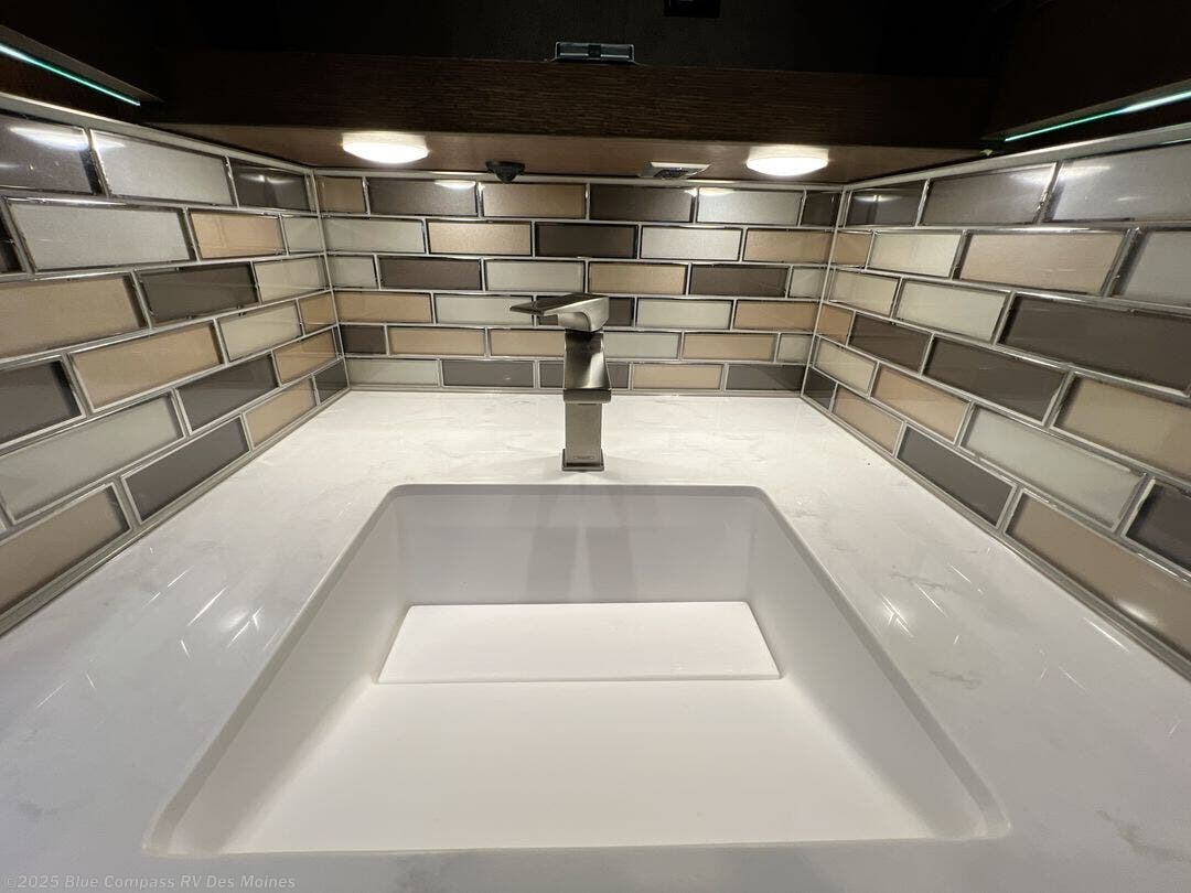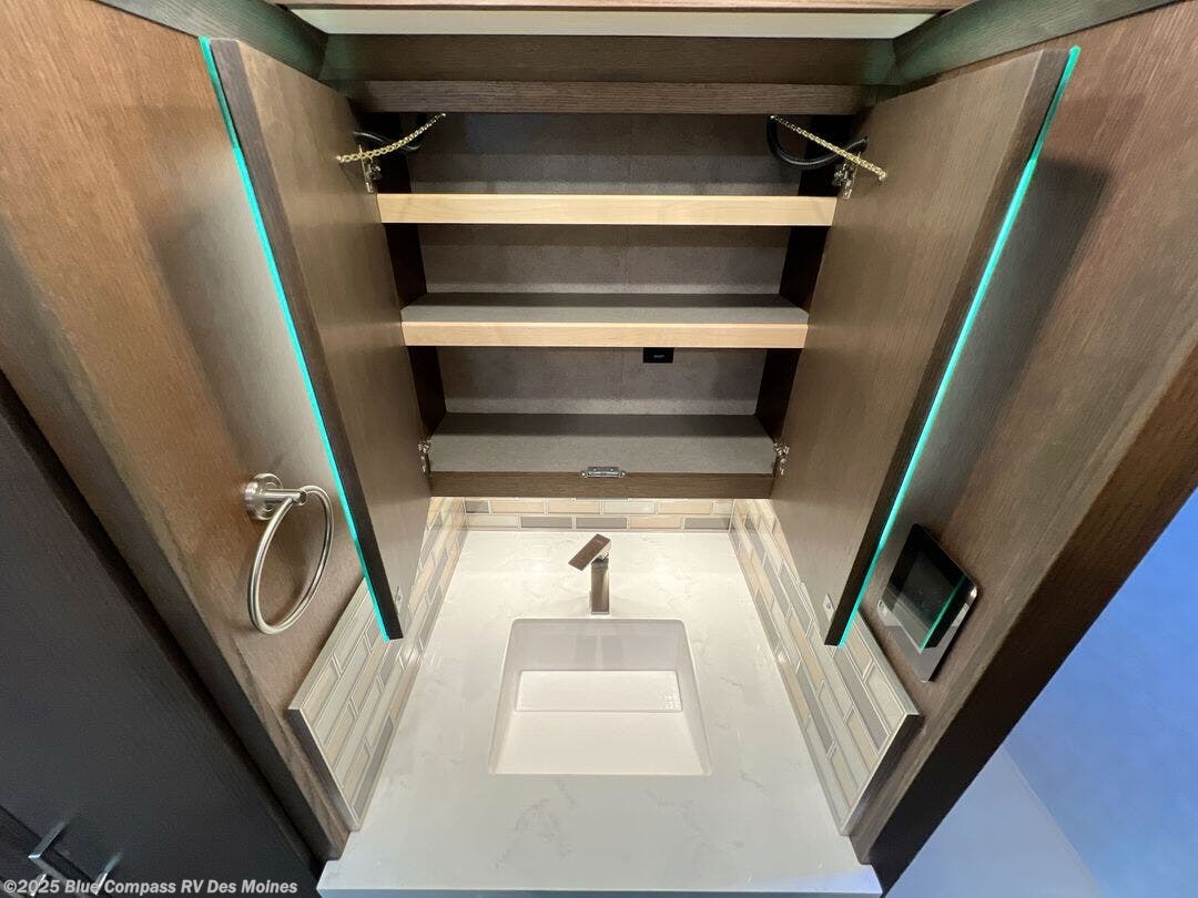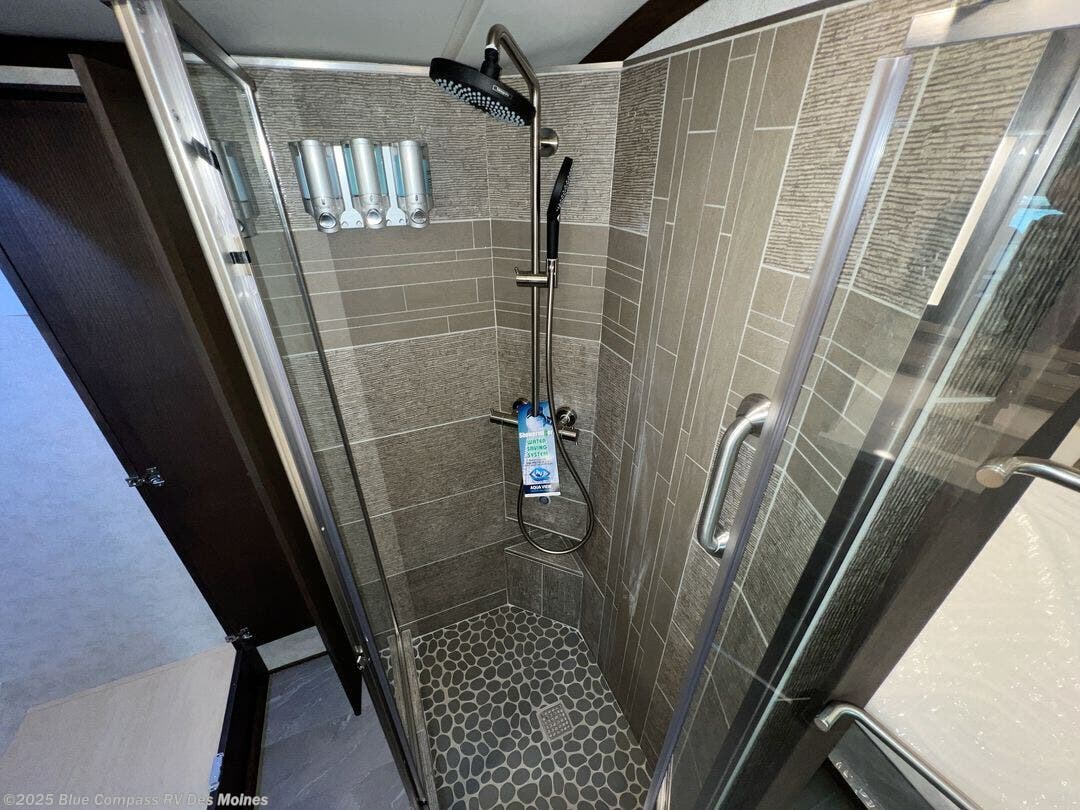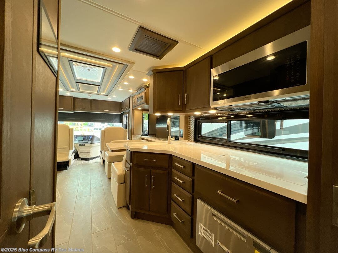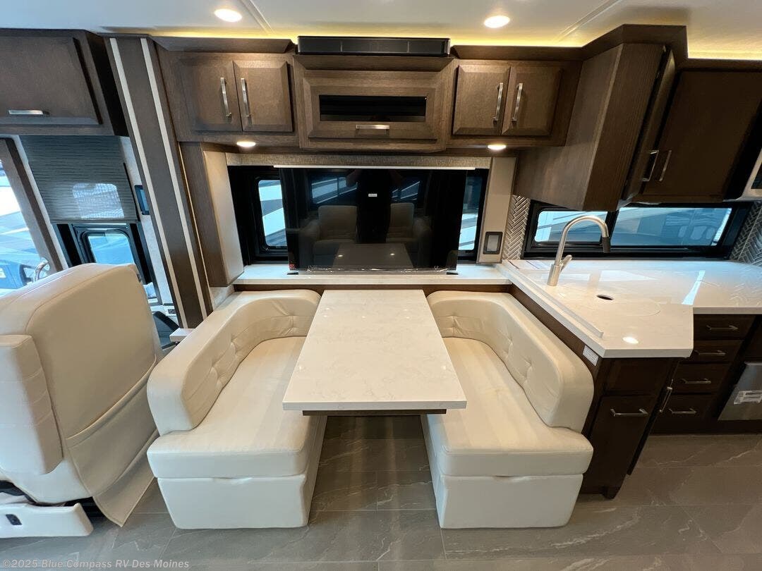 An amazing use of space gives you and your guests plenty of room to enjoy this class A diesel motorhome! The living area offers a 74" visionary sofa as well as a Euro booth dinette, which has two additional folding chairs to accommodate larger parties. A mid-coach half bath is just off the kitchen area. A second bath all the way to the rear off the bedroom allows for extra privacy. The bedroom features a 60" x 80" queen bed and built-in storage with adjustable shelves and a 43" Samsung TV. Sliding doors to the bedroom and rear bath keep your floor space wide open.