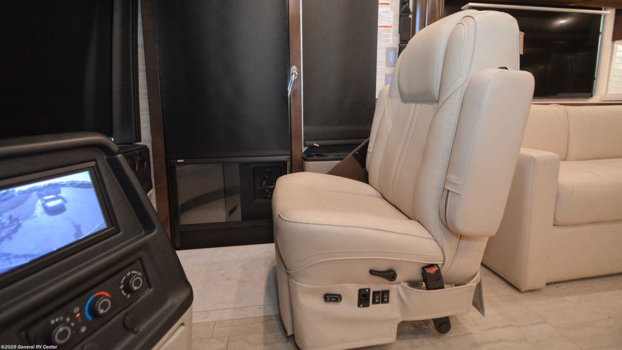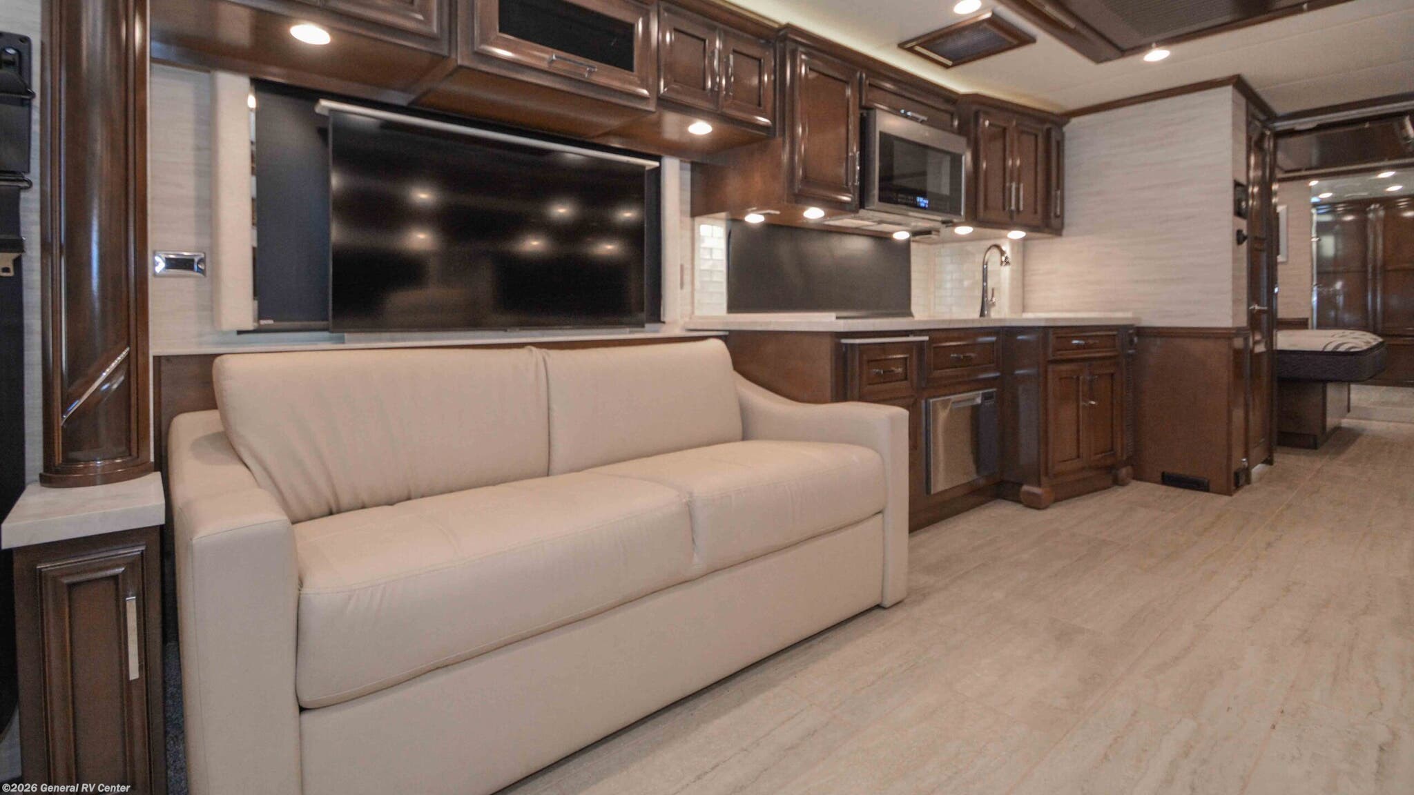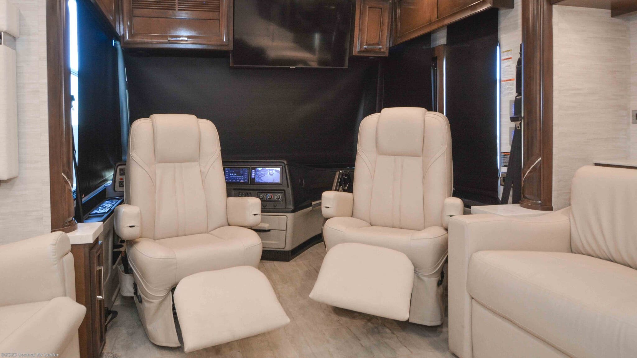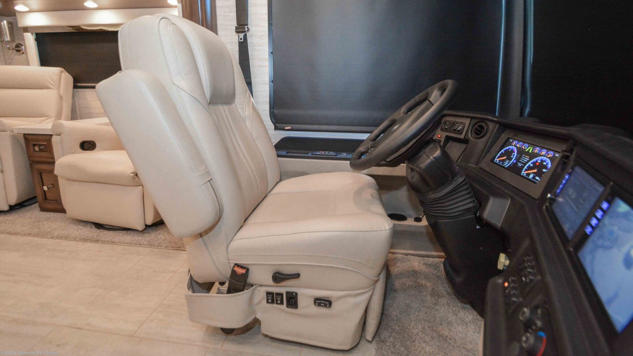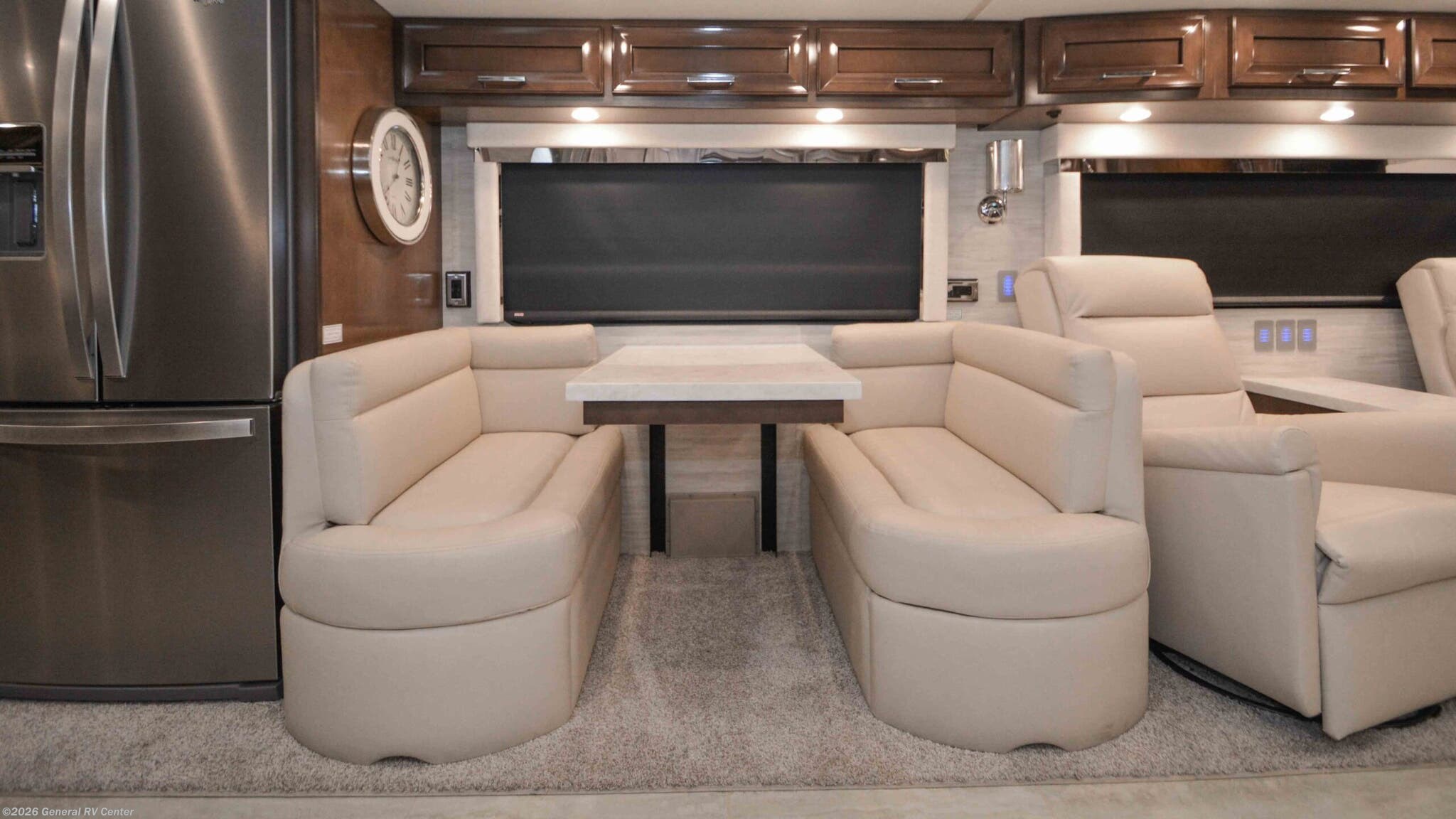 Discover the epitome of luxury and innovation with the 2024 Newmar Ventana 4369. Designed for those who crave adventure without sacrificing comfort, this magnificent diesel pusher offers a harmonious blend of style and functionality. With a spacious floor plan that sleeps up to nine, you'll find a king-sized bed in the master suite and convertible sleeping areas that ensure everyone has a cozy place to rest. The center kitchen is a chef's dream, equipped with a full-size electric refrigerator and convection cooking, perfect for preparing gourmet meals on the road. The Ventana 4369 boasts a front living area that invites relaxation, featuring a plush jack-knife sofa and a side hide-a-bed sofa. Enjoy entertainment on the go with the TV on a power lift, seamlessly integrated into the elegant design. The rear bath offers a touch of spa-like luxury with a roomy shower, while the washer/dryer prep ensures you're ready for extended adventures. With a powerful Cummins I6 Diesel Pusher engine, Freightliner XC-Series chassis, and a tow capacity of 15,000 lbs, your journey will be smooth and powerful. Experience the open road like never before with the Newmar Ventana 4369, and for more details, visit your nearest General RV Dealership.