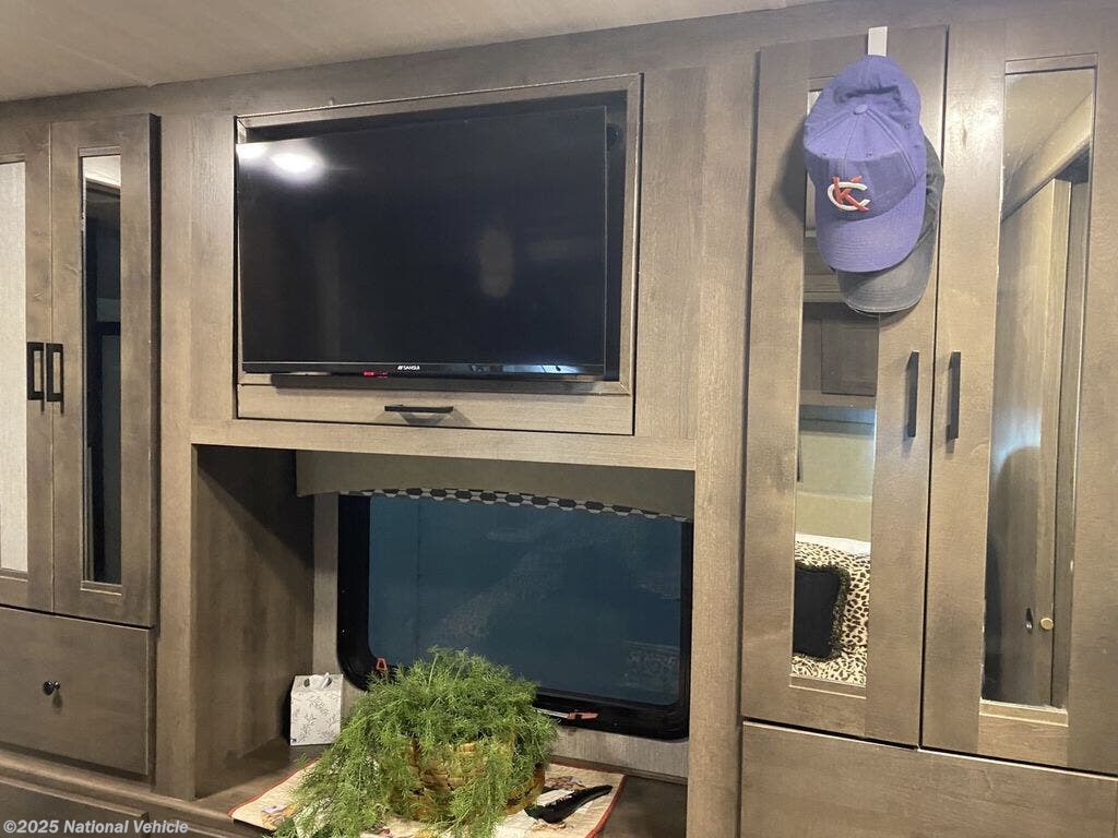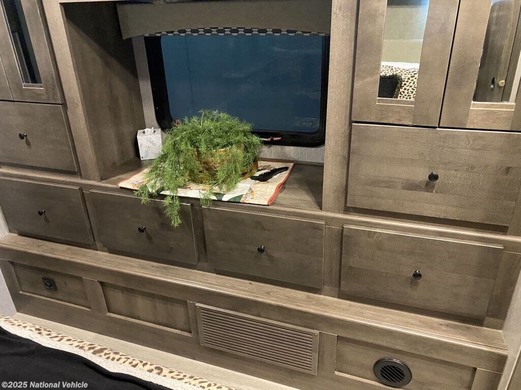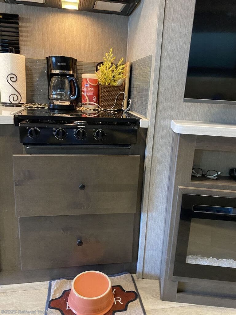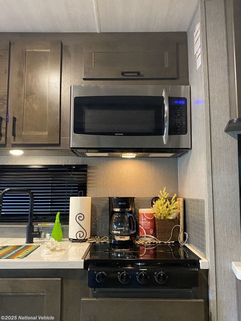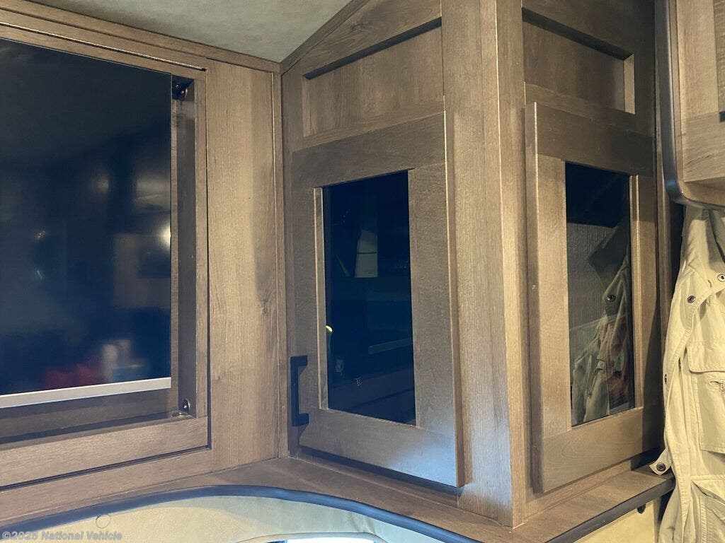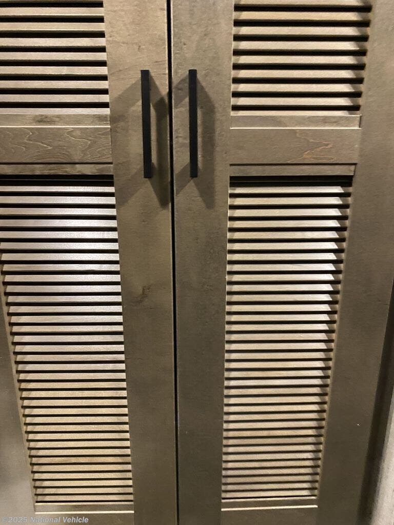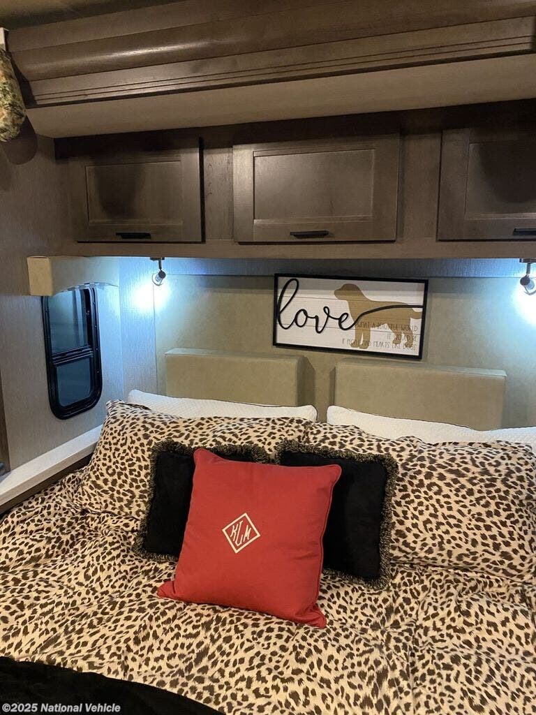 Inside, the Ghost 37DS blends upscale craftsmanship with functional design. From solid surface countertops and stainless steel appliances in the galley to a full-size king bed in the private bedroom, every detail speaks premium. A bath-and-a-half layout, deluxe dinette, tri-fold sofa, and cab over bunk.
