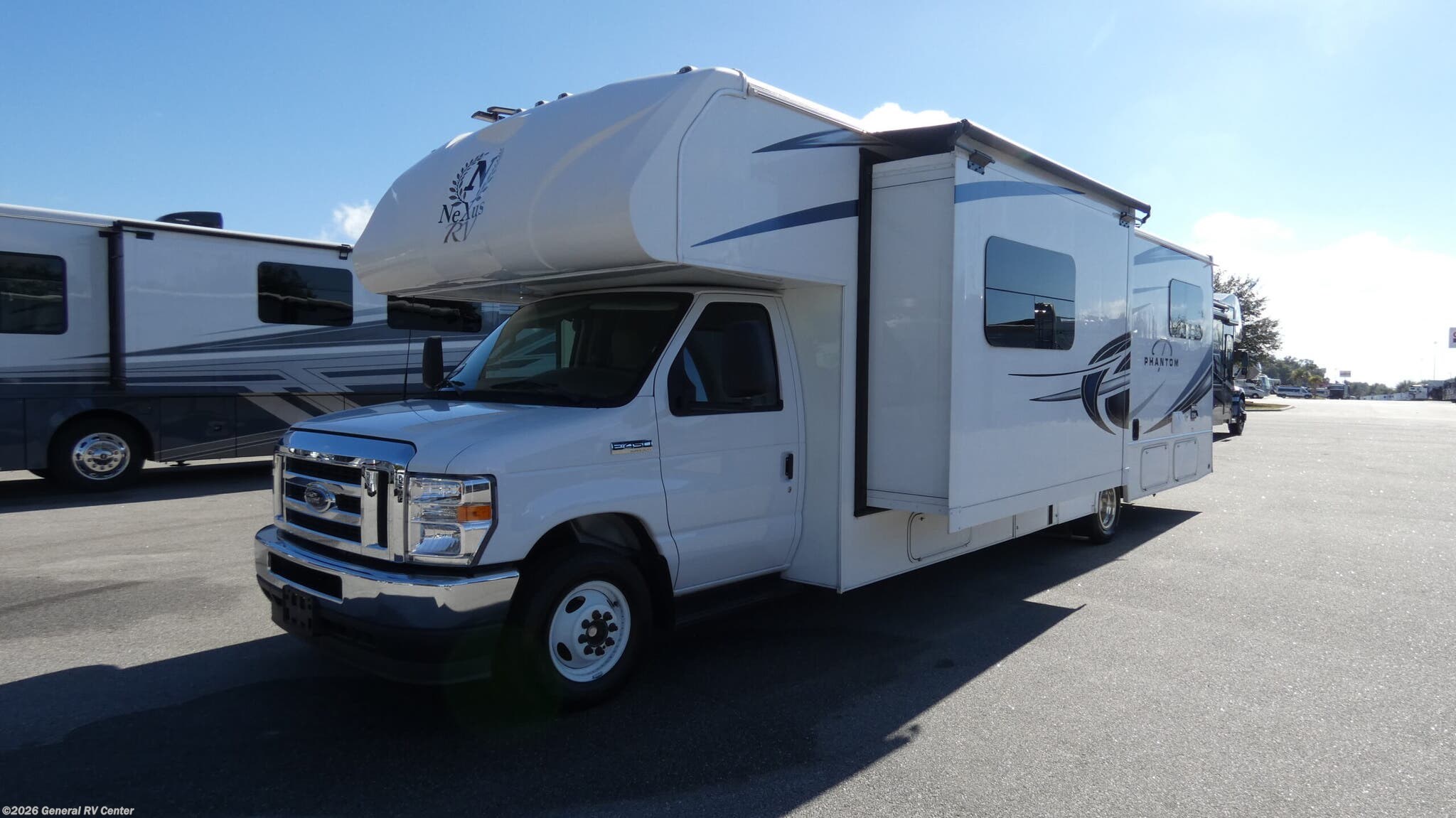 **NeXus Phantom Class C gas motorhome 32P highlights:** - Bunk Beds - Two Lounge Chairs - 10 Cu. Ft. Refrigerator - Rear Bedroom Bring along extra family members or friends in this Phantom Class C gas motorhome! The full bathroom allows you and your fellow travelers to stay clean, and the shower skylight allows you to see clearly as you get clean. The booth dinette is a great spot to sit down for breakfast, and there are also two lounge chairs in the main living area for relaxing. If you have a big group, you'll certainly appreciate the set of bunk beds that rest upon a slide across from the bathroom, and the wardrobe closet also rests on this slide next to the bunks and across from the queen-size bed in the bedroom. Don't pass by the well-constructed NeXus Phantom Class C gas motorhome! You will be very impressed with its solid and reliable design that will allow you to travel for years and years without any concern. The high-strength low-alloy lightweight steel cage forms the base of every Phantom, and the seamless fiberglass roof adds great protection over your heads. You'll find an outside shower to use whenever you need to get some mud off your shoes, and the Winegard 360 antenna gives you a great solution for your internet needs. You'll even be able to spend some time outside in the afternoon sun because you can use the electric awning with LED lights for a covering when you start to burn.