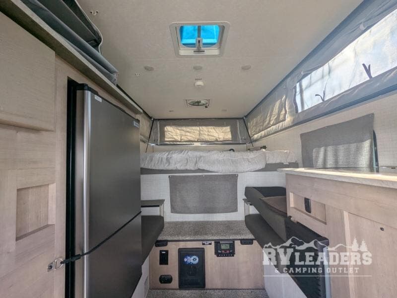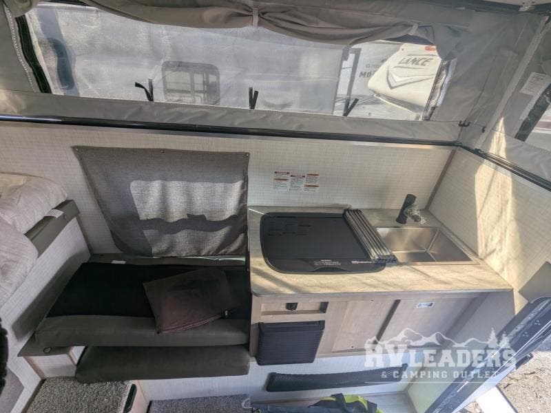 Cozy & clever interior: Features a smart hand-pump kitchen faucet, porta-potty cabinet, dual bench dinette (converts to a bed), and ample storage nooks for snacks and gear.