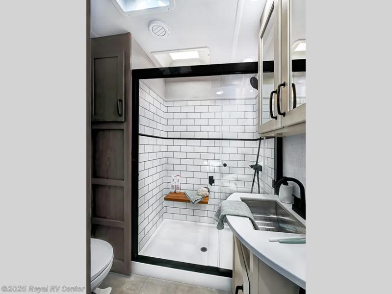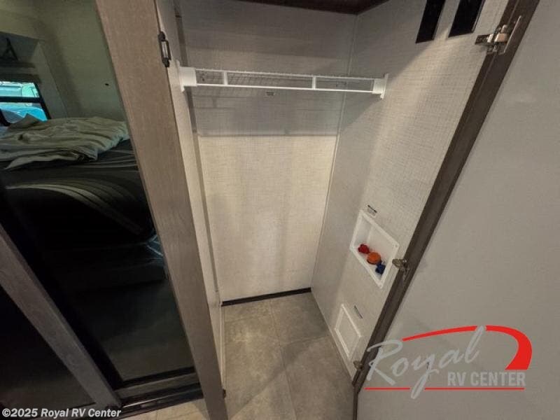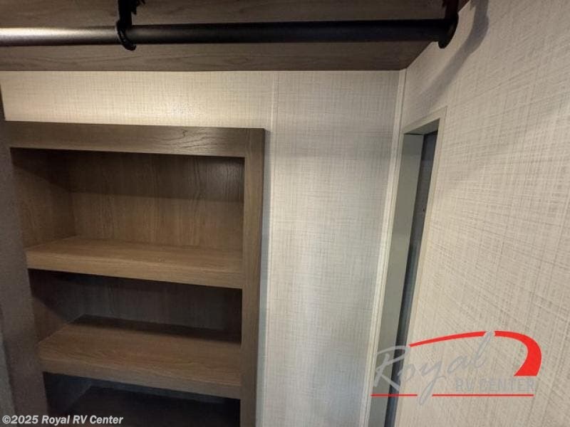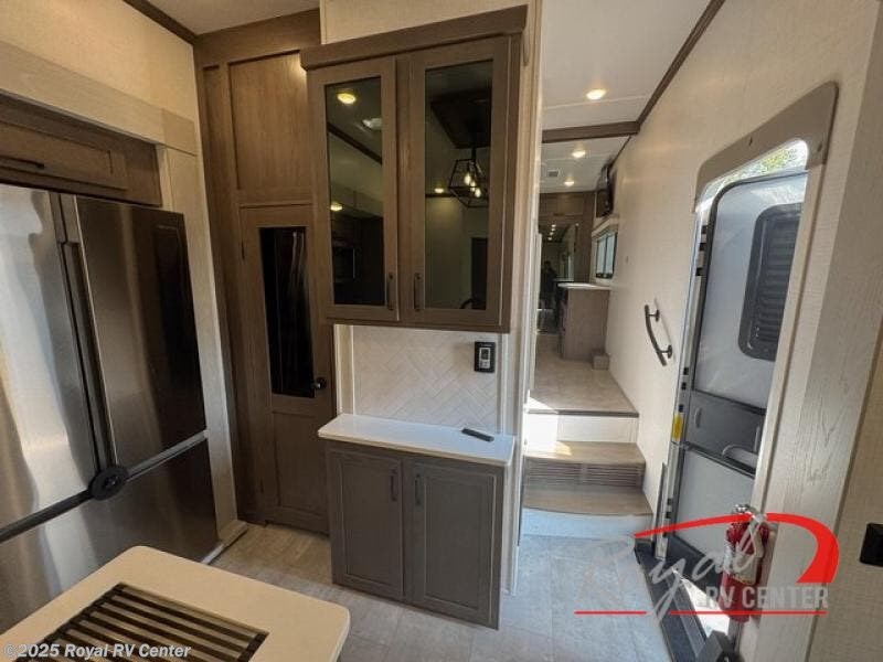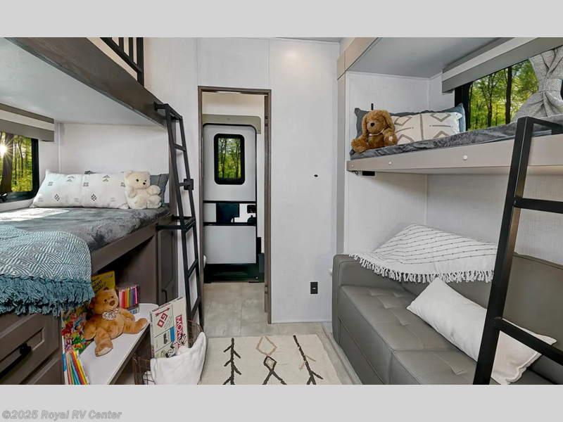 This fifth wheel is decked out with so much luxury you won't even feel like you're camping! The private bunkhouse has 38" x 71" bunks, a 30" x 68" flip bunk above a 68" tri-fold sofa slide, and its very own full rear bathroom with its own rear exit door to the unit. The chef can prepare their best home cooked meals with the kitchen island and store the dishes in the hutch. Enjoy a cozy evening indoors by the fireplace at the entertainment center while relaxing on either the theater seating or sofa with a table. Get a good night's rest each night on the 72" x 80" king bed slide in the front private bedroom and store your clothes in the front wardrobe. There is also washer and dryer prep with a removable shelf if you want the option to make wash day easier than ever!