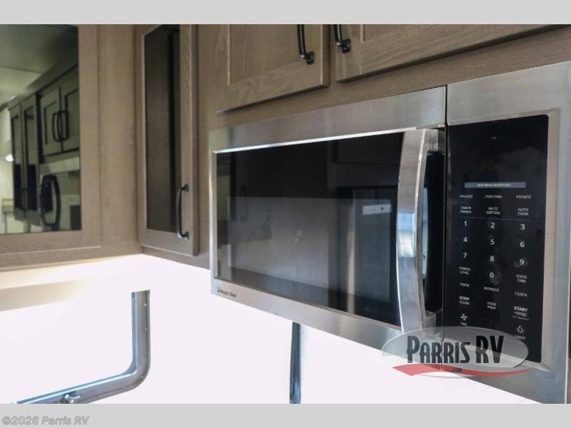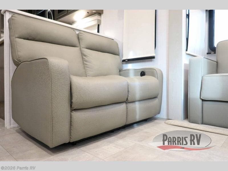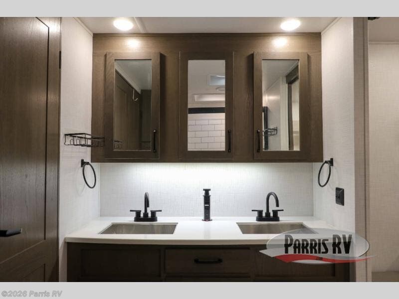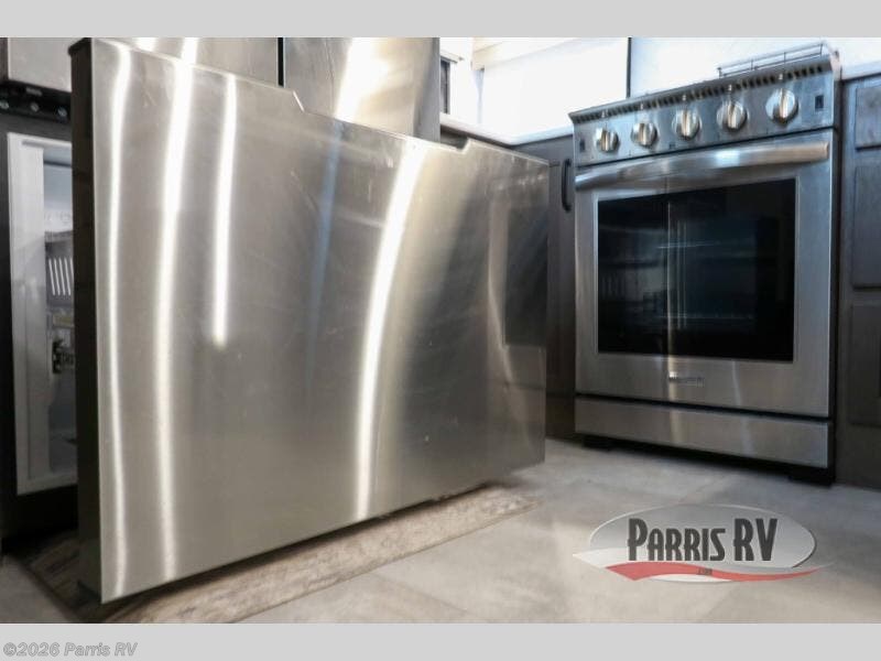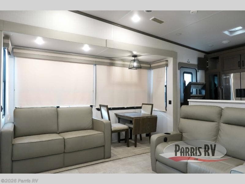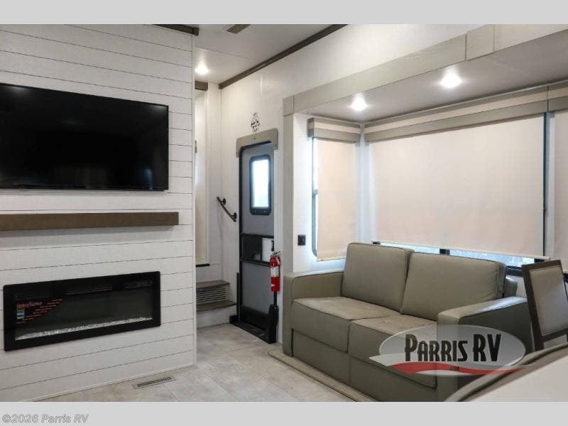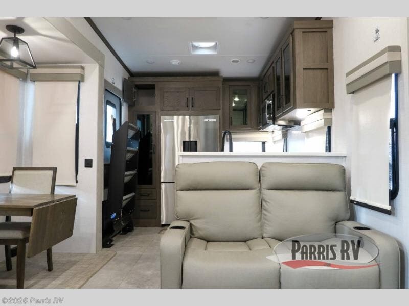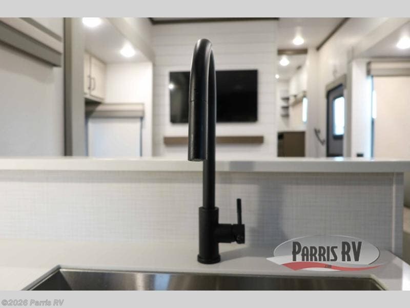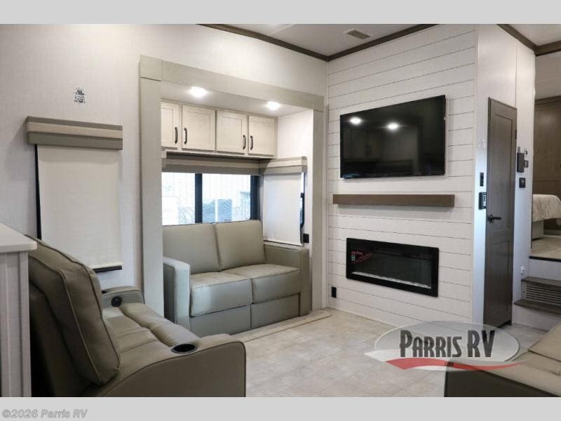 You won't believe all that this fifth wheel has to offer! Starting with the rear kitchen which has plenty of countertop space to prepare your delicious meals, a four burner cooktop with an Insignia 24" residential oven to cook them, and a large single bowl stainless steel sink for easy clean up. The living area has opposing tri-fold sofas and a 54" theater seat with USB charging and storage across from an entertainment center with 50" Smart TV. The half bathroom is close to the living area so you can get back to watching your movie faster. You will feel right at home sleeping in the master suite on a slide out king bed across from a dresser and bench where you can sit while you put on your shoes, plus entrance into the front full bathroom. Inside the bathroom, you will find a vanity with dual sinks for two to get ready at once, a large signature spa shower with a seat, and a walk-in closet with a second dresser plus washer and dryer prep!