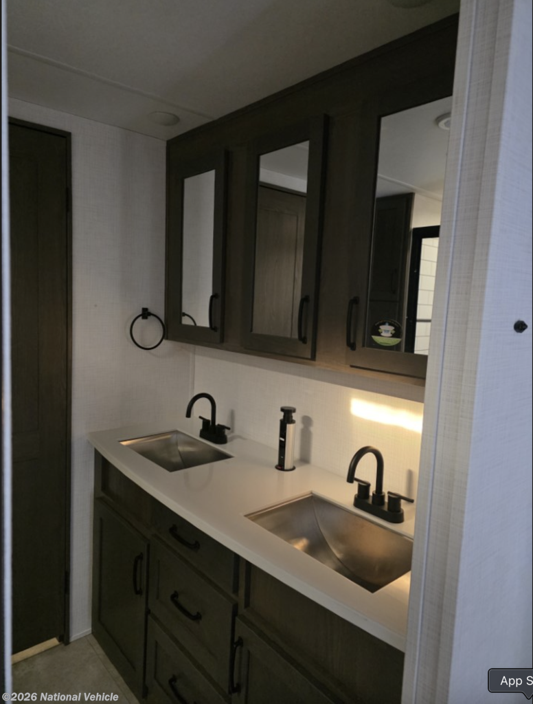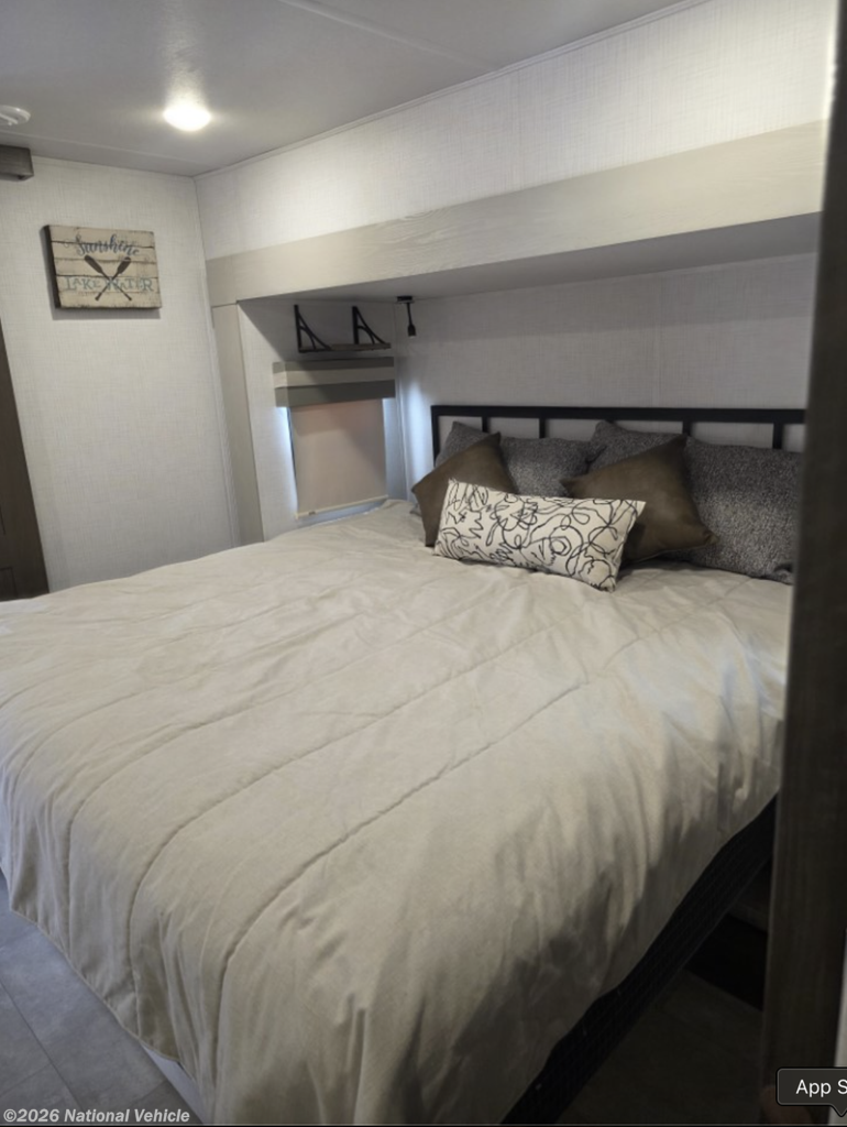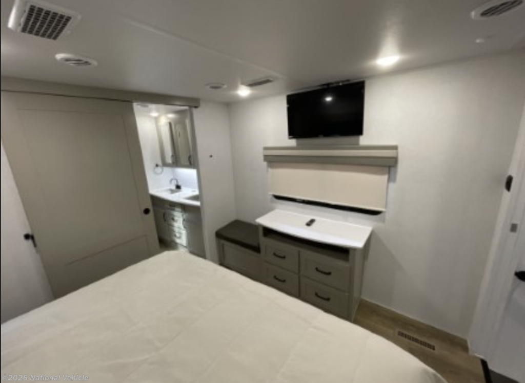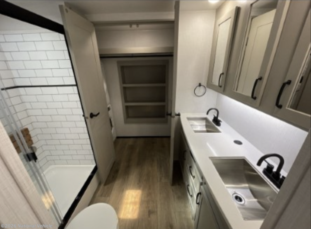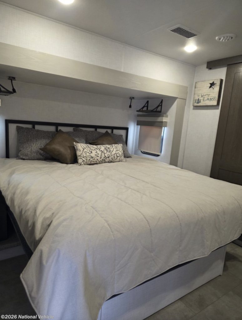 The private front bedroom offers a king bed slide, generous wardrobe space, and a deluxe bathroom with dual sinks, a spacious shower, and linen storage. High-end finishes throughout, including hardwood cabinetry, premium flooring, and LED lighting, elevate the interior experience. With wide-body construction, auto-leveling system, and weather-ready insulation, the 2024 Columbus 384RK delivers both comfort and durability?an ideal fifth wheel for those who refuse to compromise on quality or style.