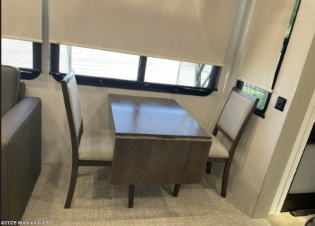 At the heart of the coach is a beautifully appointed rear kitchen, fully equipped with stainless steel appliances, solid surface countertops, a residential refrigerator, large pantry, and ample prep space?perfect for those who love to cook on the road. Just steps away, the elevated living area features opposing slides, theater seating, dual tri-fold sofas, and an entertainment center with a large LED TV, creating a cozy retreat for relaxing or entertaining guests.