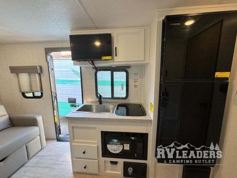 Head to your favorite spot with your favorite person in this travel trailer! The front Murphy bed offers versatility with a sofa to sit on during the day and a 60" x 80" queen bed to sleep on at night, plus there are wardrobes on either side for your clothes. Prepare your best home cooked meals with the two burner cooktop, 10 cu. ft. refrigerator, and even the microwave then enjoy them at the 38" x 70" booth dinette slide which can be transformed into an extra sleeping space. You even have an entertainment center for those days when mother nature rains on your parade. The full rear bathroom has a 32" x 32" radius shower to clean up in after a fun day at the beach and a linen closet to keep your towels close. The exterior has a 14' power awning with LED lights to highlight the good times and front outside storage to bring all of your camping necessities!