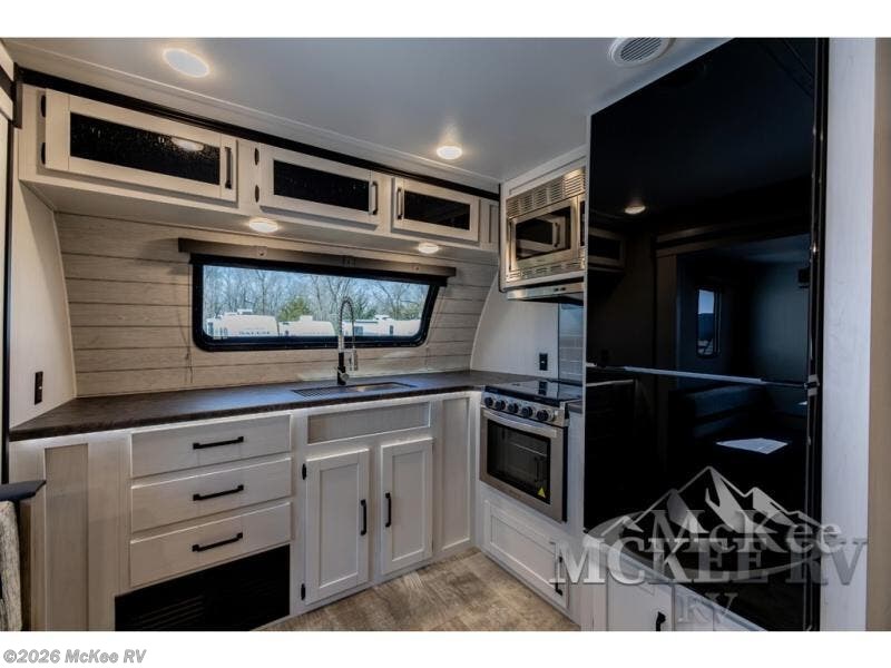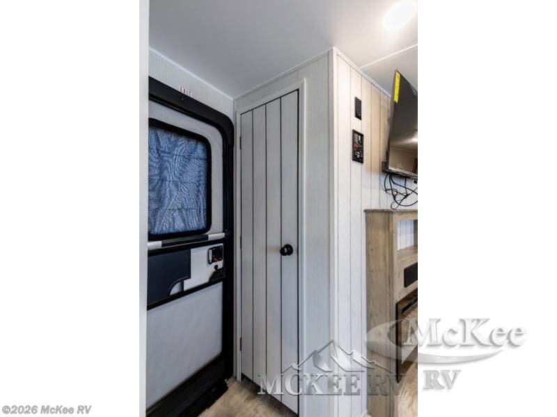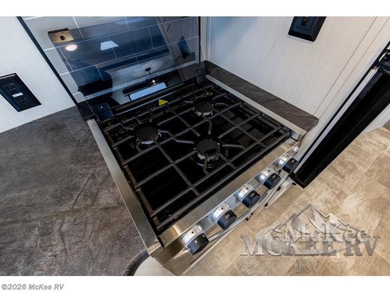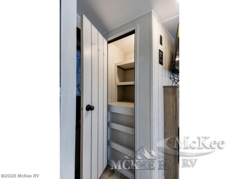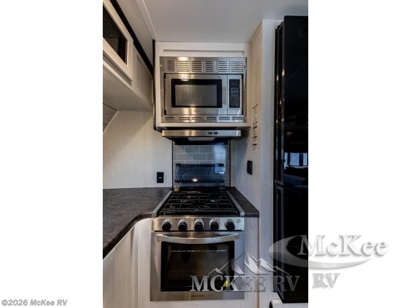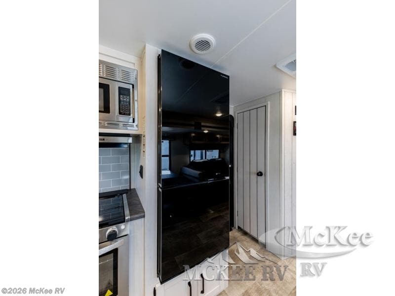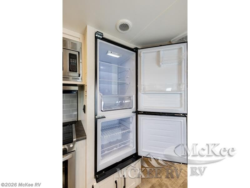 Walk into this travel trailer with one of the dual entry doors for a great camping trip! One entrance enters directly into the rear private bedroom which has a queen bed slide, a walk-in closet with washer and dryer prep, a wardrobe, and even an entrance into the dual entry bathroom. Grab a snack from the walk-in pantry then relax on the sofa while you watch a movie with the entertainment center or play a game at the booth dinette. The front kitchen has everything you will need to prepare your best home cooked meals including lots of countertop space, a three burner cooktop, and a stainless steel refrigerator.