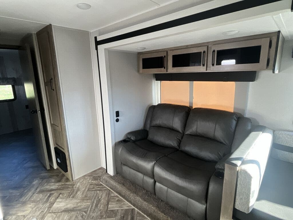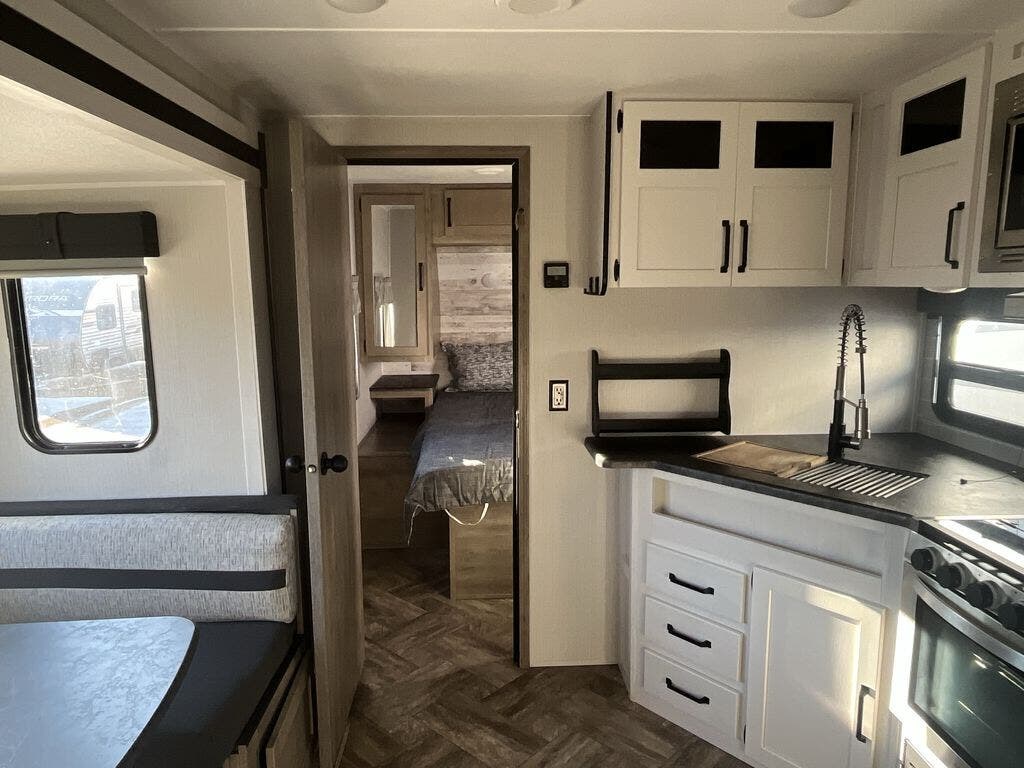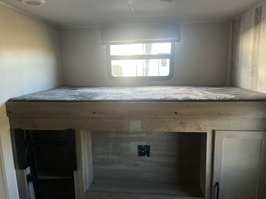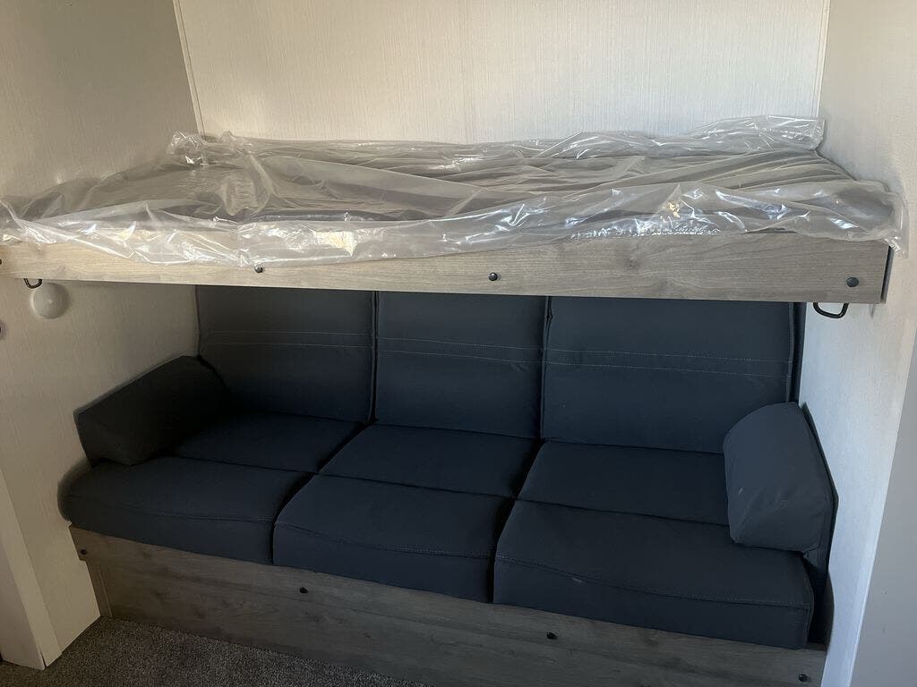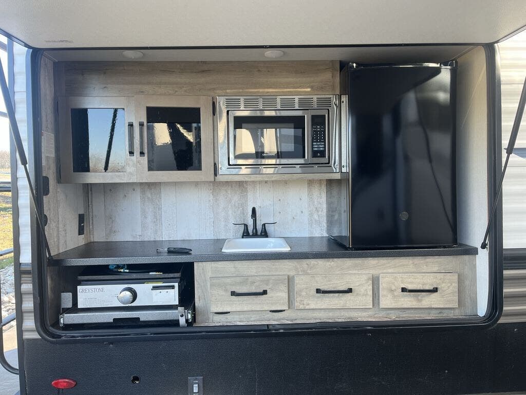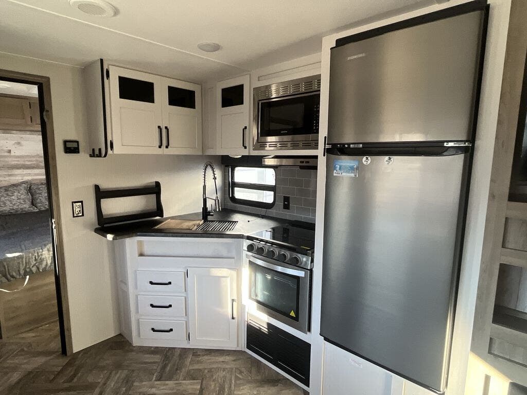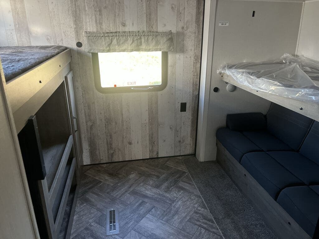 The kids will love having their own rear private bunkhouse in this travel trailer! Inside the bunkhouse is a 38" x 76" bunk above an entertainment center, a closet, and a 32" x 69" bunk above a jiffy sofa slide. The full bathroom with a 34" x 34" radius shower is just outside the bunkhouse for them to easily access it at night. They can even invite a friend or two to tag along and sleep on the sofa and U-shaped dinette once converted. Behind the entertainment center is a closet/pantry to keep your favorite snacks and the kitchen has an 11 cu. ft. stainless steel refrigerator to keep your beverages cold. When you're ready to wind down your nights, head to the front private bedroom and relax on the queen bed with shirt closets and nightstands on either side of it, plus it has one of the dual entry doors to the unit! This model also includes two outside kitchen options if you enjoy cooking in the fresh outdoors!