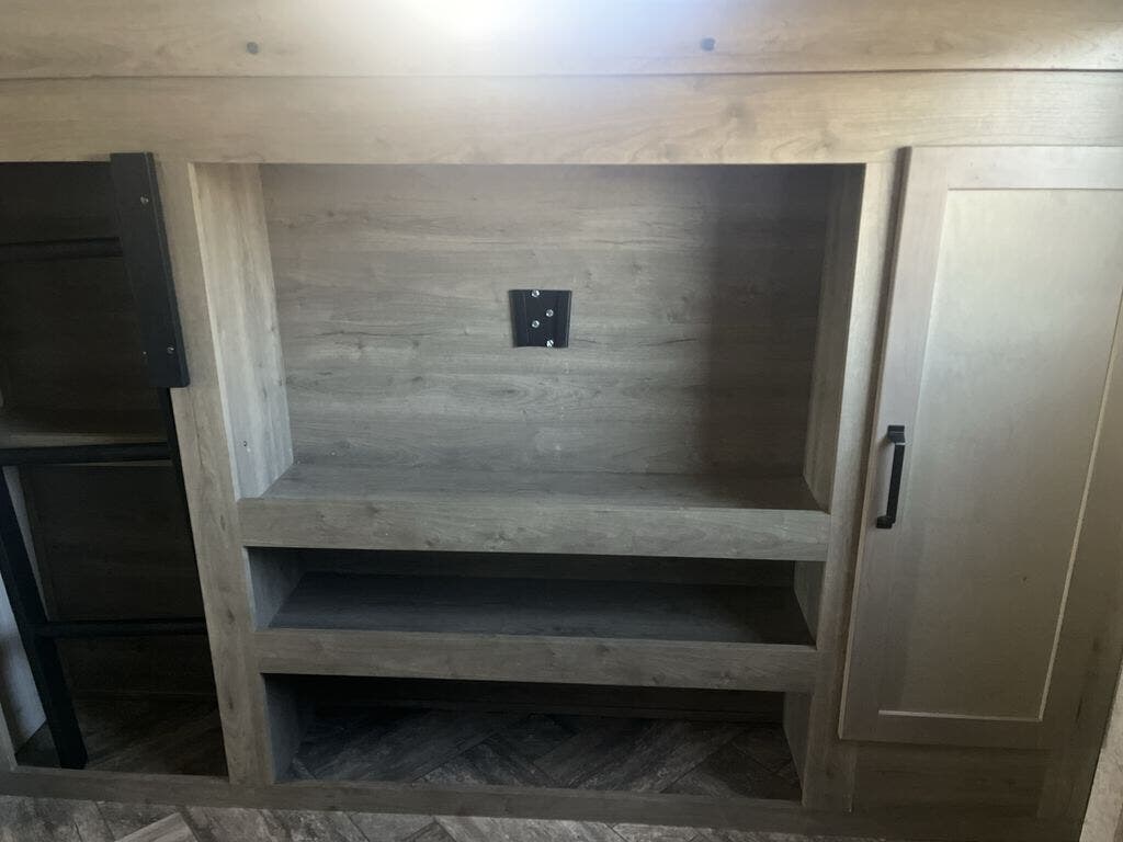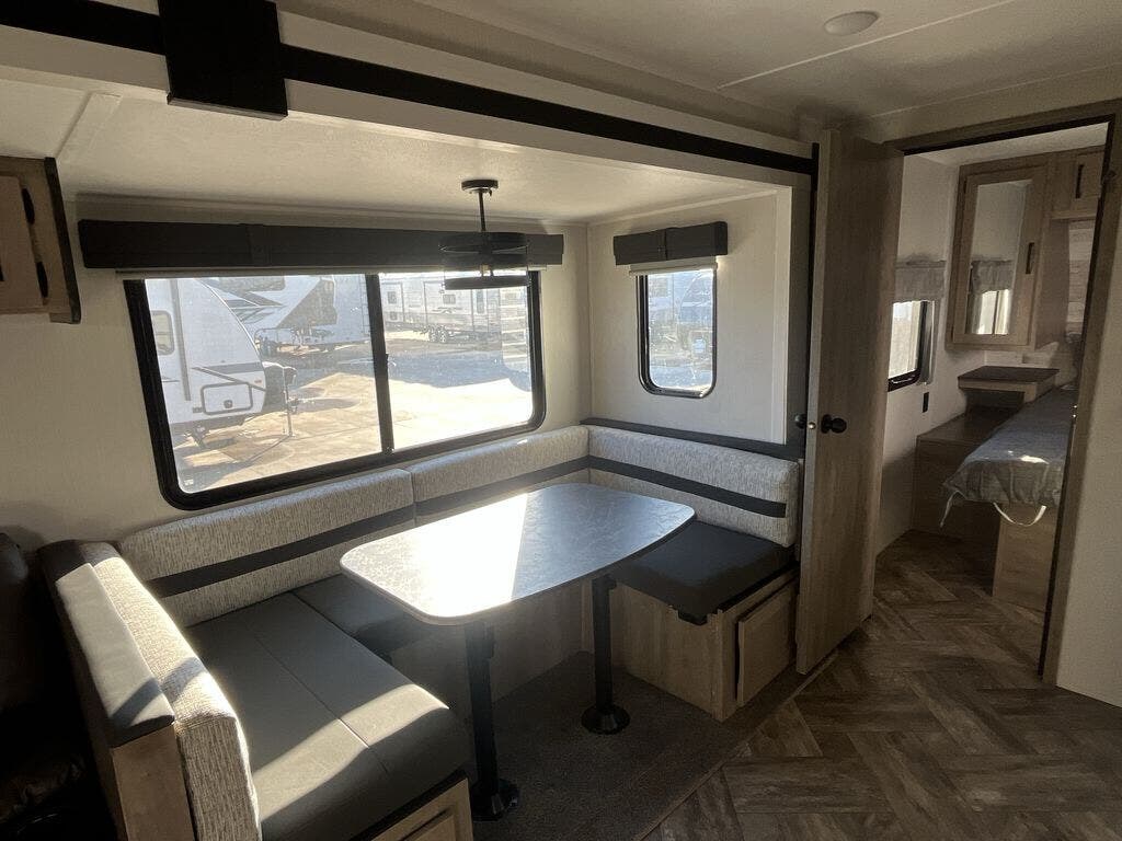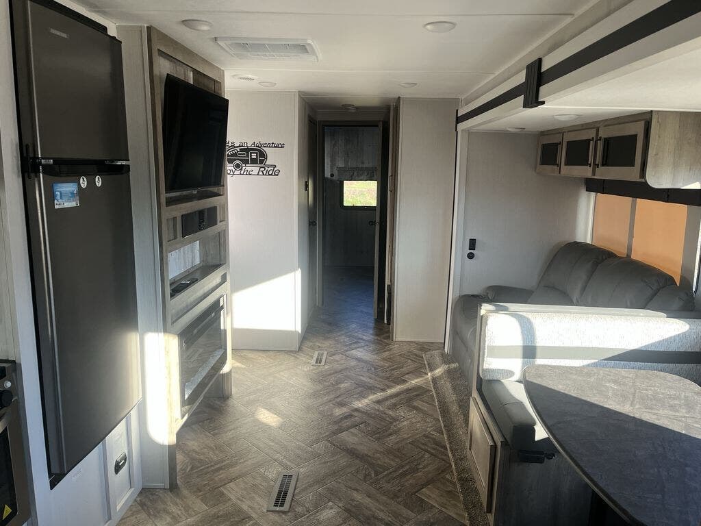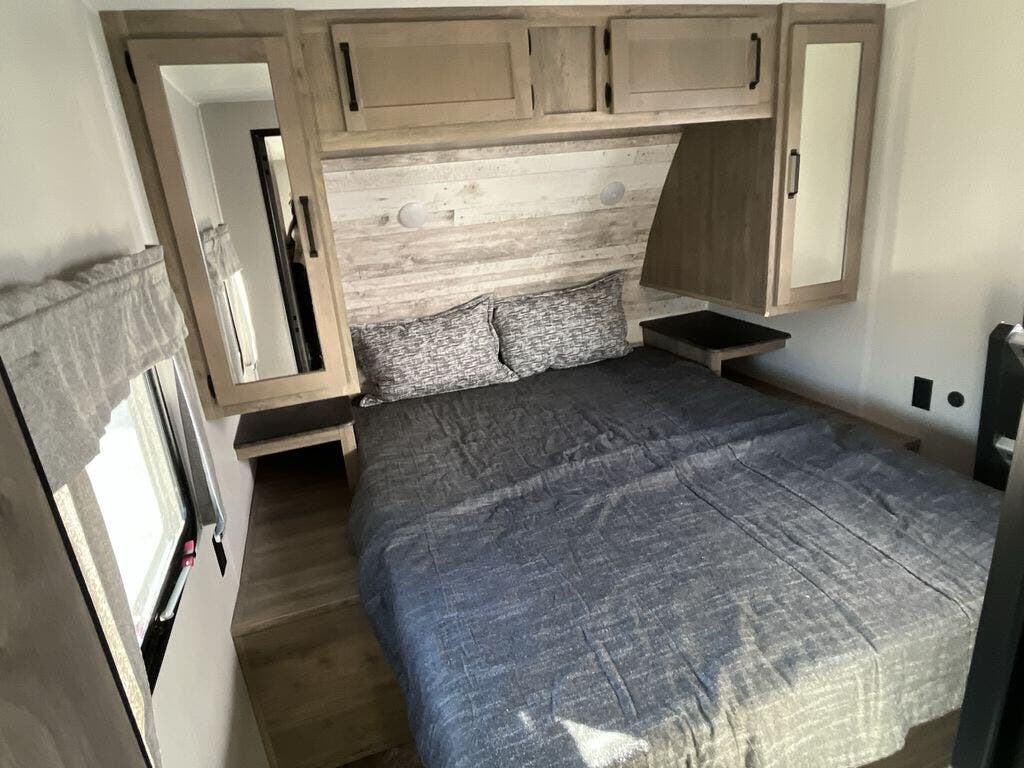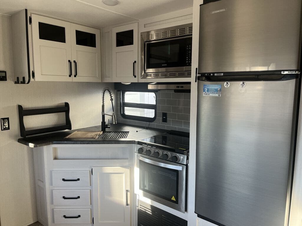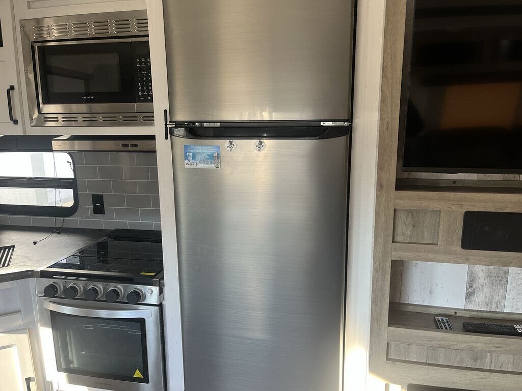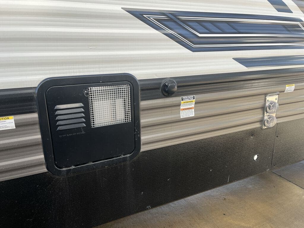 The kids will love having their own rear private bunkhouse in this travel trailer! Inside the bunkhouse is a 38" x 76" bunk above an entertainment center, a closet, and a 32" x 69" bunk above a jiffy sofa slide. The full bathroom with a 34" x 34" radius shower is just outside the bunkhouse for them to easily access it at night. They can even invite a friend or two to tag along and sleep on the sofa and U-shaped dinette once converted. Behind the entertainment center is a closet/pantry to keep your favorite snacks and the kitchen has an 11 cu. ft. stainless steel refrigerator to keep your beverages cold. When you're ready to wind down your nights, head to the front private bedroom and relax on the queen bed with shirt closets and nightstands on either side of it, plus it has one of the dual entry doors to the unit! This model also includes two outside kitchen options if you enjoy cooking in the fresh outdoors!