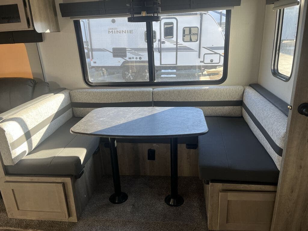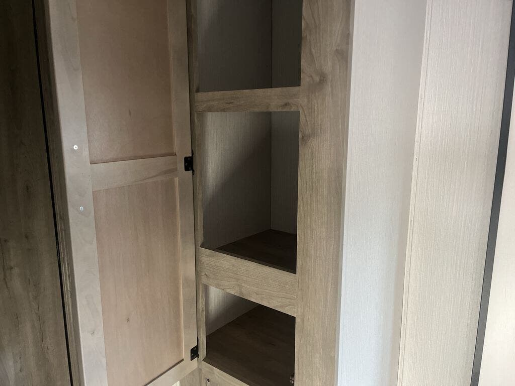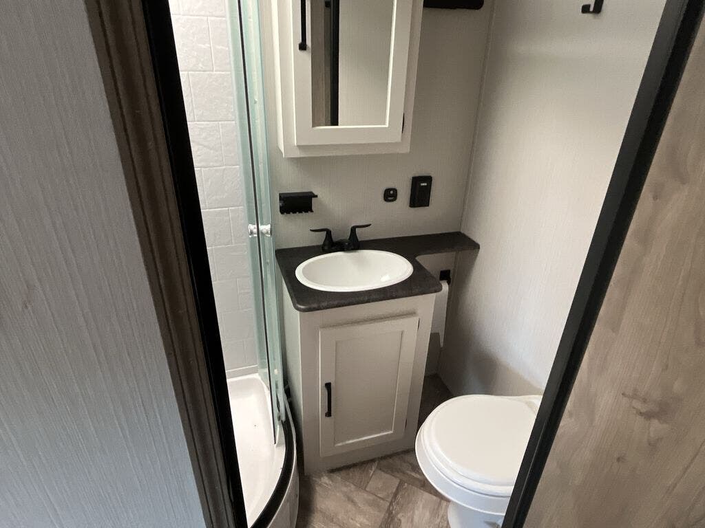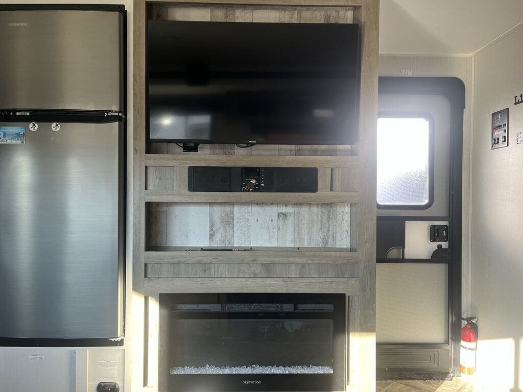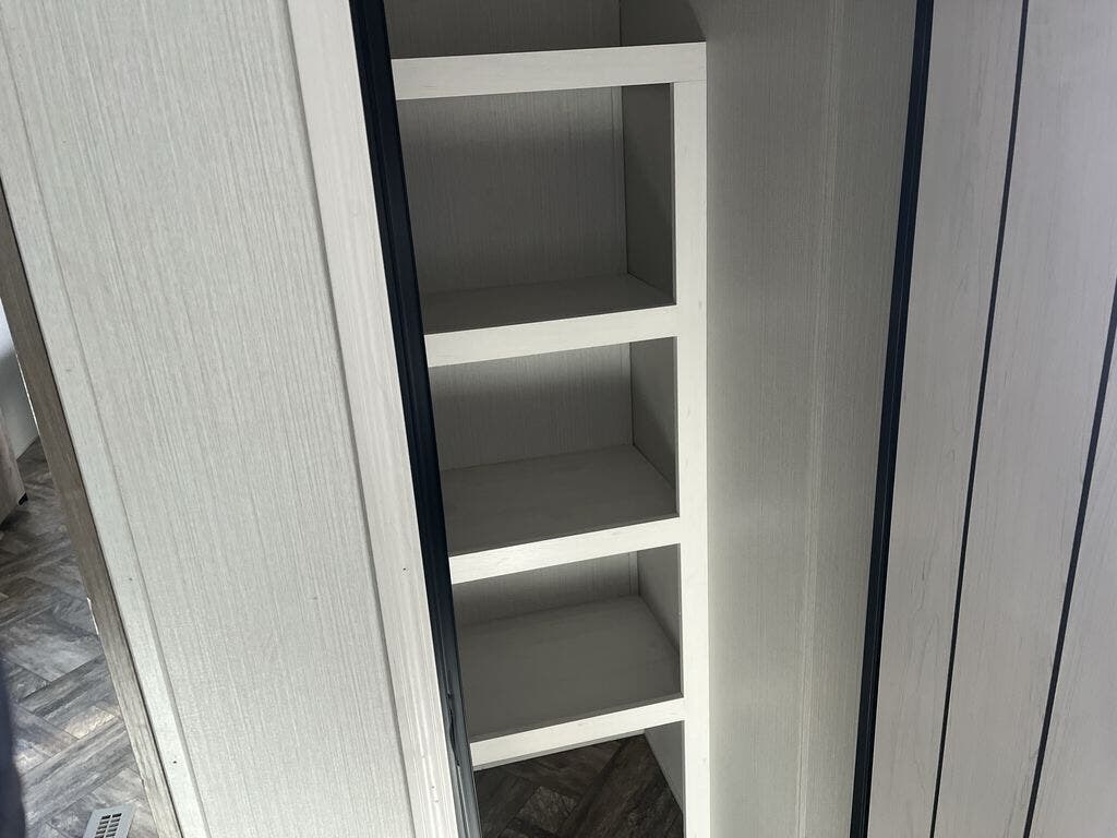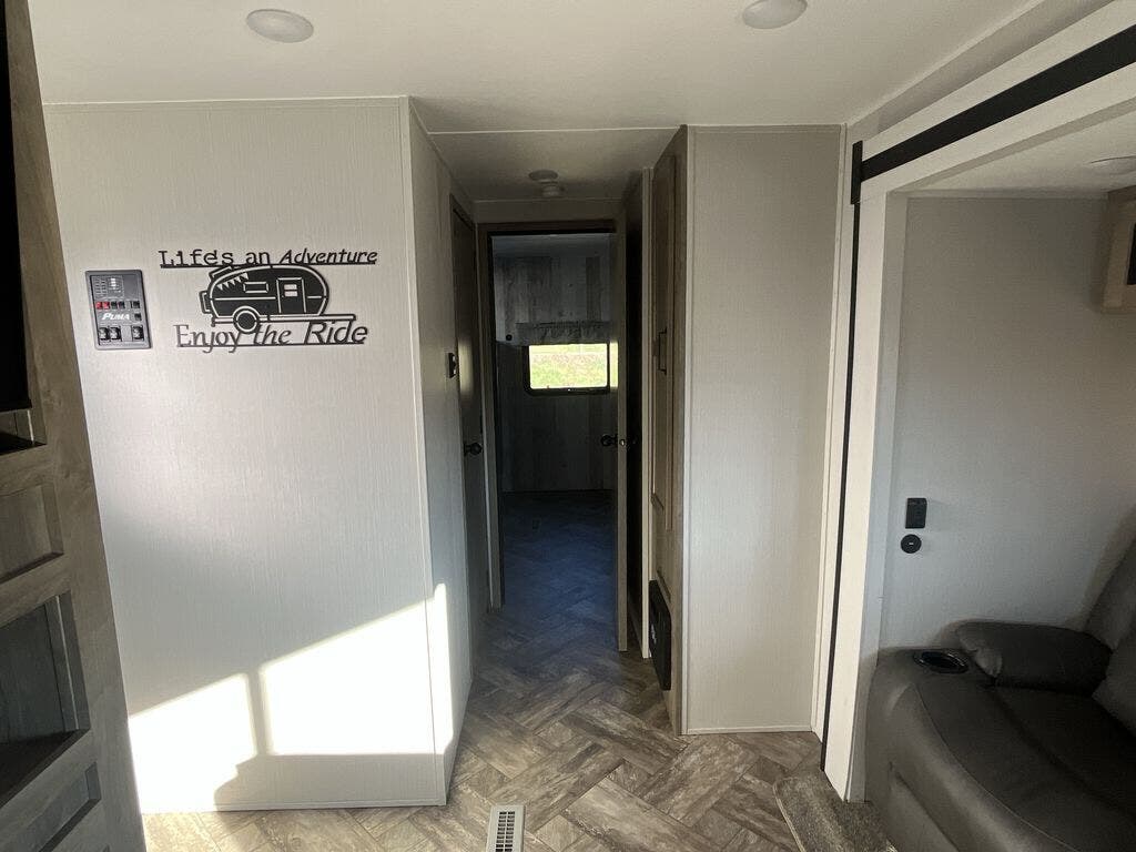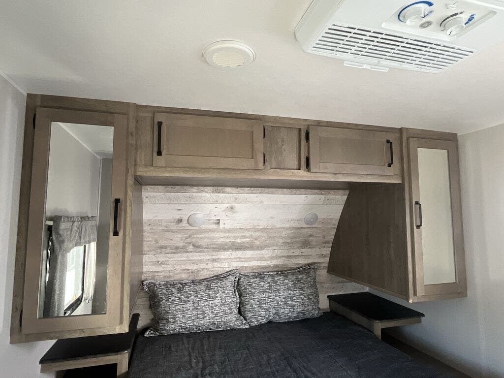 The kids will love having their own rear private bunkhouse in this travel trailer! Inside the bunkhouse is a 38" x 76" bunk above an entertainment center, a closet, and a 32" x 69" bunk above a jiffy sofa slide. The full bathroom with a 34" x 34" radius shower is just outside the bunkhouse for them to easily access it at night. They can even invite a friend or two to tag along and sleep on the sofa and U-shaped dinette once converted. Behind the entertainment center is a closet/pantry to keep your favorite snacks and the kitchen has an 11 cu. ft. stainless steel refrigerator to keep your beverages cold. When you're ready to wind down your nights, head to the front private bedroom and relax on the queen bed with shirt closets and nightstands on either side of it, plus it has one of the dual entry doors to the unit! This model also includes two outside kitchen options if you enjoy cooking in the fresh outdoors!