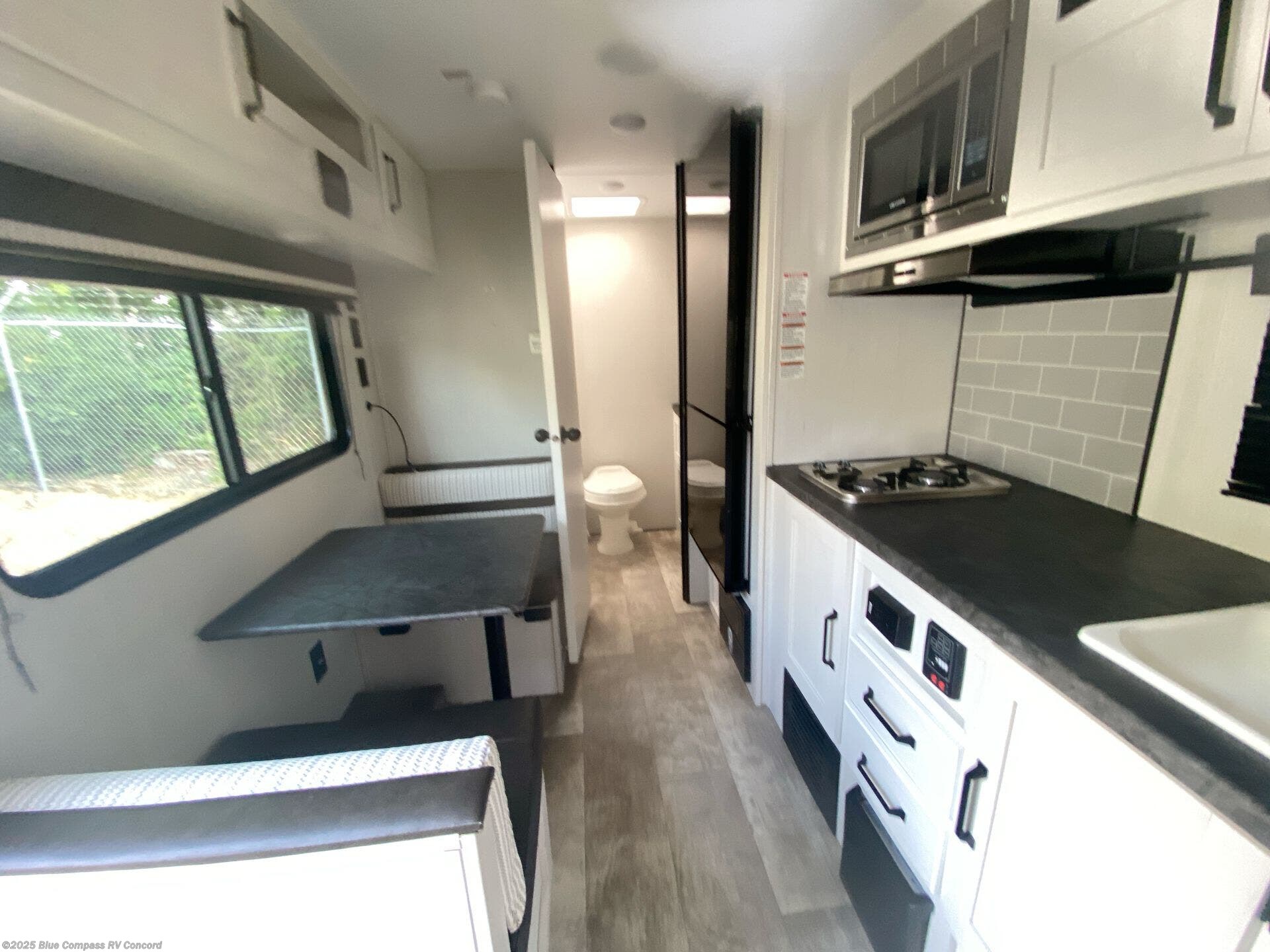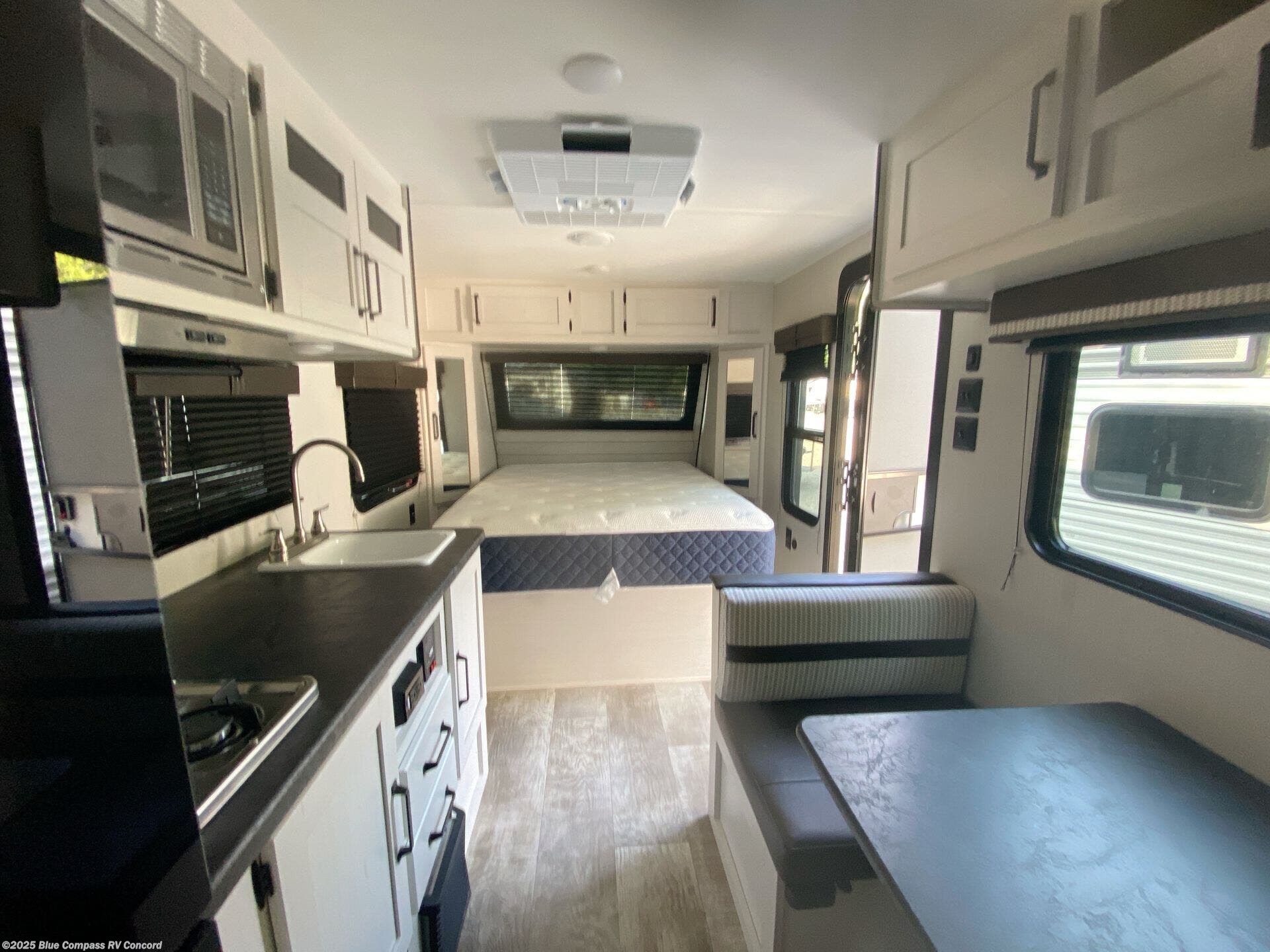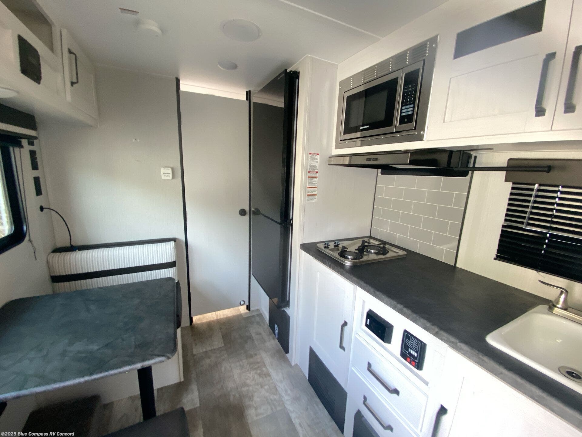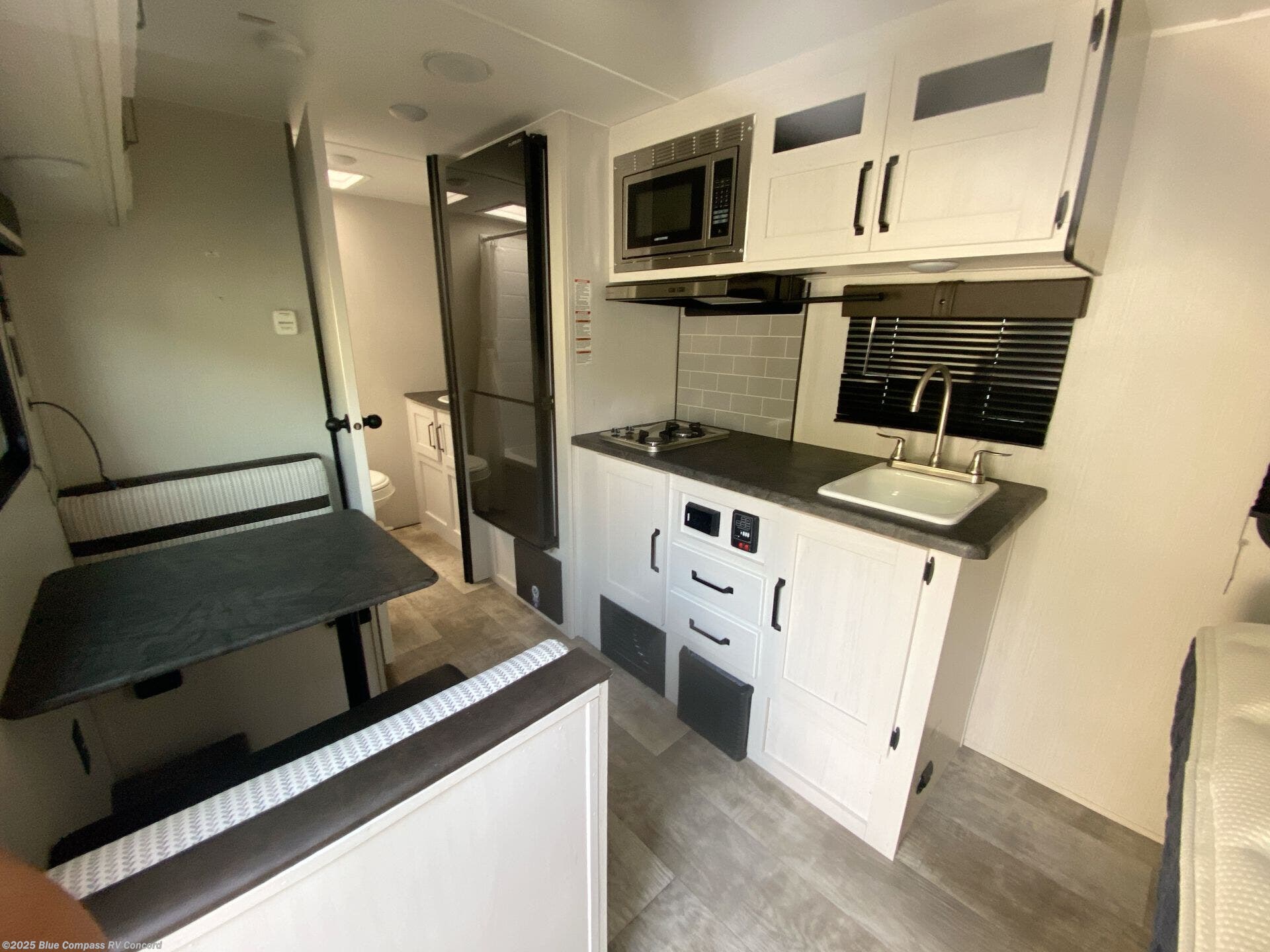 You are going to love this trailer with its rear full bathroom and front walk-around RV queen bed. This is the perfect couple's trailer or smaller family get-away! You will find storage on each side of the bed for your clothing and overhead storage for blankets and such. The booth dinette for two also offers overhead storage for your dry goods, plates and games. The kitchen provides a stainless steel microwave, two-burner cooktop and a 12V refrigerator. And the reason you might have purchased this trailer is the rear full bathroom that offers everything you need and a spacious room to change in.