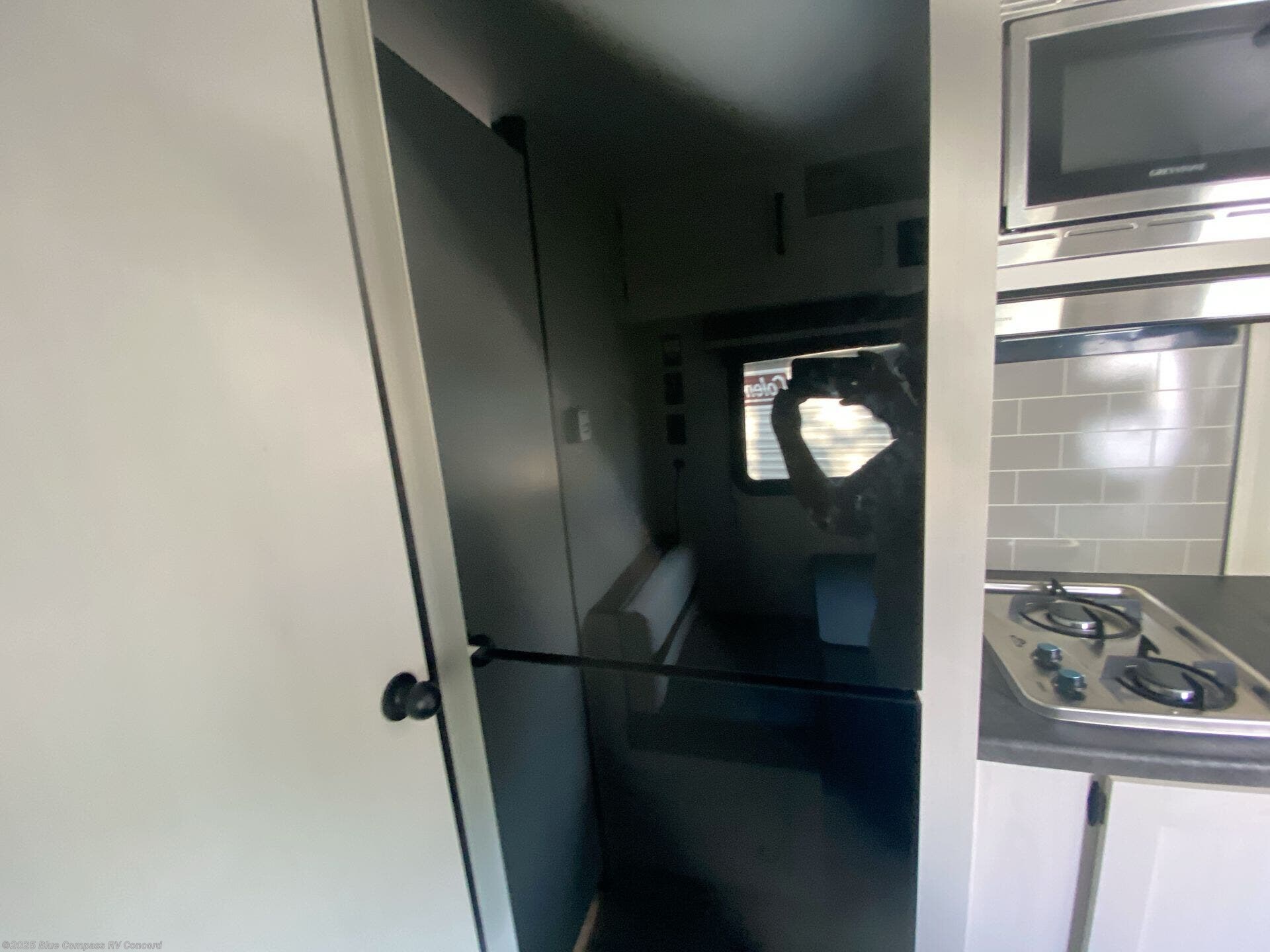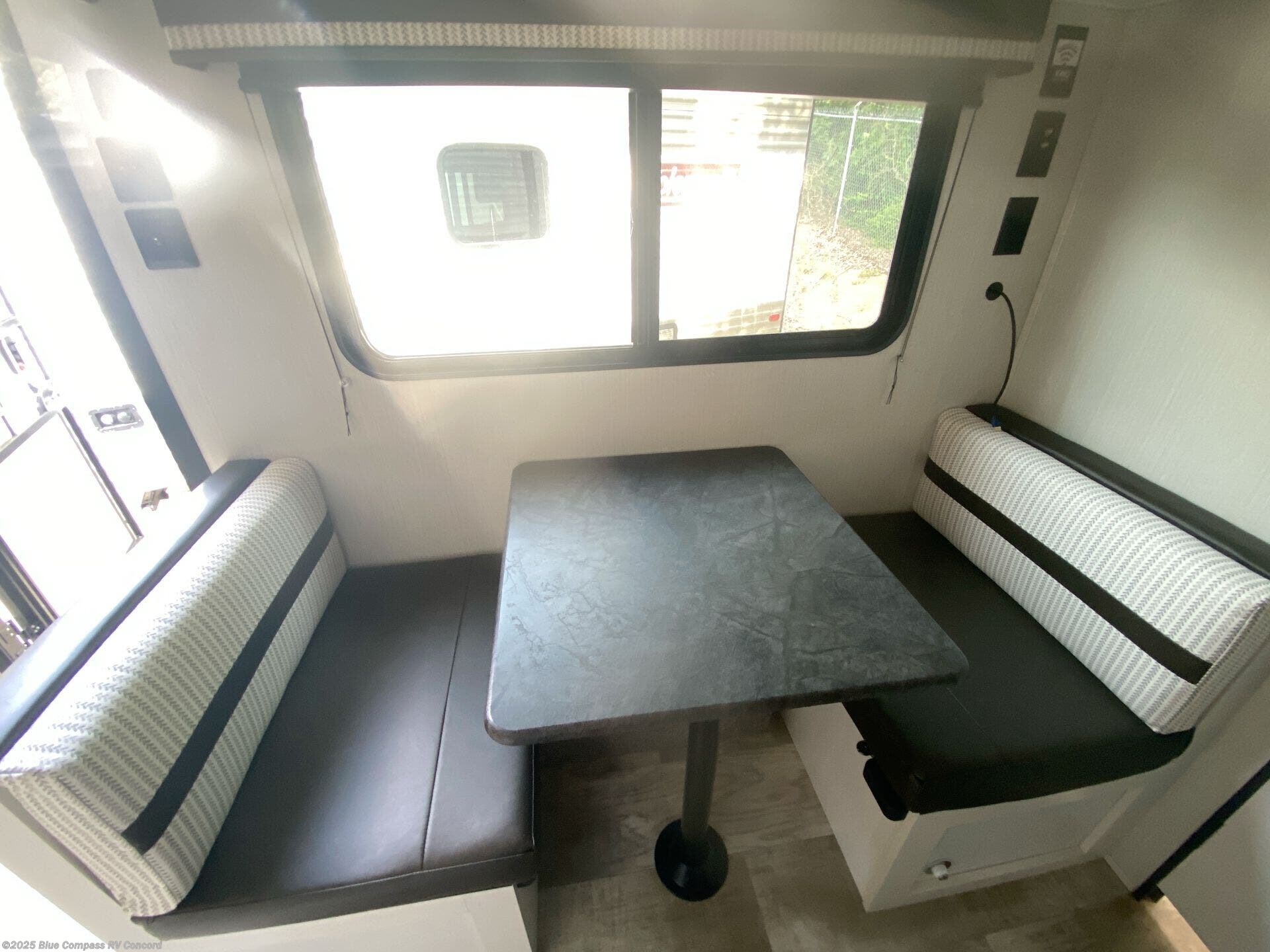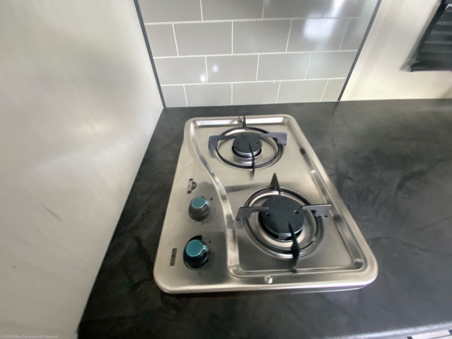 You are going to love this trailer with its rear full bathroom and front walk-around RV queen bed. This is the perfect couple's trailer or smaller family get-away! You will find storage on each side of the bed for your clothing and overhead storage for blankets and such. The booth dinette for two also offers overhead storage for your dry goods, plates and games. The kitchen provides a stainless steel microwave, two-burner cooktop and a 12V refrigerator. And the reason you might have purchased this trailer is the rear full bathroom that offers everything you need and a spacious room to change in.